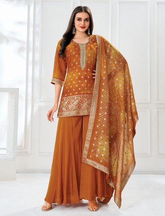 Blending tradition with modern style, this orange organza palazzo suit features delicate zari and resham detailing. A round neckline and half sleeves add to its festive charm, while the coordinating palazzo and dupatta make it a perfect celebration ensemble.