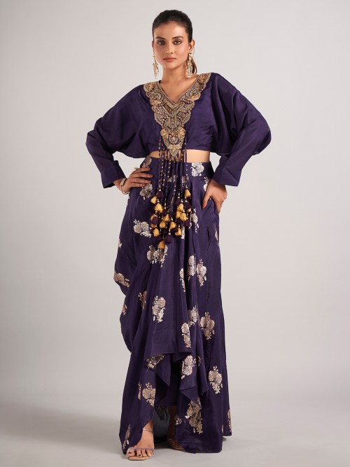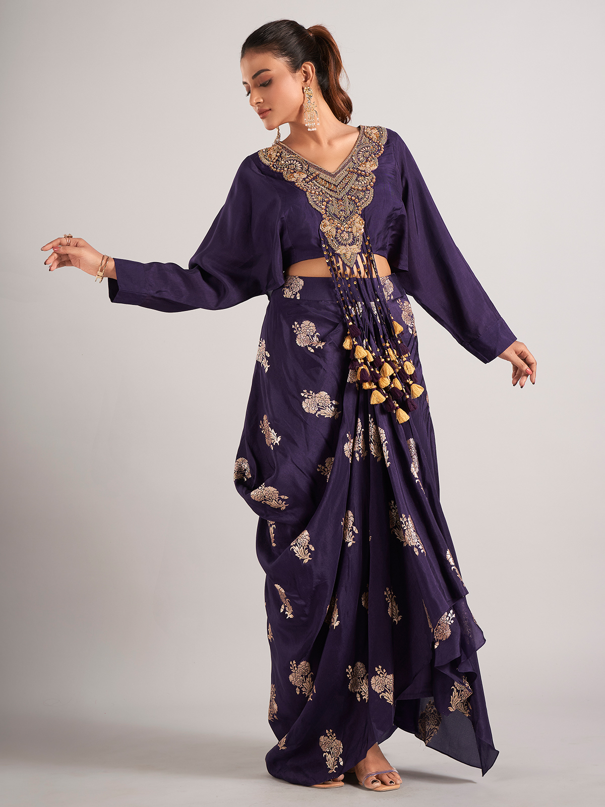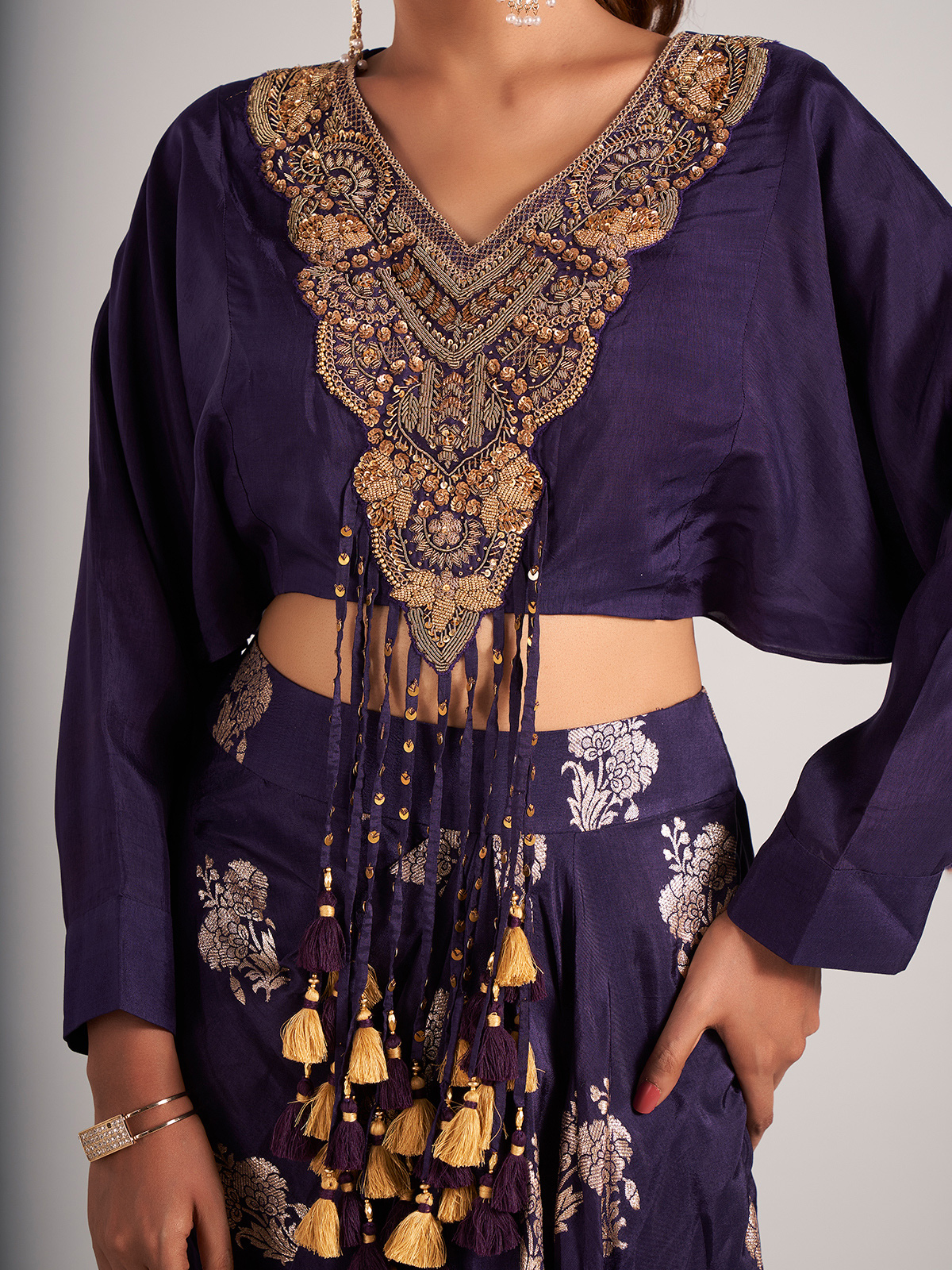 Make a sophisticated statement with this stunning purple silk Indo-Western suit, perfect for festive and formal occasions. The ensemble is exquisitely embellished with sequins, beads, pearls, zari, and zardosi work, adding a luxurious touch of opulence. Featuring a flattering V-neckline and full sleeves, this outfit effortlessly blends traditional artistry with contemporary style.