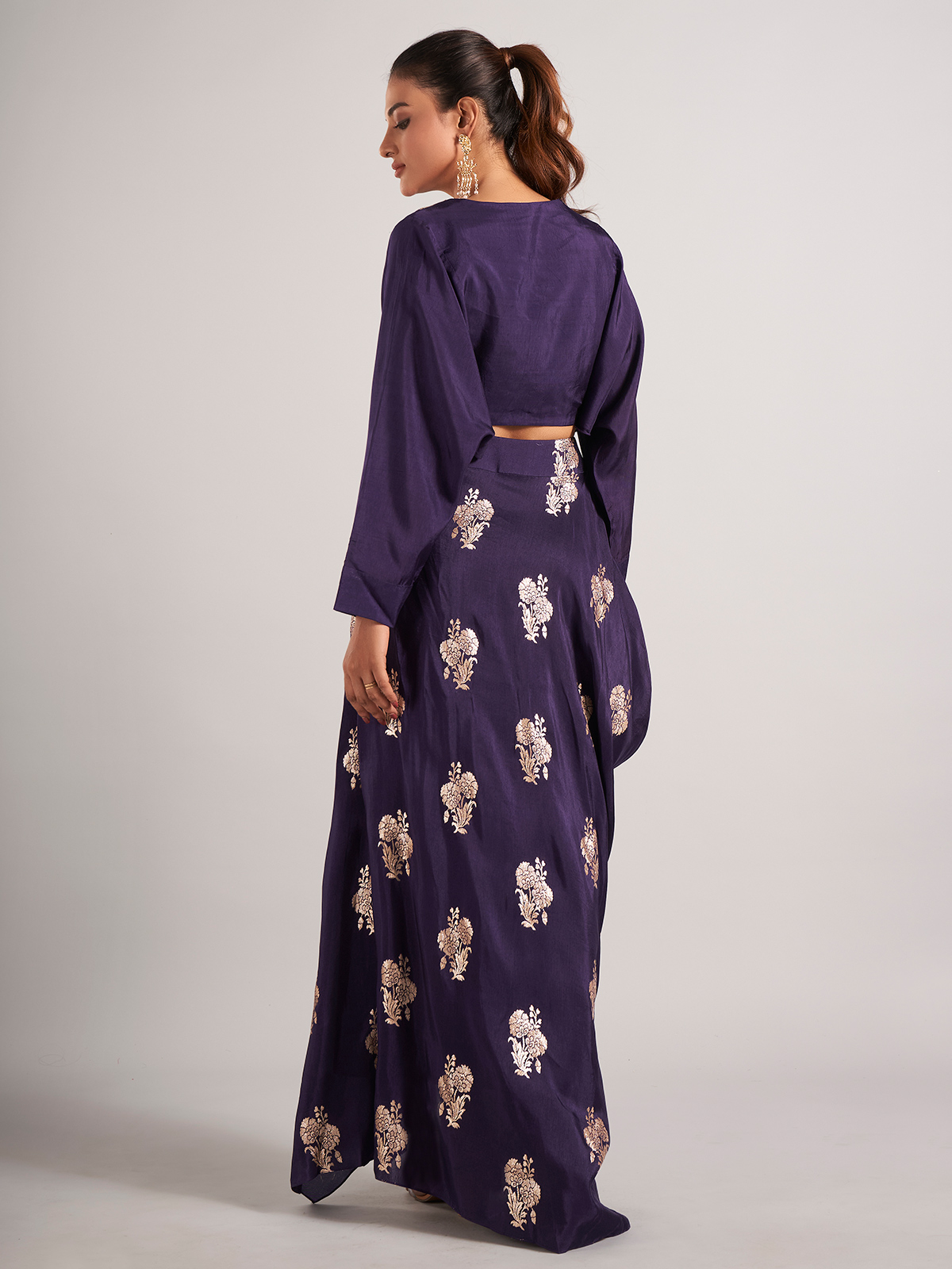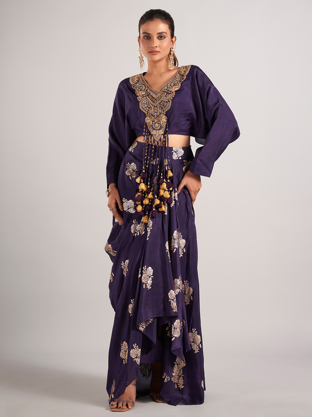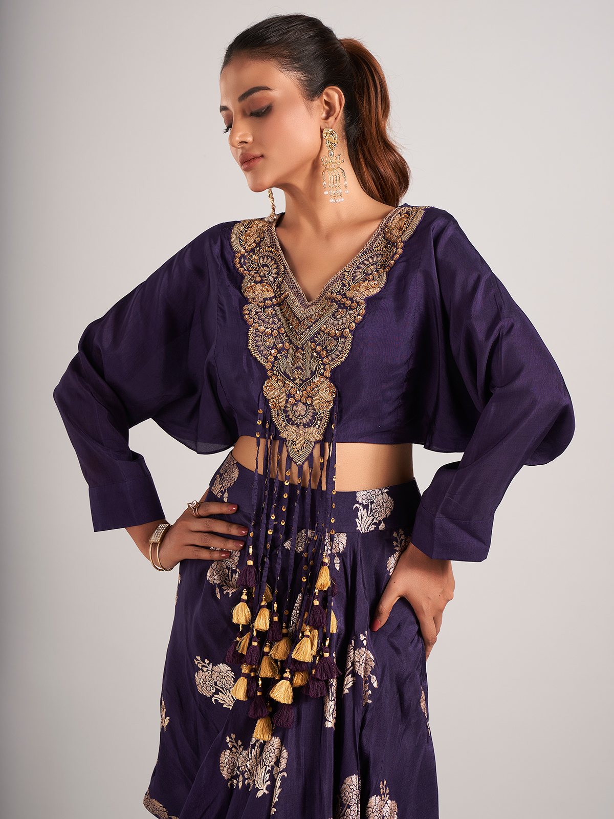 Make a sophisticated statement with this stunning purple silk Indo-Western suit, perfect for festive and formal occasions. The ensemble is exquisitely embellished with sequins, beads, pearls, zari, and zardosi work, adding a luxurious touch of opulence. Featuring a flattering V-neckline and full sleeves, this outfit effortlessly blends traditional artistry with contemporary style.