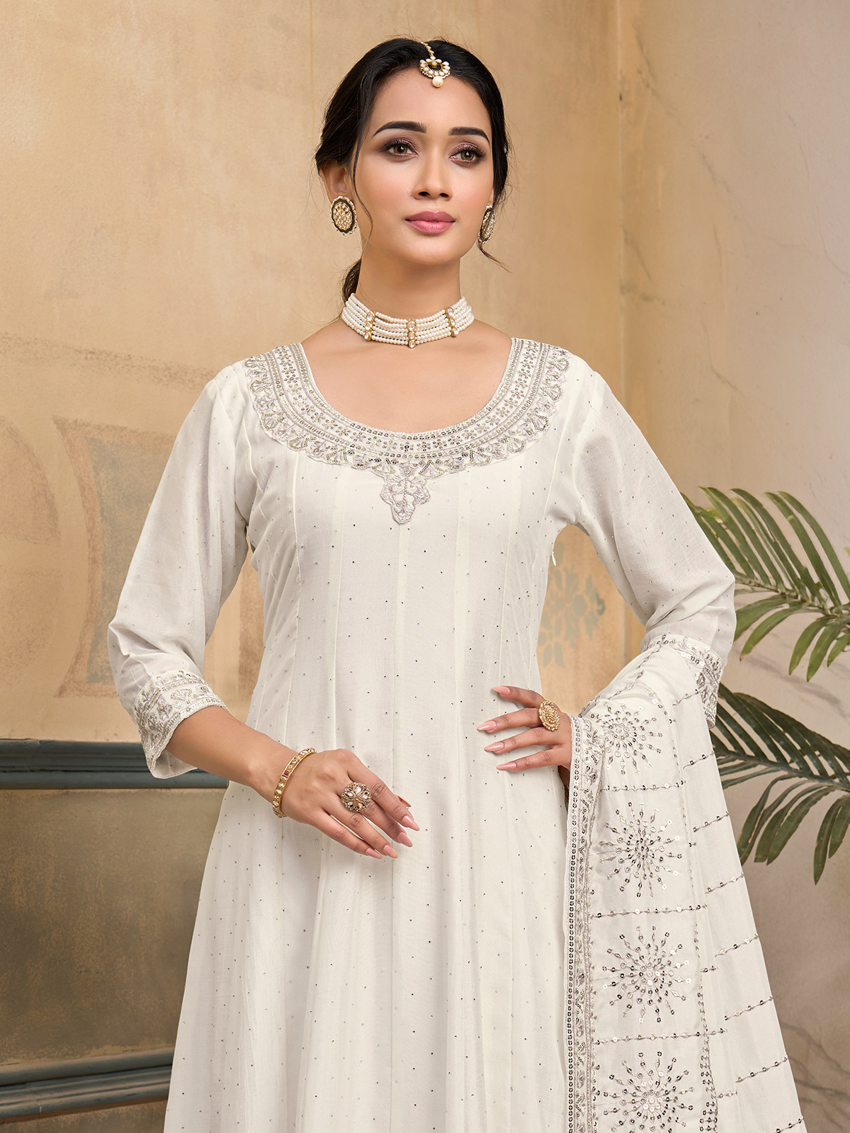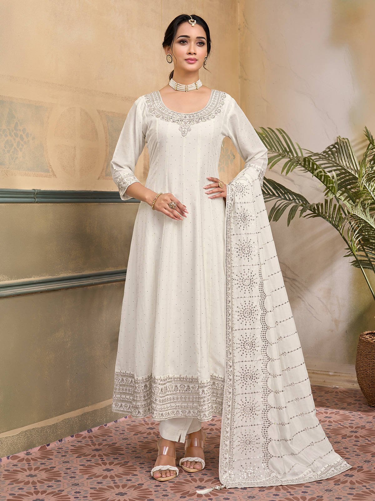 Ethereal white tones define the beauty of this chiffon silk anarkali salwar suit designed for grand celebrations. The kurti features a classic round neckline with elegant quarter sleeves. Adorned with embroidery, stone and sequin embellishments that add radiant charm. Styled with comfortable pants and a flowing dupatta. The ensemble creates a regal and graceful festive silhouette.