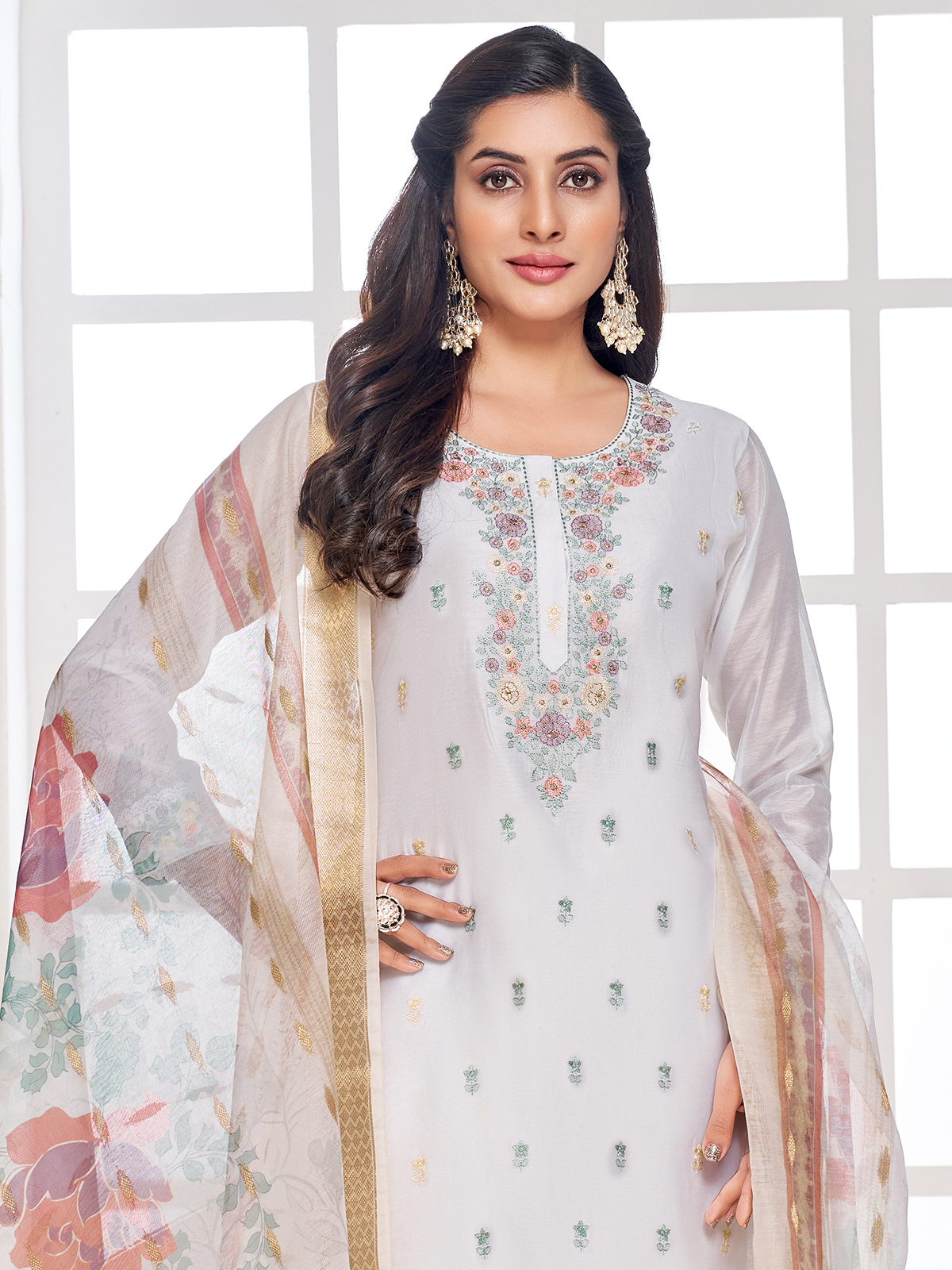 In pristine white cotton silk, this straight-cut suit radiates purity and charm through its fine embroidery and resham work. The round neckline and quarter sleeves enhance its understated elegance. Teamed with pants and a dupatta, it’s a serene choice for wedding and festive soirees.