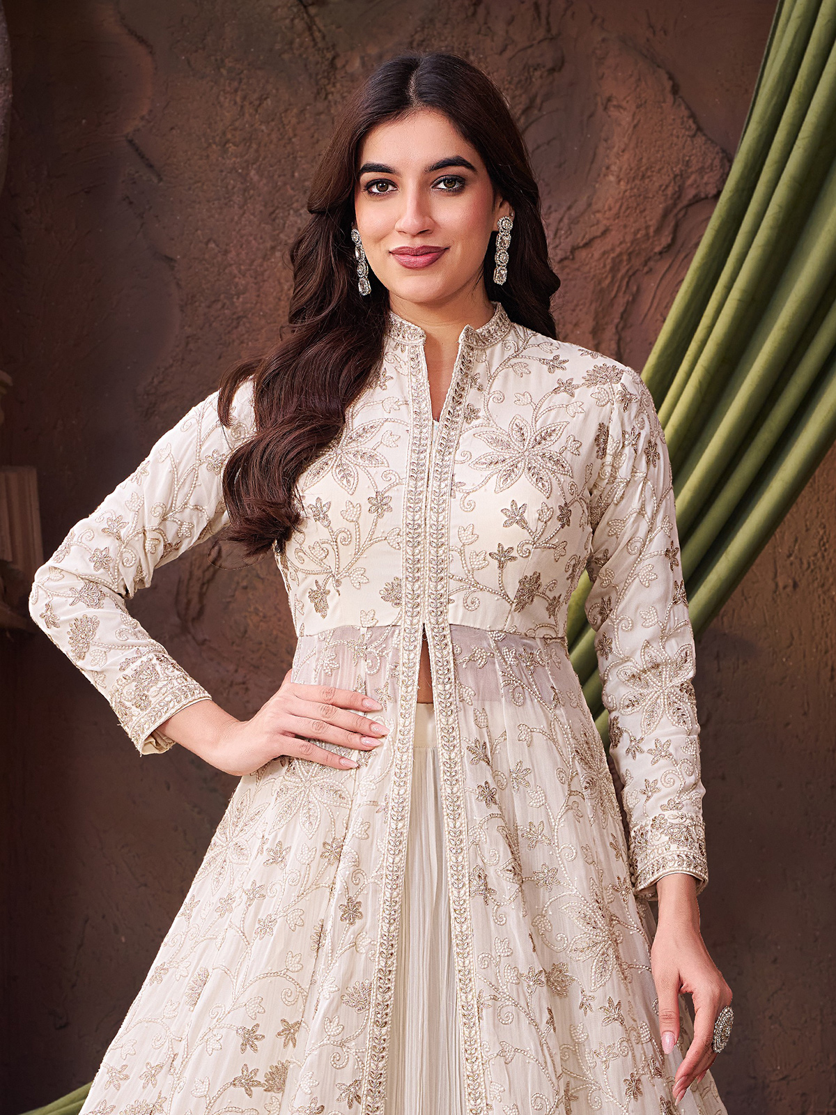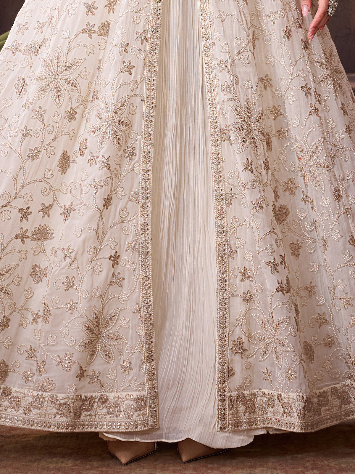 Crafted in luxurious chiffon tissue silk white designer floor length lehenga suit is richly adorned with resham, shimmering sequins, delicate beads and intricate zardosi work. Styled with a stand collar and full sleeves, it creates an elegant, regal silhouette perfect for weddings, receptions and grand festive occasions.