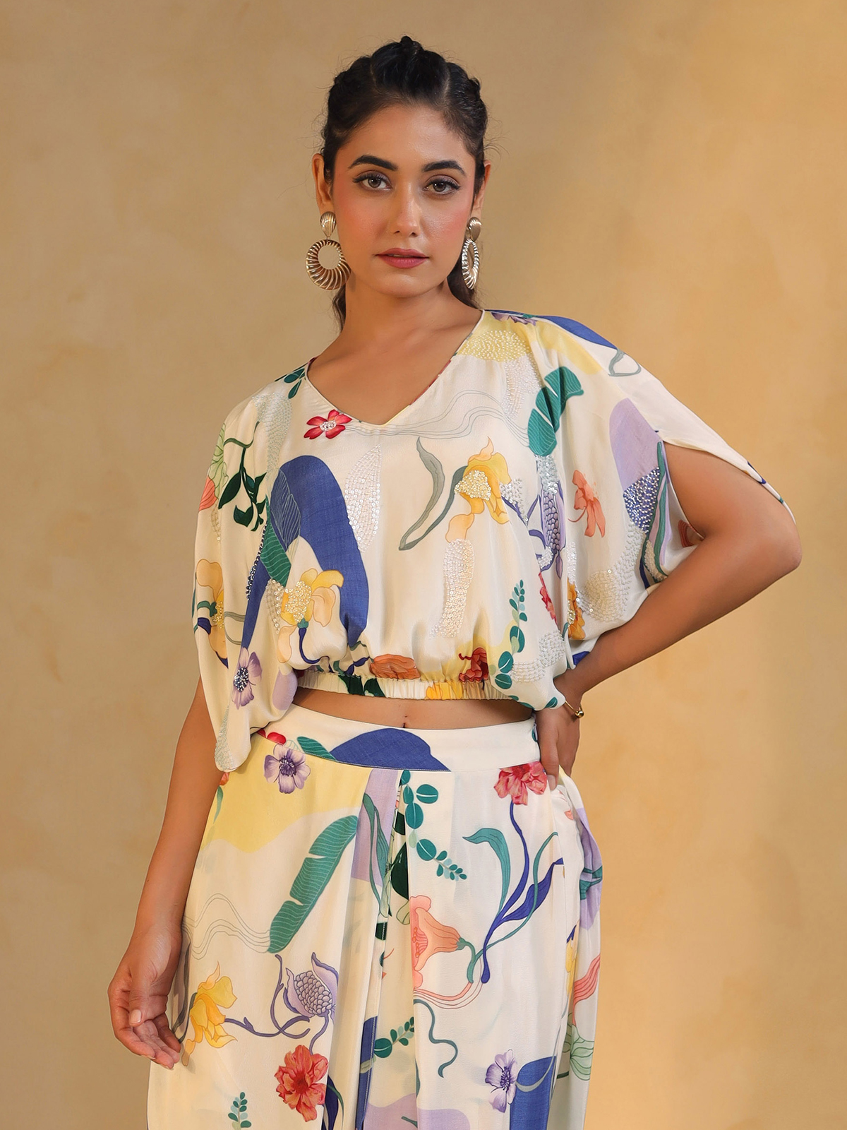 As luminous as moonbeams, this white silk printed dhoti suit dazzles with sequins and beads that gleam in soft elegance. The V neck silhouette enhances its refined beauty, making it ideal for festive soirées and graceful gatherings where modern artistry meets timeless tradition.