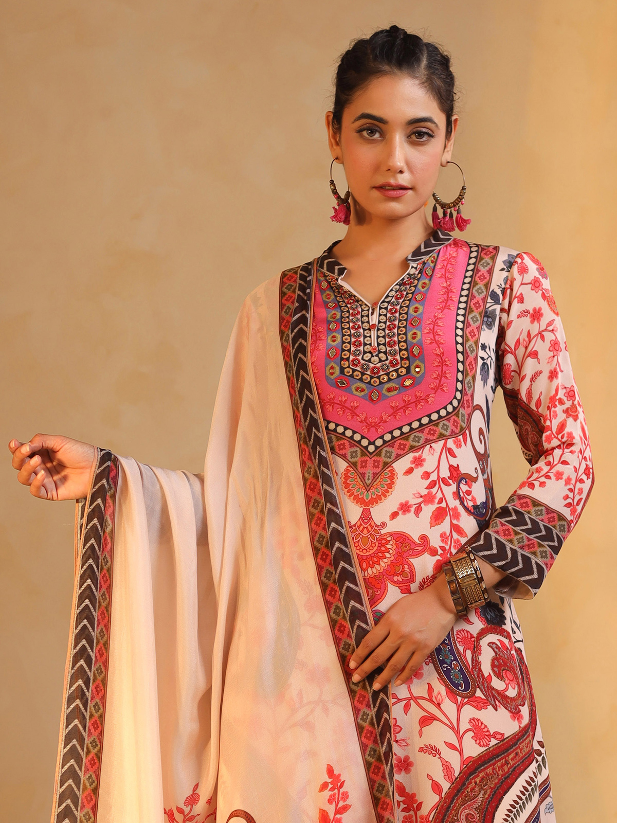 This white silk printed salwar suit is beautifully decorated with sequins, thread, mirror, and bead embellishments. Designed with a stand neckline and quarter sleeves, it comes with pant and dupatta. A graceful festive choice that balances brilliance with serene appeal.