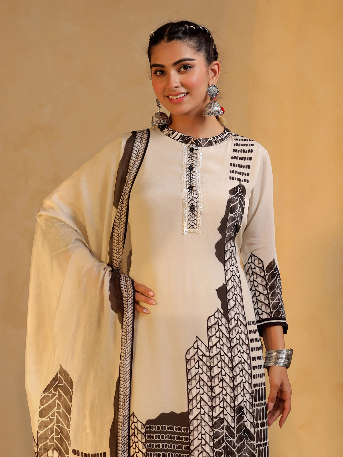 This white silk printed salwar suit sparkles with sequins. Designed with a stand neckline and quarter sleeves, it comes with pant and dupatta. A serene festive attire that unites tradition with delicate brilliance.