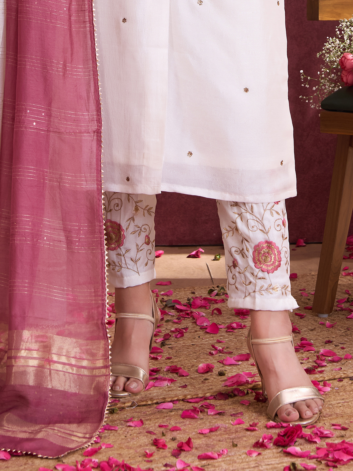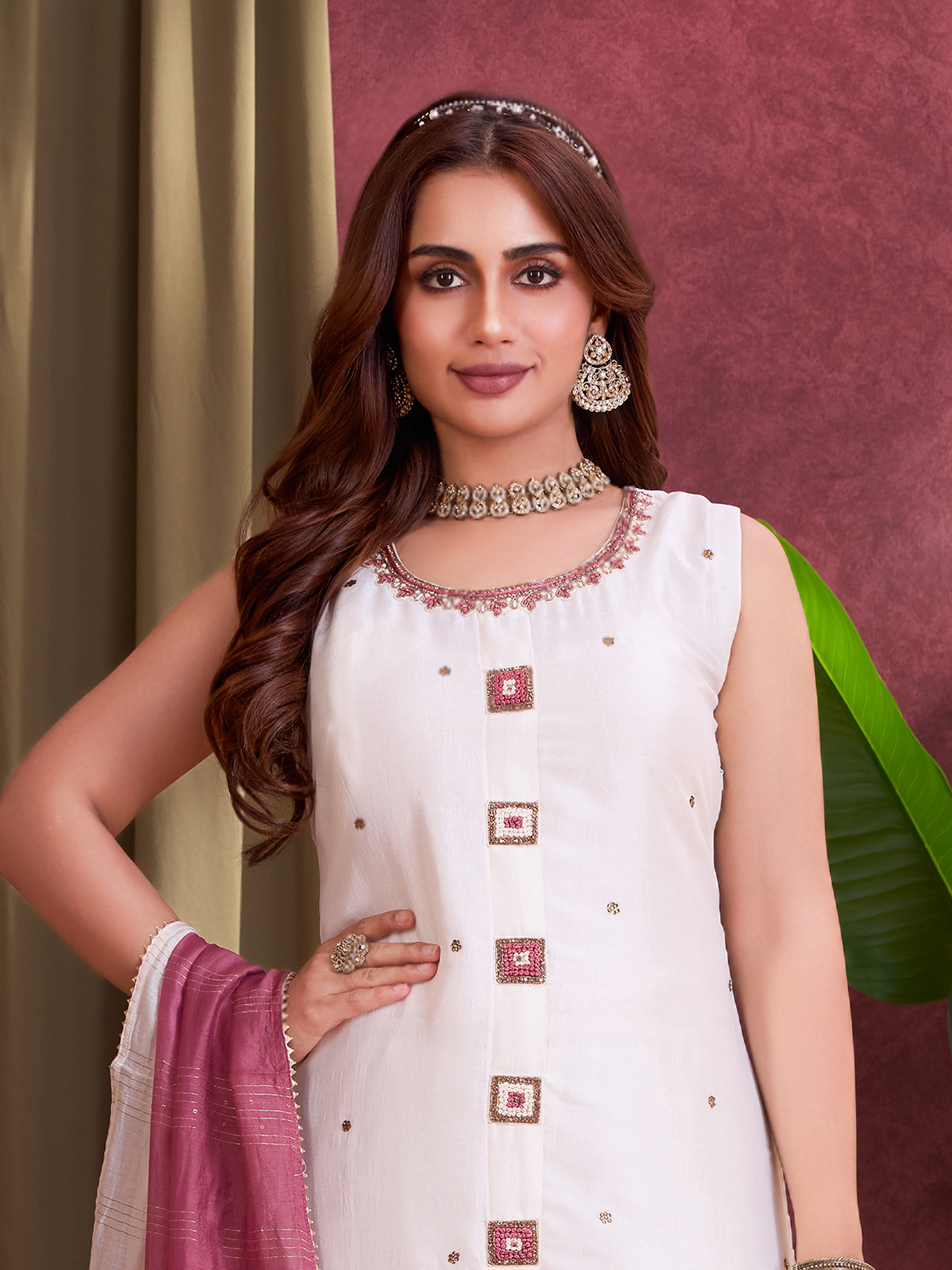 Shine with ethereal elegance in this pristine white silk straight-cut salwar suit, adorned with resham, cutdana, and sequins. The round neckline and sleeveless silhouette create a modern grace, while sleek pants and a pink–white shaded dupatta add soft festive radiance.