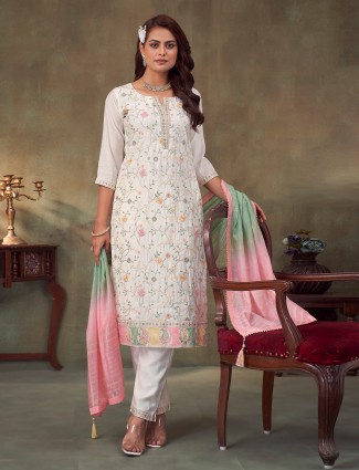 Crisp and elegant, this white silk suit features embroidery and resham work. Quarter sleeves, pants, and a dupatta make it ideal for Rakhi and other ethnic events.