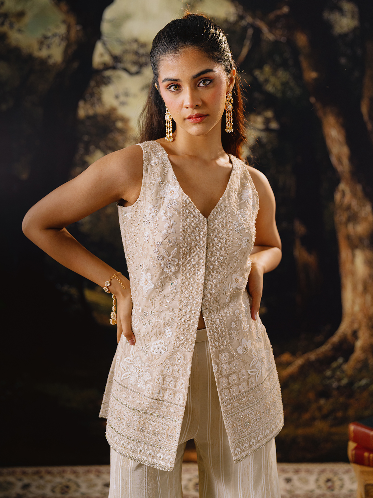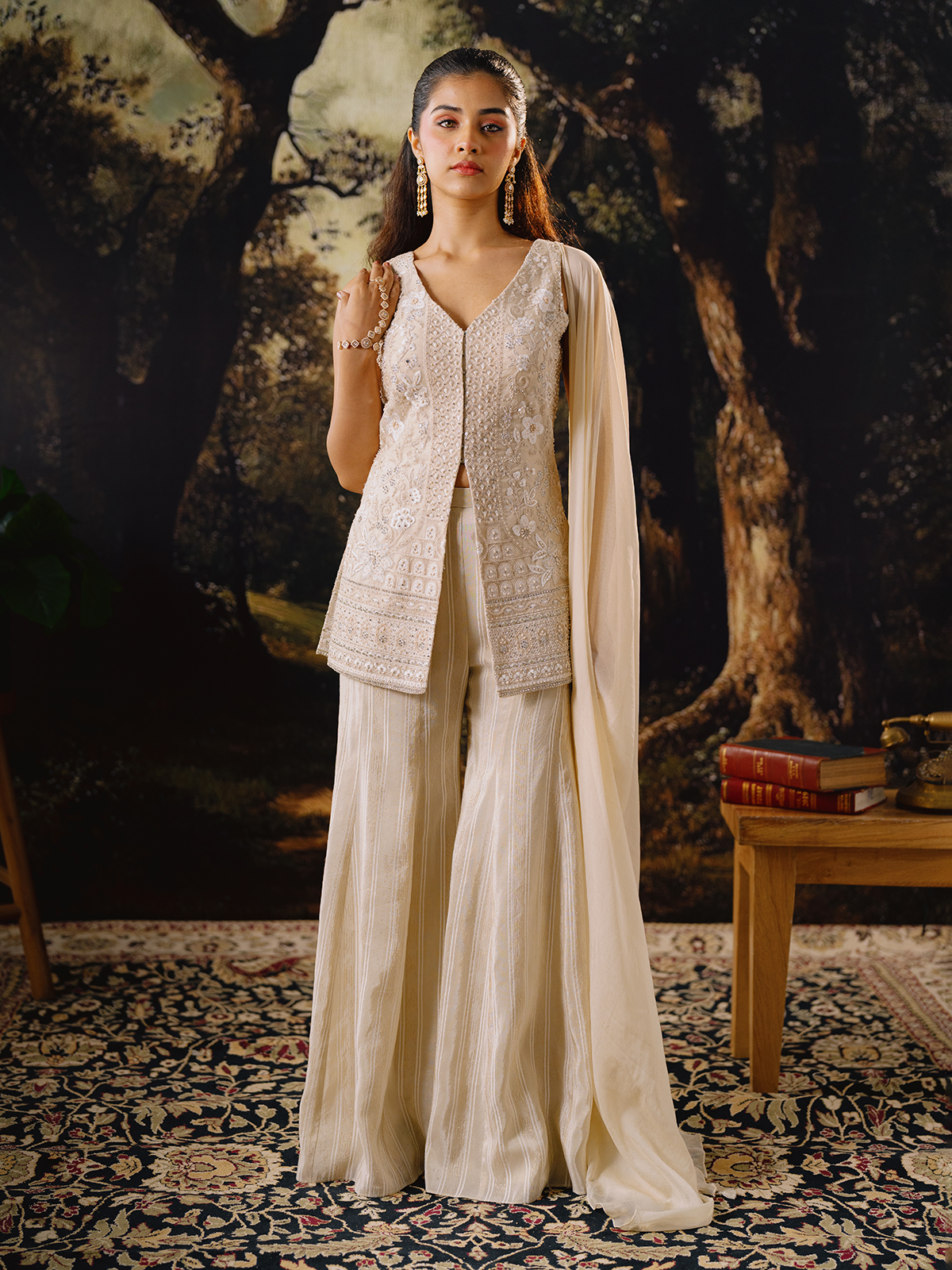 Refined and graceful, this white-toned tissue silk palazzo suit reflects contemporary ethnic charm. The sleeveless V-neck kurti is intricately embellished with thread, sequins, stone, pearls and beads, adding depth and luminous elegance. Styled with a wide-flared palazzo featuring subtle glitter accents and a choker-style dupatta, this ensemble is perfect for festive gatherings, sangeet nights, and wedding celebrations.