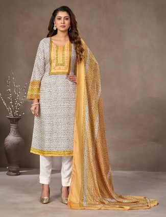 White and yellow silk suit with cheerful prints and subtle aabla-thread detailing. The full sleeves, round neckline, and printed dupatta make it perfect for bright day functions and Diwali festivities.