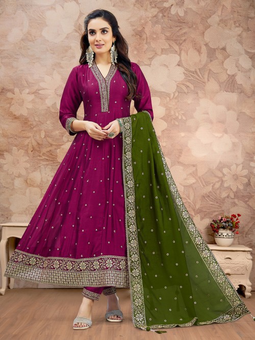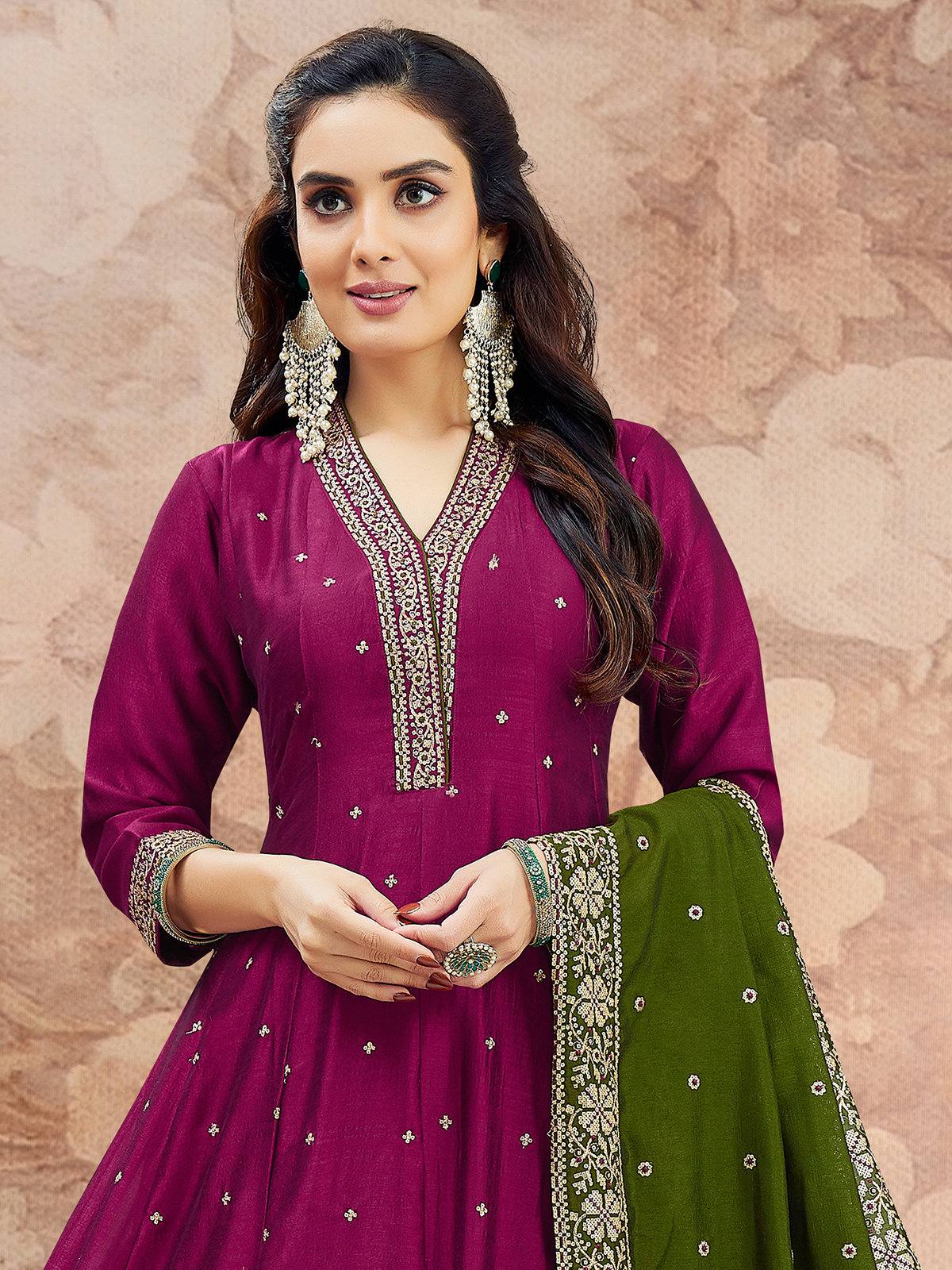 Make a lasting impression with this elegant wine silk salwar suit, detailed with resham and sequins embroidery. The V neckline and quarter sleeves enhance its timeless appeal, while the mehendi green dupatta and matching pants complete the ensemble with a bold touch.