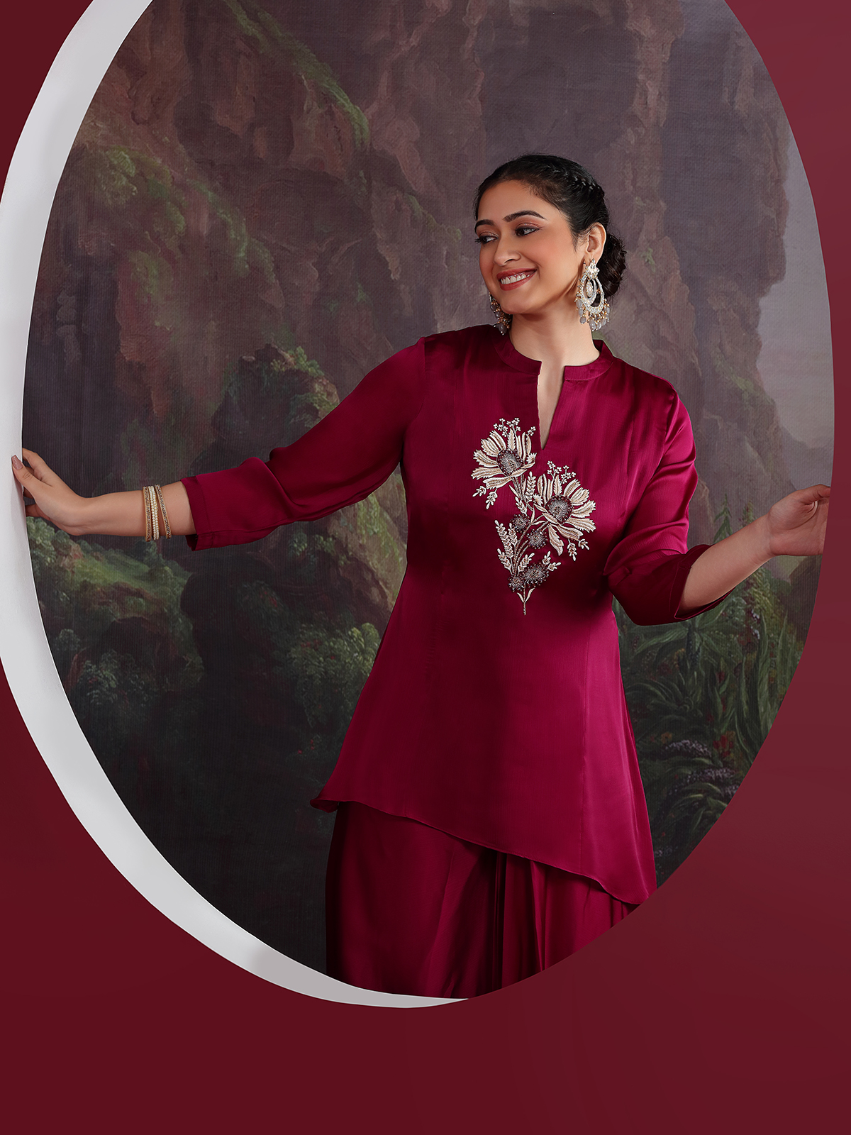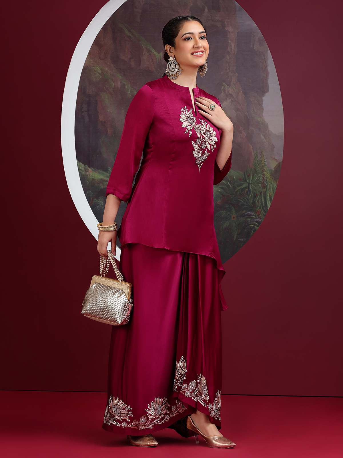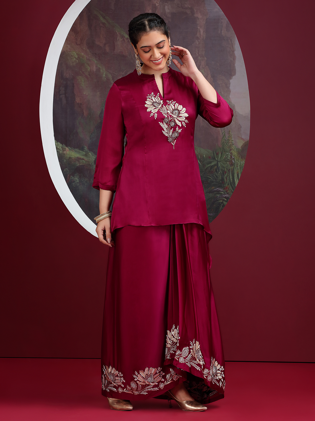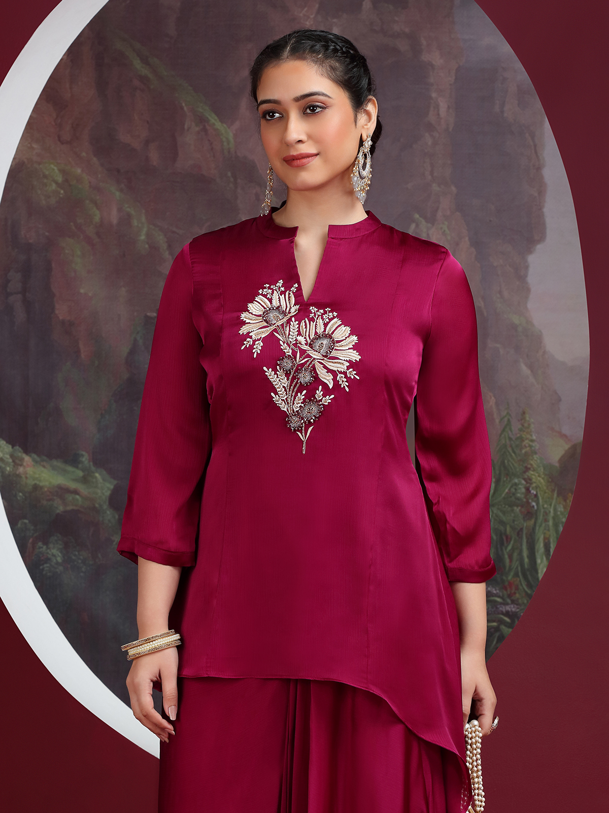Draped in luxurious wine crepe silk, this Indowestern suit showcases refined embroidery enriched with cutdana, sequins and beads. The stand collar pairs beautifully with quarter sleeves for a polished finish. Perfect for receptions, festive gatherings and wedding functions, it exudes a classy contemporary charm.