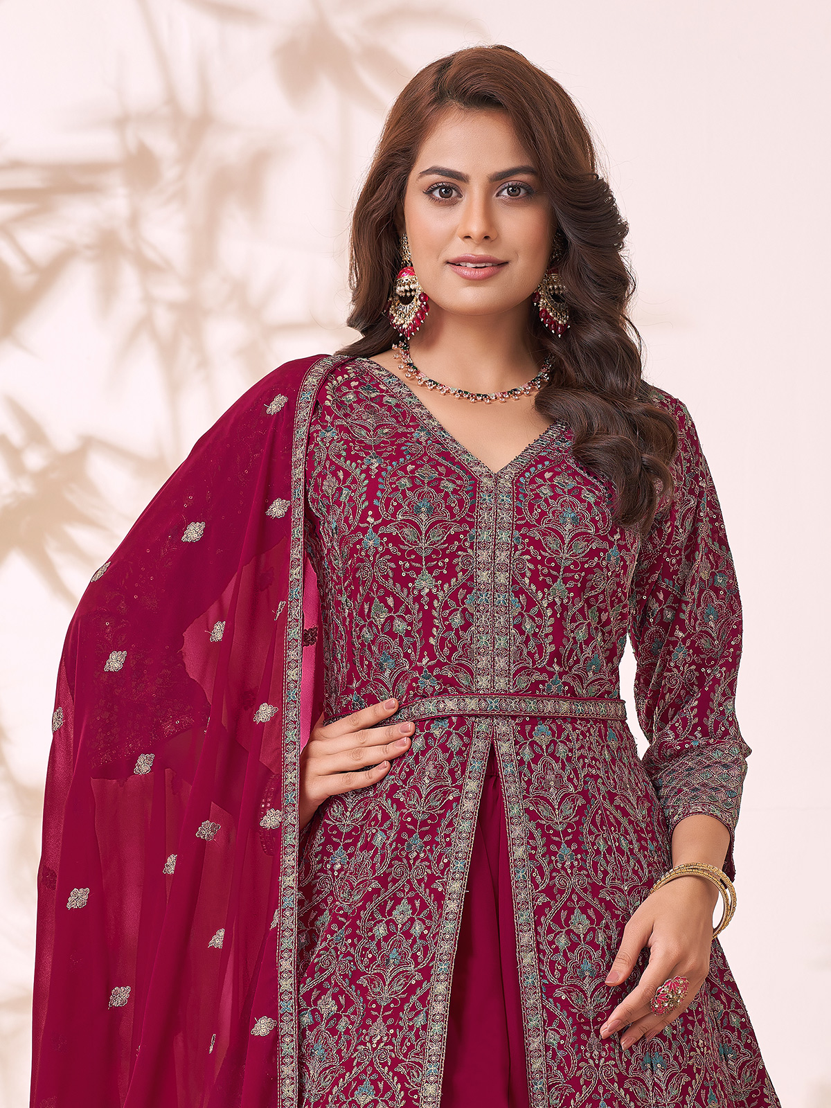 Celebrate in style with this wine georgette anarkali suit, blending Pakistani elegance with festive charm. Adorned with delicate embroidery and sequins, it features a flattering V-neckline and quarter sleeves. Paired with flowing palazzo pants and a coordinating dupatta, it is perfect for weddings and special celebratory occasions.