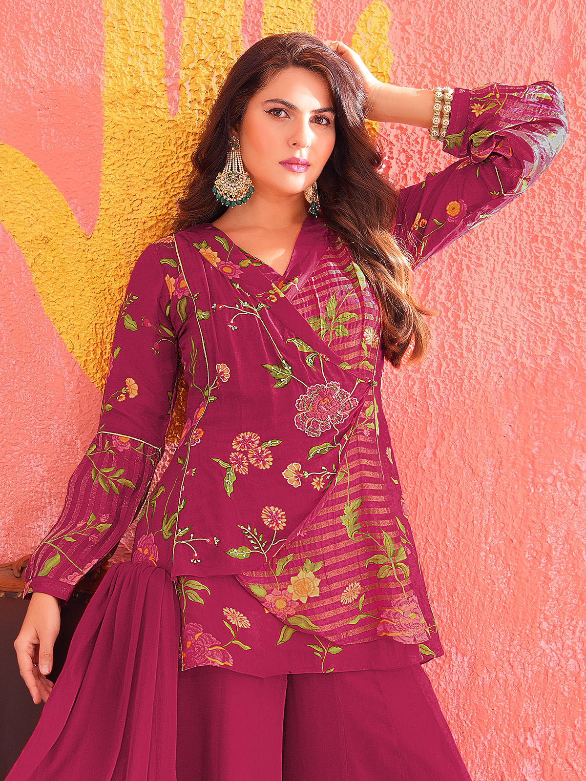 Showcasing a rich wine hue on georgette fabric, this palazzo suit features elegant cutdana, sequin, and thread work over a printed base. With a V neckline, full sleeves, and coordinating dupatta, it balances traditional embroidery with modern sophistication—perfect for festive or formal events.