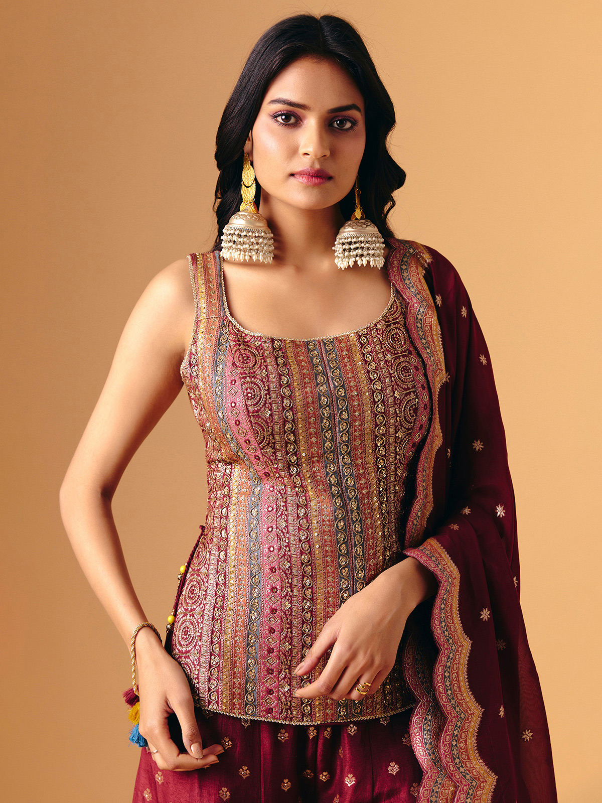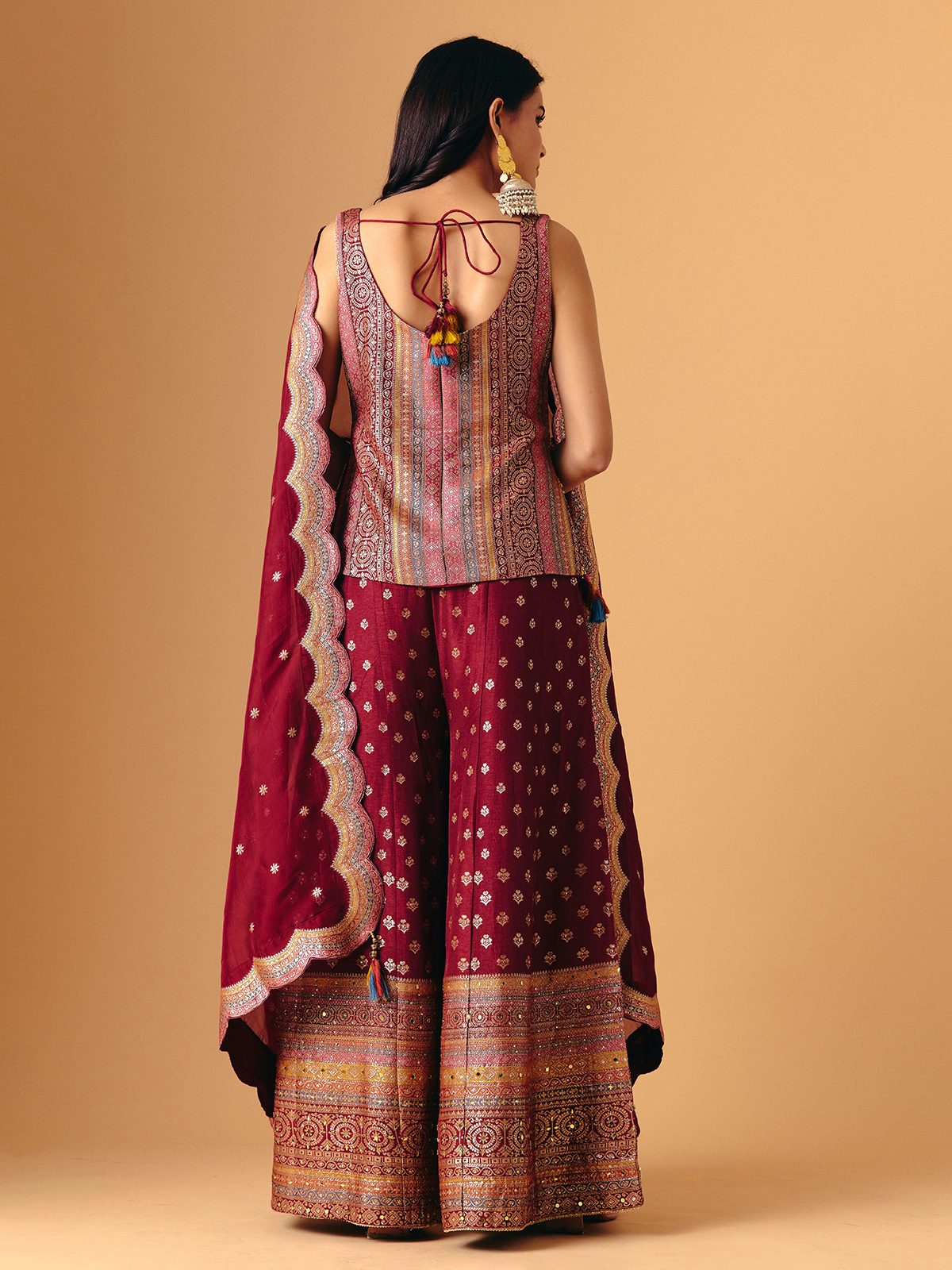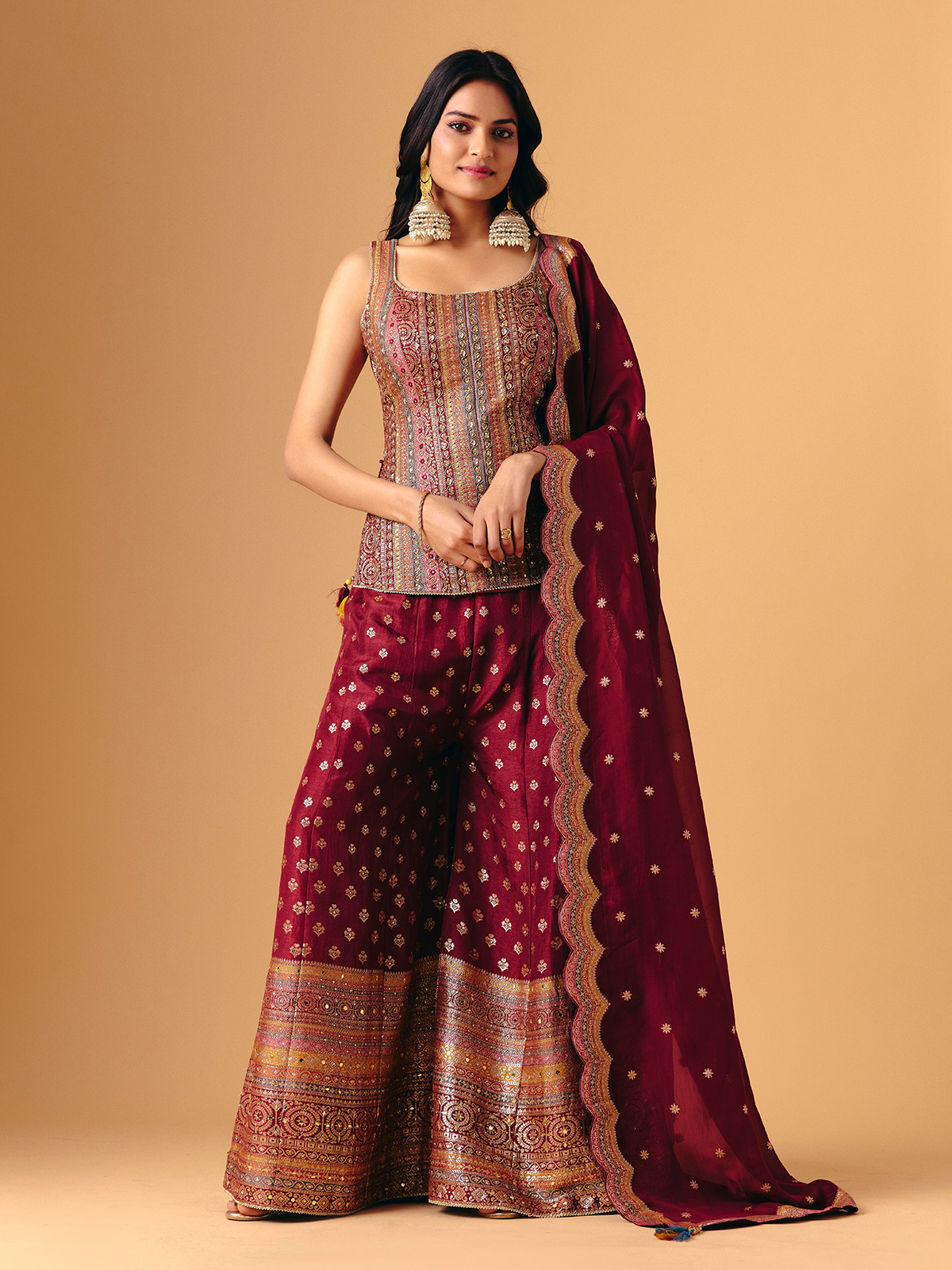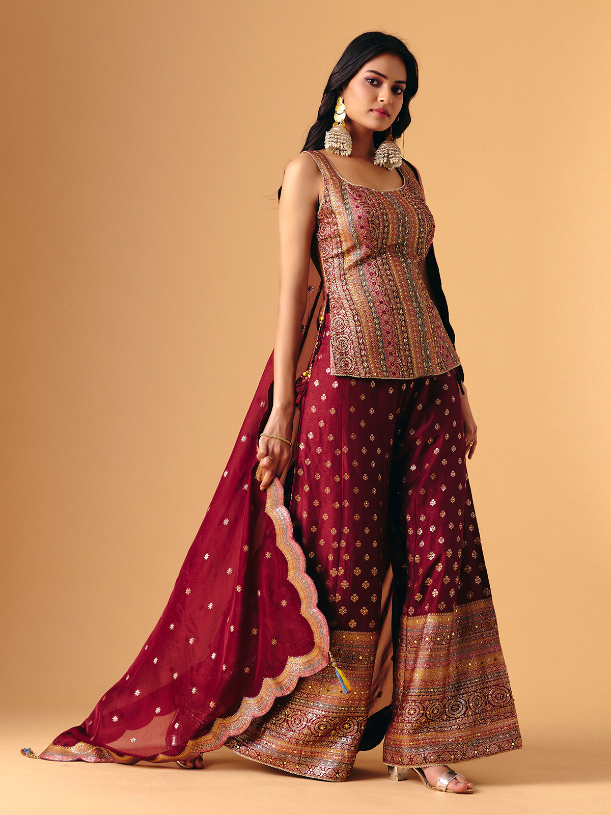 Opulent wine silk forms this sleeveless palazzo, adorned with mirror, zari, sequins, and cutdana detailing. The square neckline introduces bold sophistication, while flowing palazzo bottoms enhance graceful movement. Completed with a matching dupatta, it radiates festive sparkle, refined artistry, and regal elegance for wedding, reception, and sangeet celebrations.