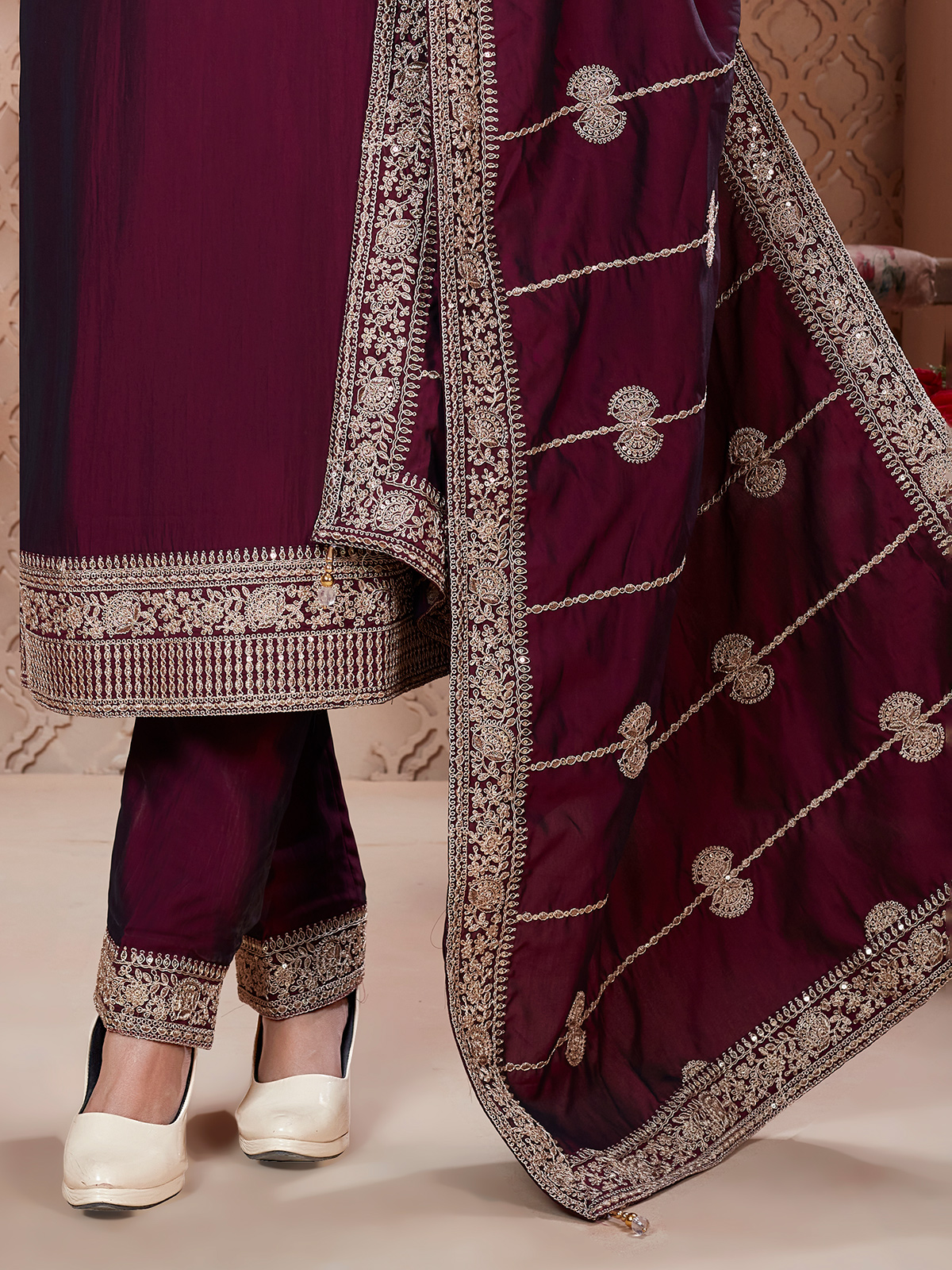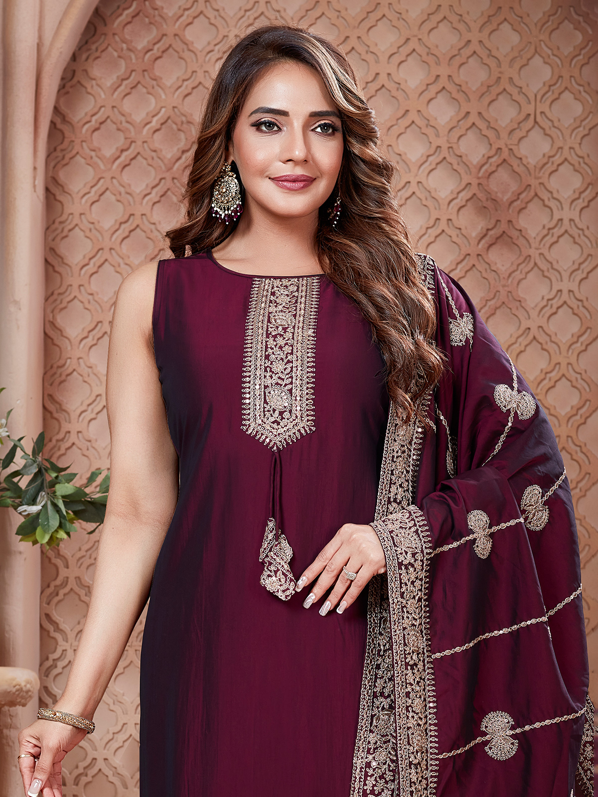 Wine Silk Straight Cut Sleeveless Salwar Suit