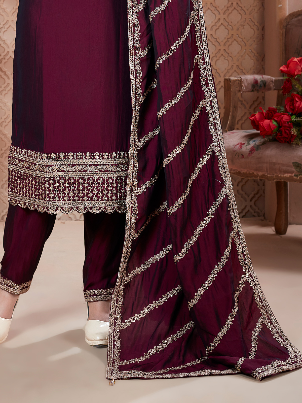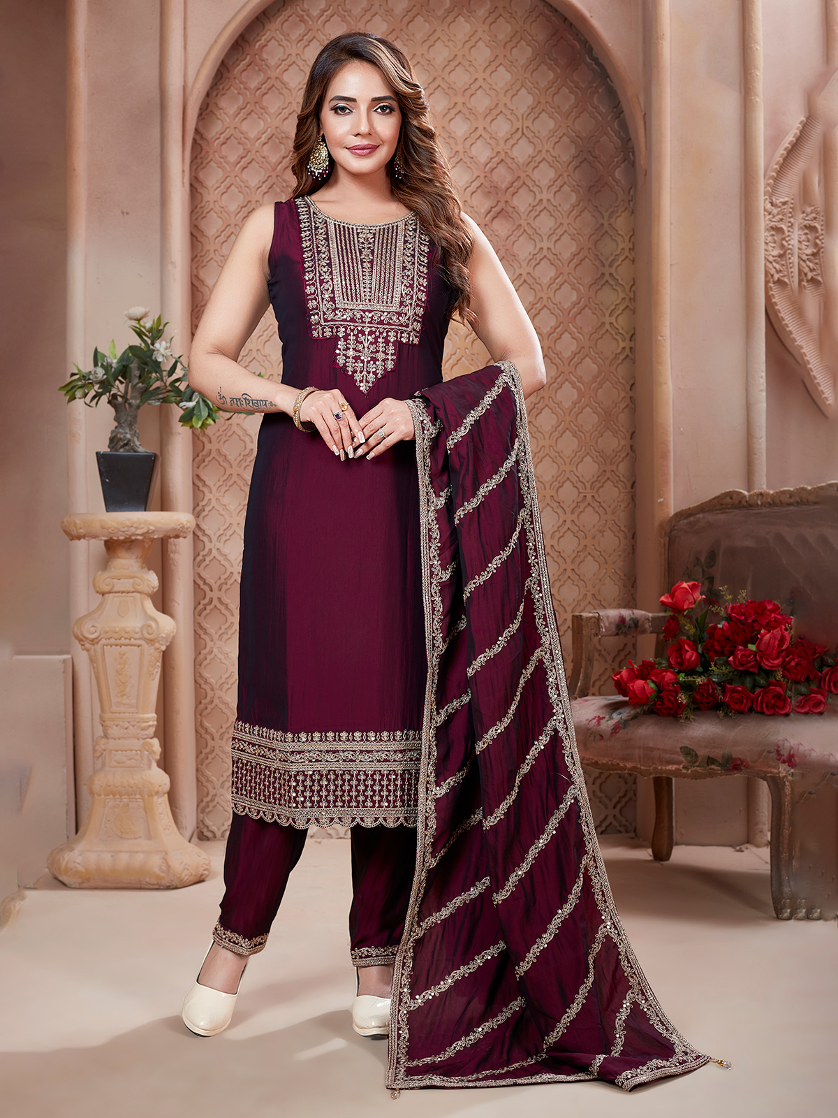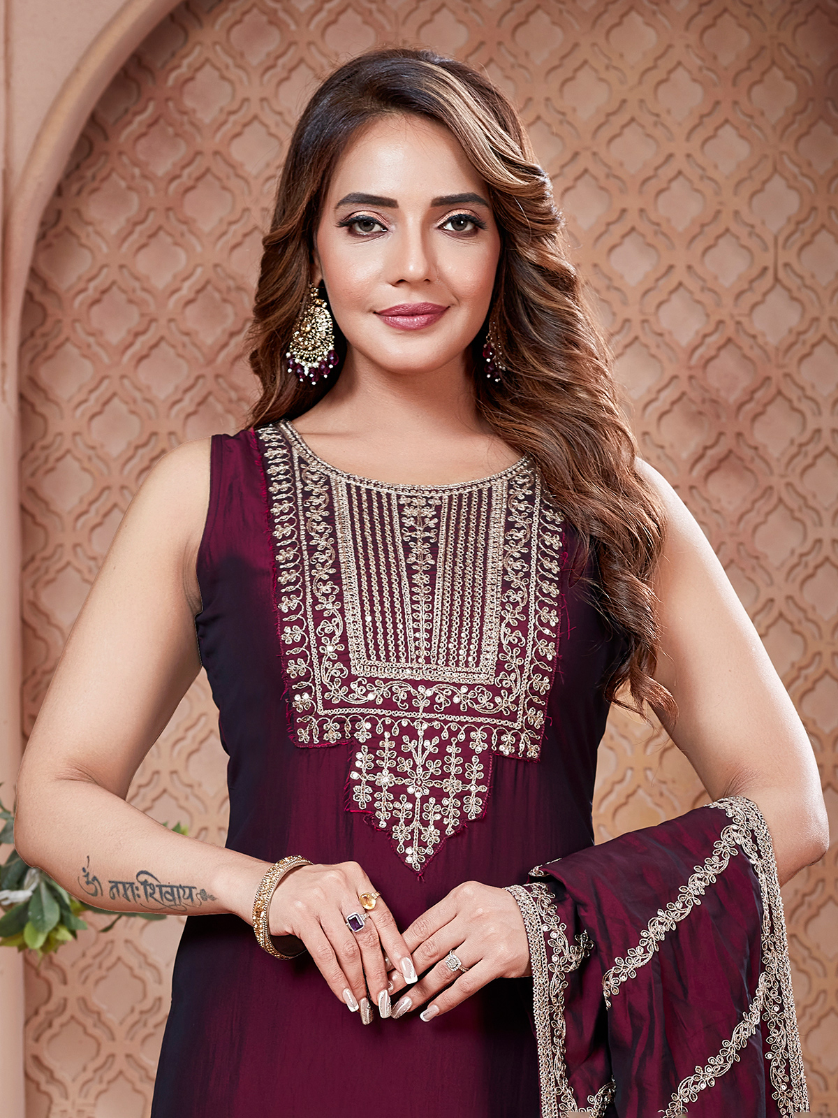 This stunning wine silk salwar suit features resham, thread, and sequins embroidery in a straight silhouette. With a round neck, sleeveless style, matching pants and dupatta—made for festive elegance.