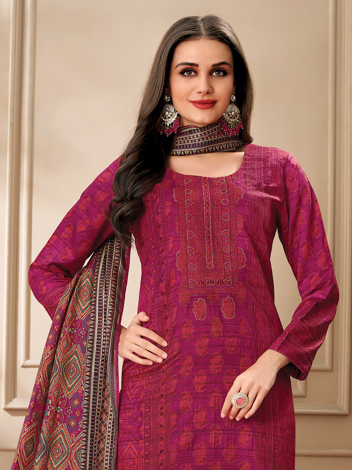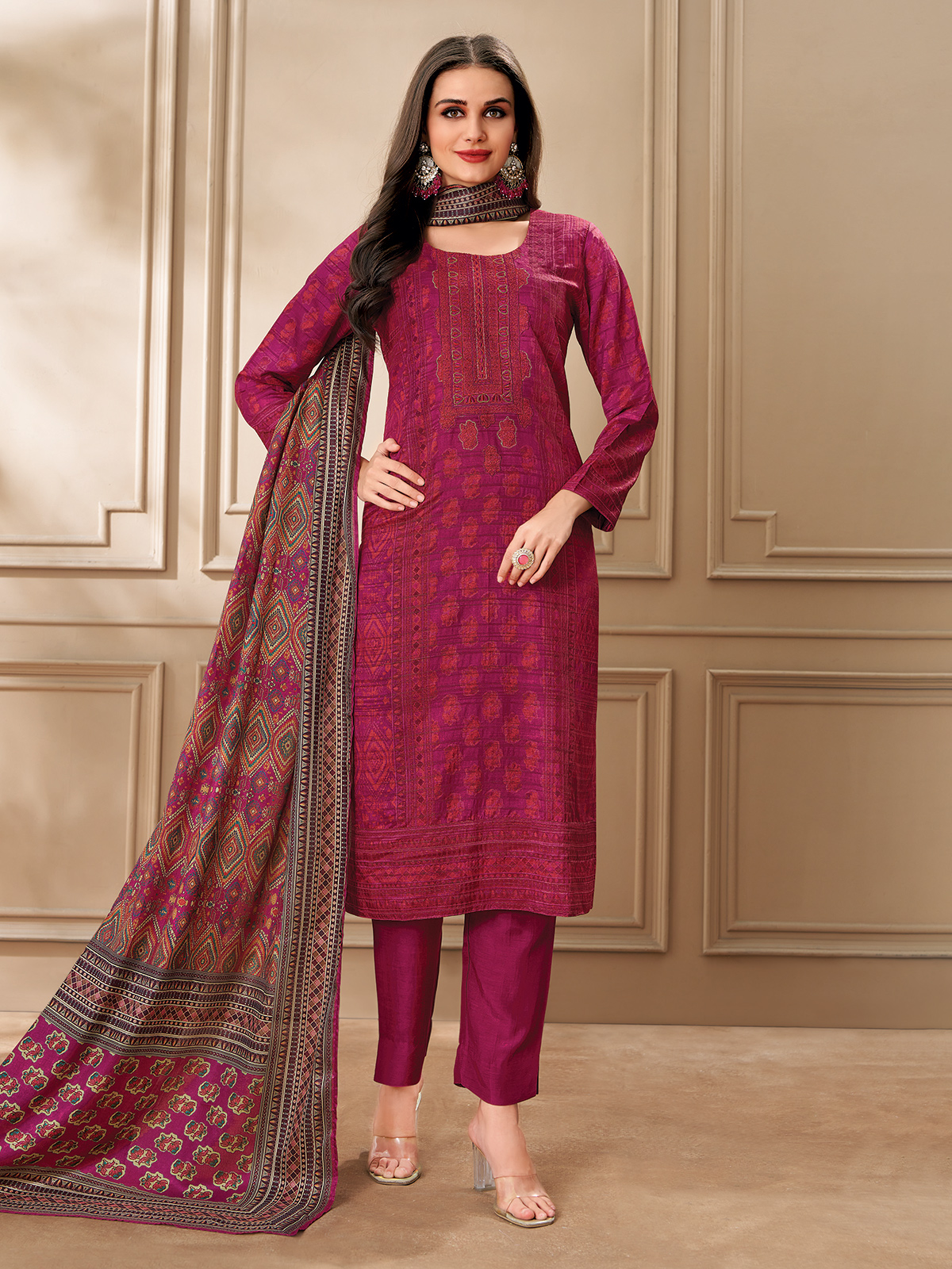 Elevate your festive style with this elegant wine tusser silk salwar suit, featuring a captivating print pattern enhanced with delicate bead and thread work. The round neckline and quarter sleeves lend a refined charm, while the pants and printed dupatta complete the ensemble with effortless grace.