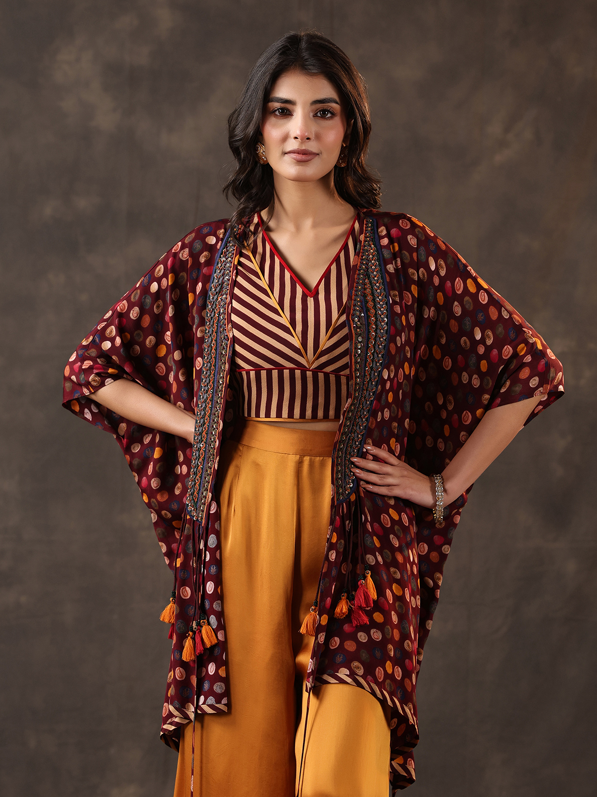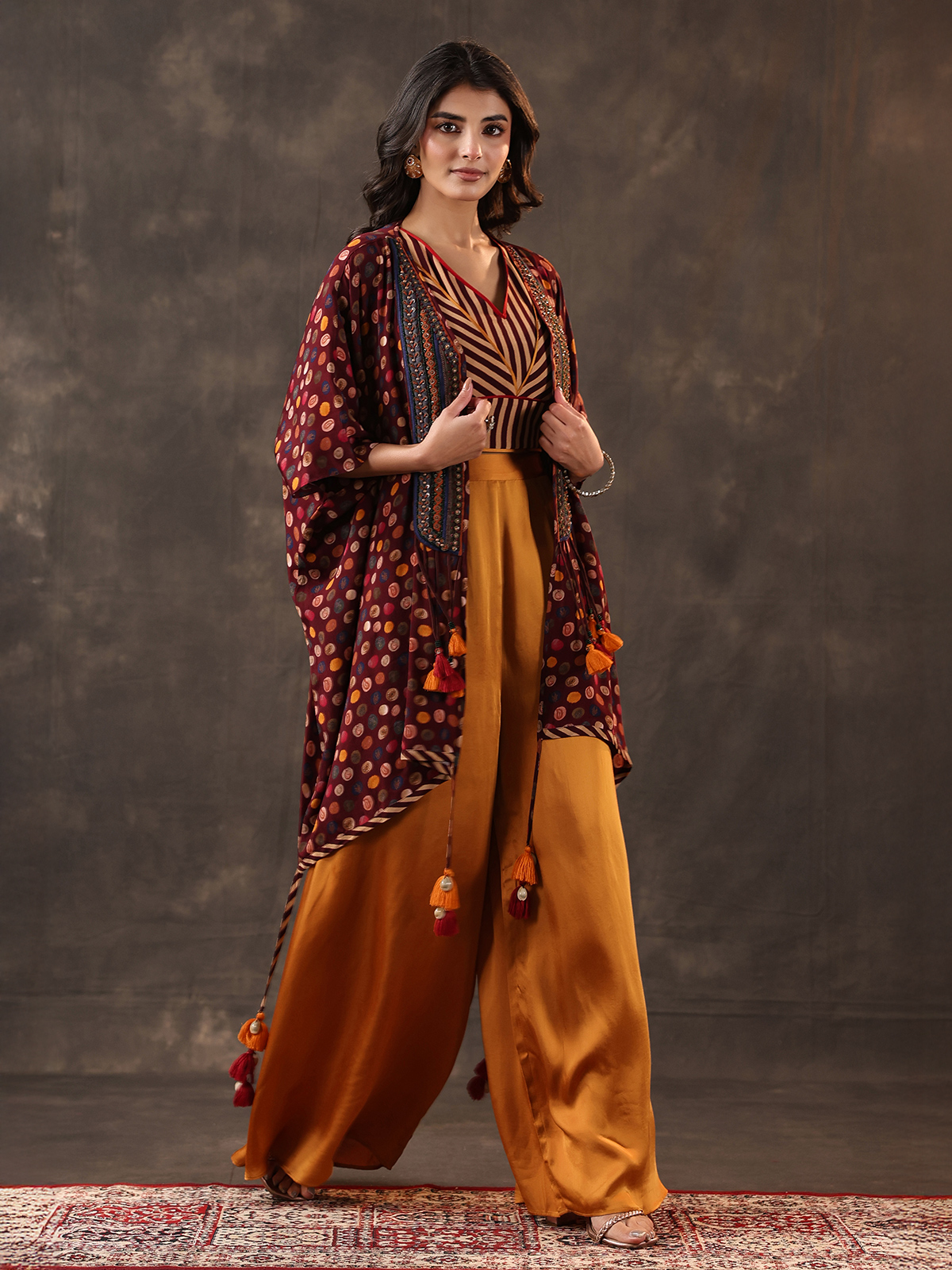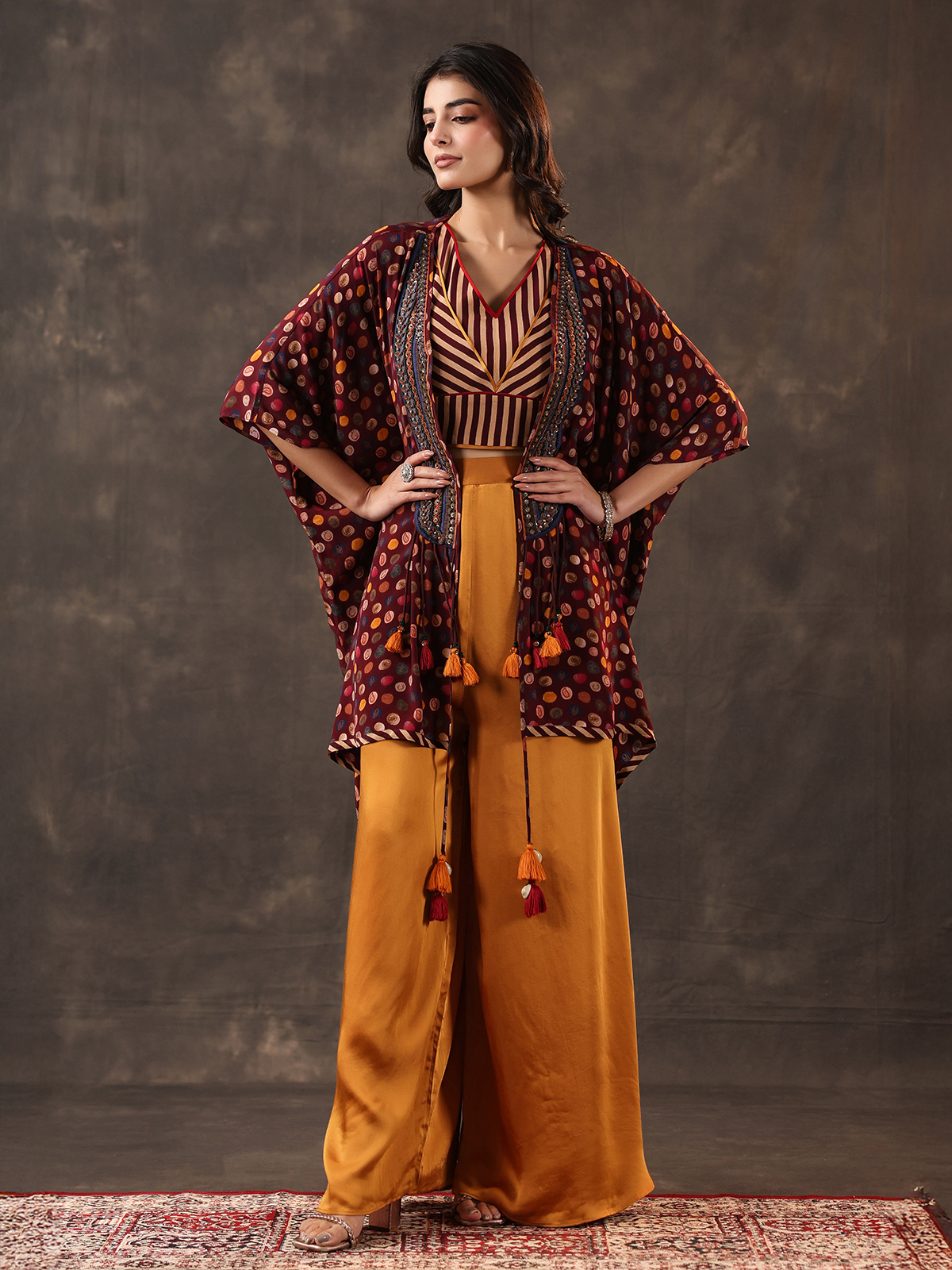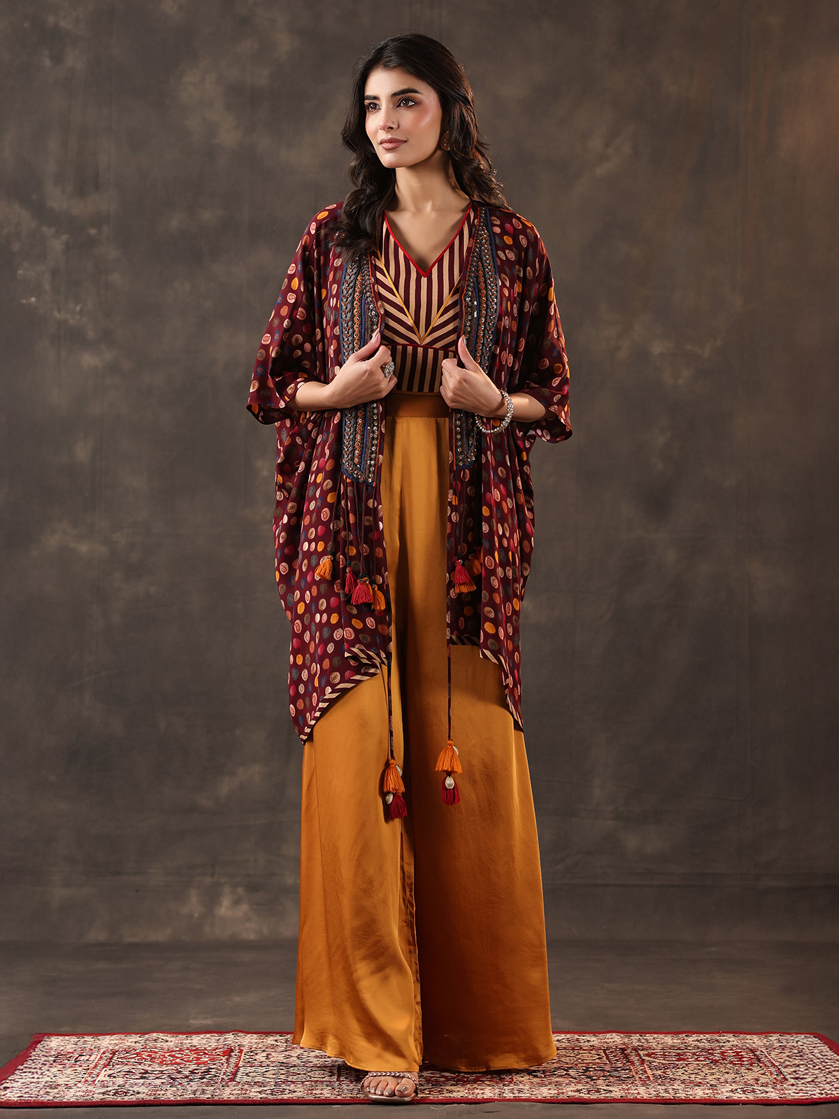 Striking wine and yellow tones define this crepe silk palazzo suit designed in a stylish jacket pattern. Adorned with sequins, beads and thread detailing. It offers contemporary flair. The layered silhouette enhances its appeal, paired with palazzo pants for festive and party wear occasions.
