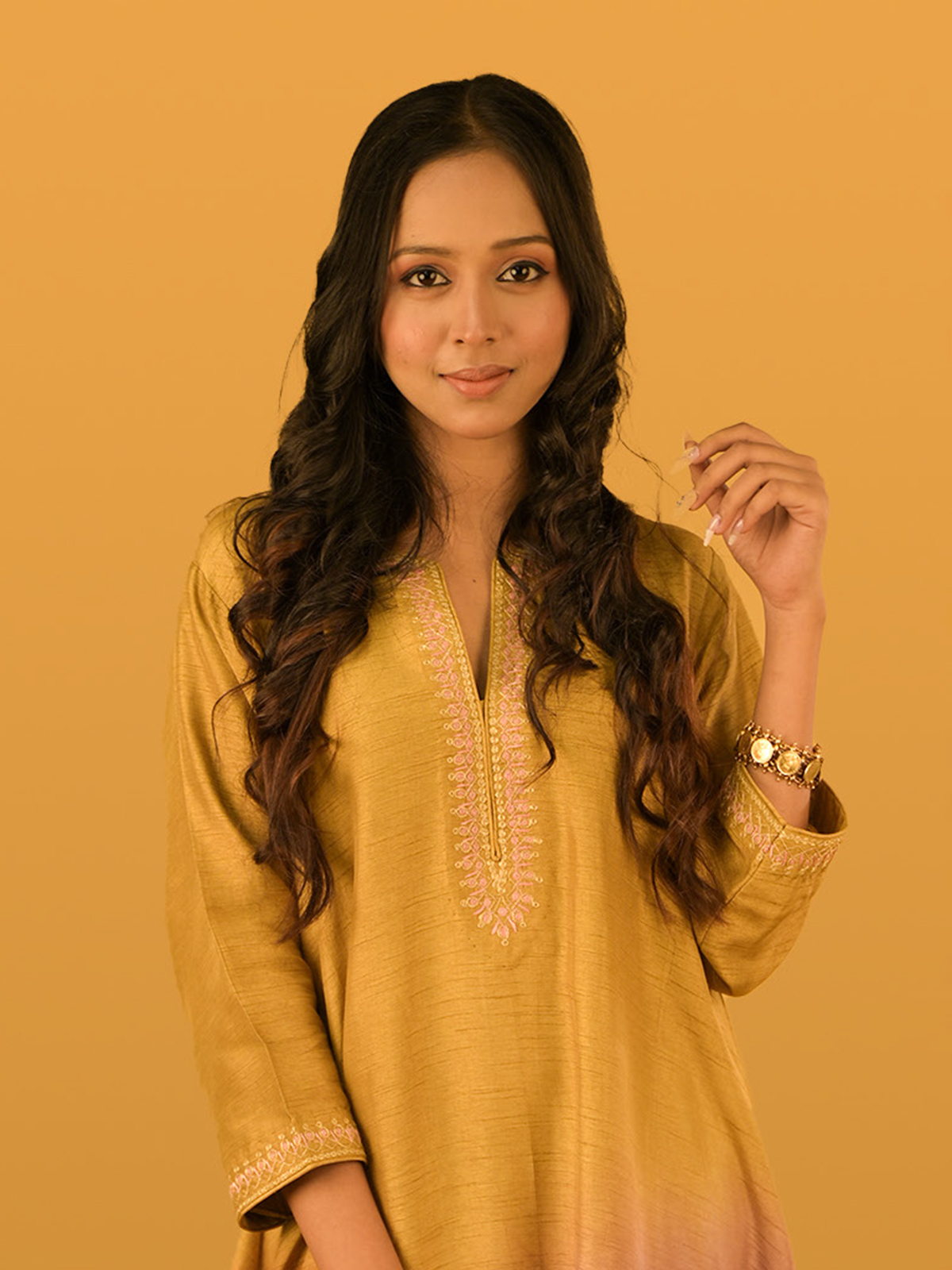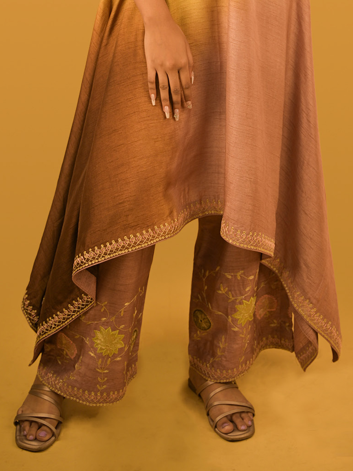 Warm and radiant, this shaded yellow and brown slub silk palazzo suit glistens with resham and sequins accents. Its quarter-sleeved kurti with a subtle neckline exudes elegance, paired with a flowing palazzo for comfortable yet stylish festive dressing.