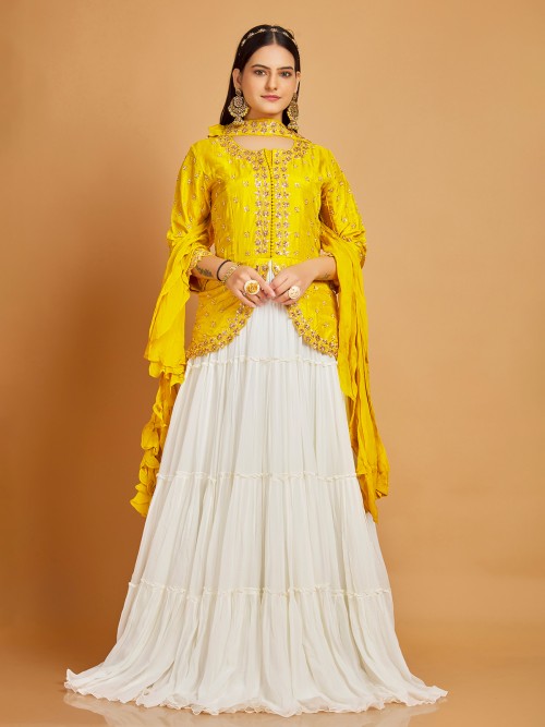 Adore this yellow and white silk and georgette floor length suit with zadosi, sequins and beads work. It has a round neck and quarter sleeves, comes with a dupatta.