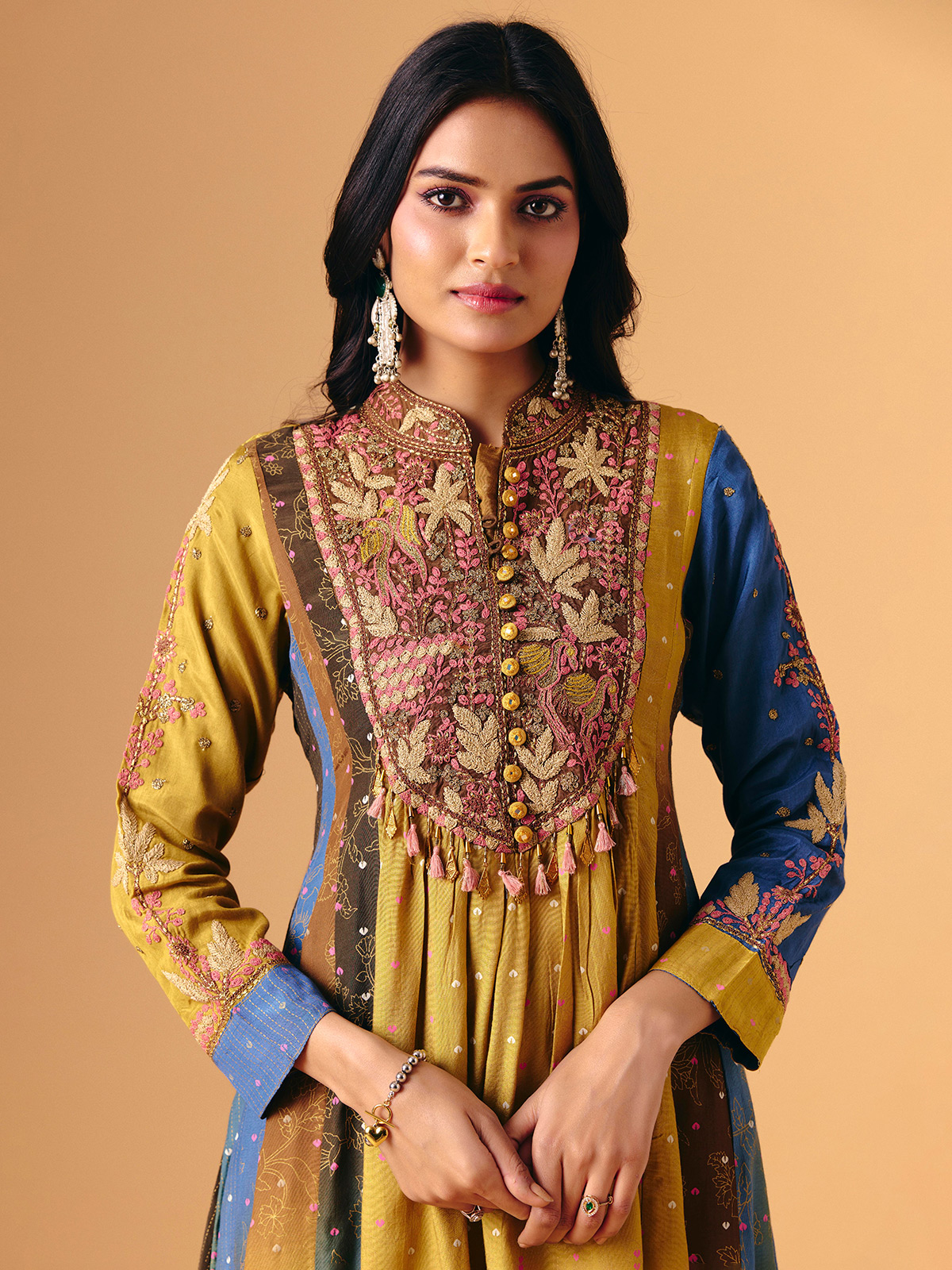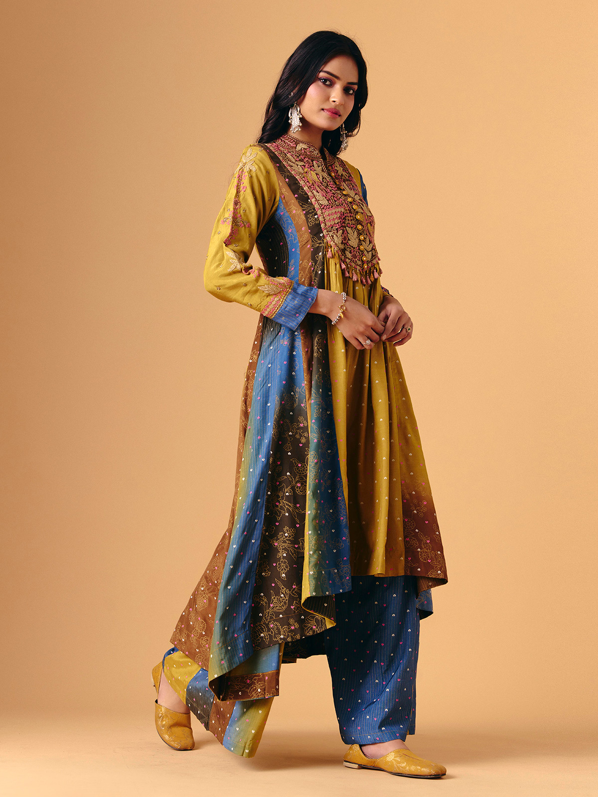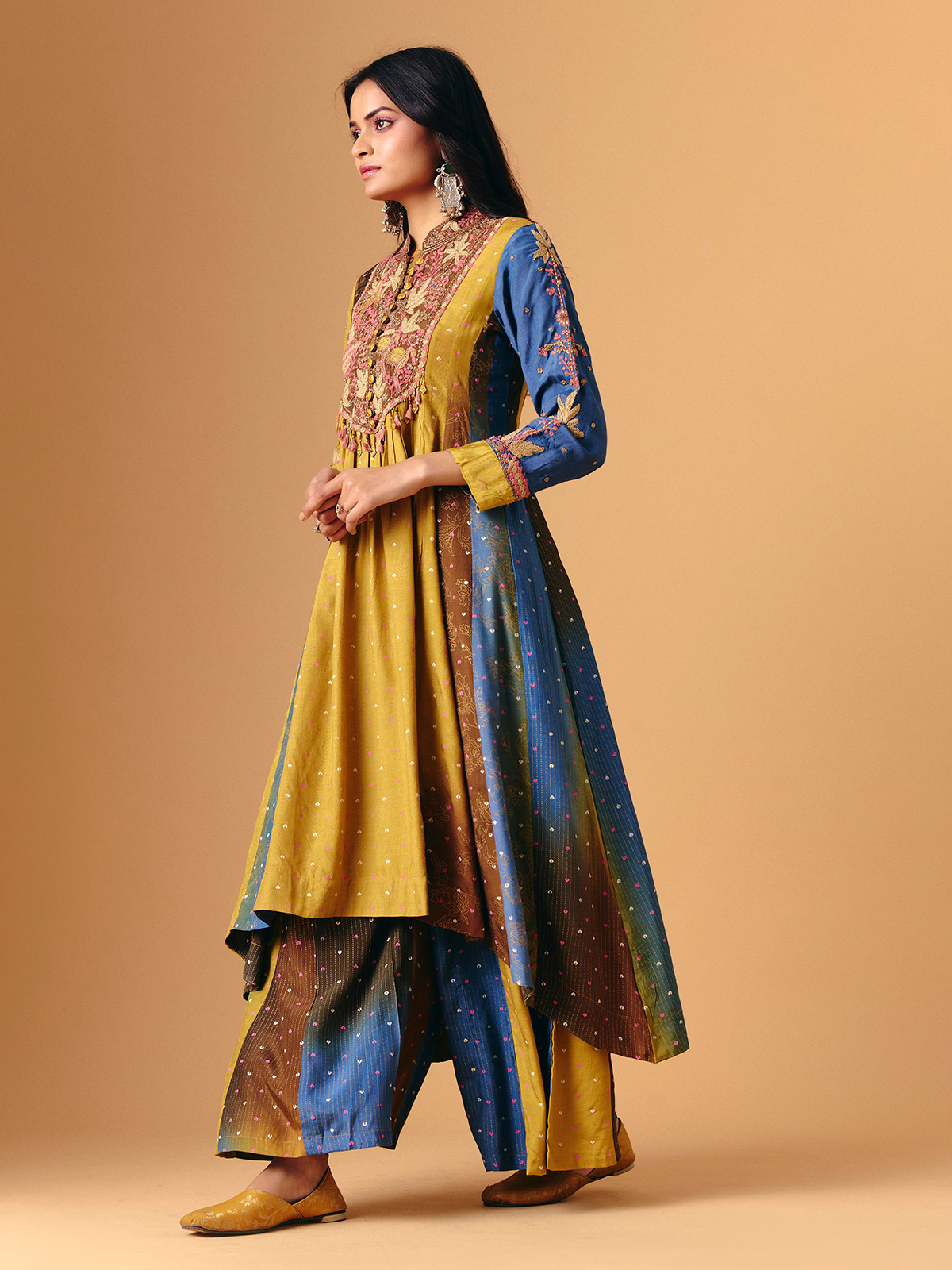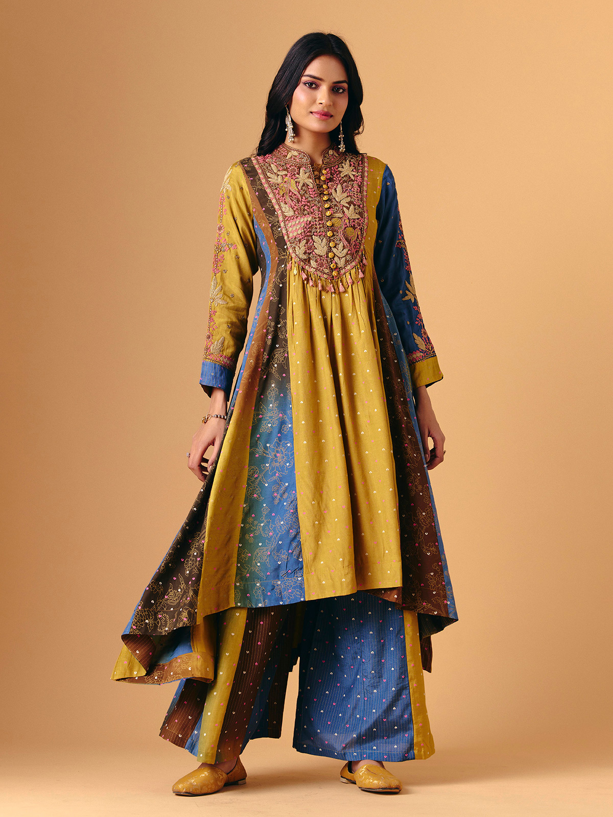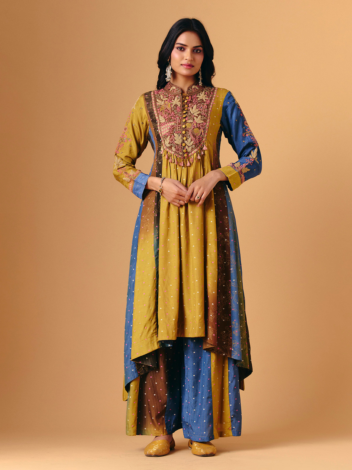Crafted in vibrant yellow cotton silk, this printed palazzo suit dazzles with cutdana, embroidery, aabla, resham, and zardosi detailing. The band gala neckline and full sleeves enhance its festive elegance, while the flowing palazzo silhouette exudes radiant charm. Completed with a coordinating dupatta, it’s perfect for festive and Eid celebrations with luxe appeal.