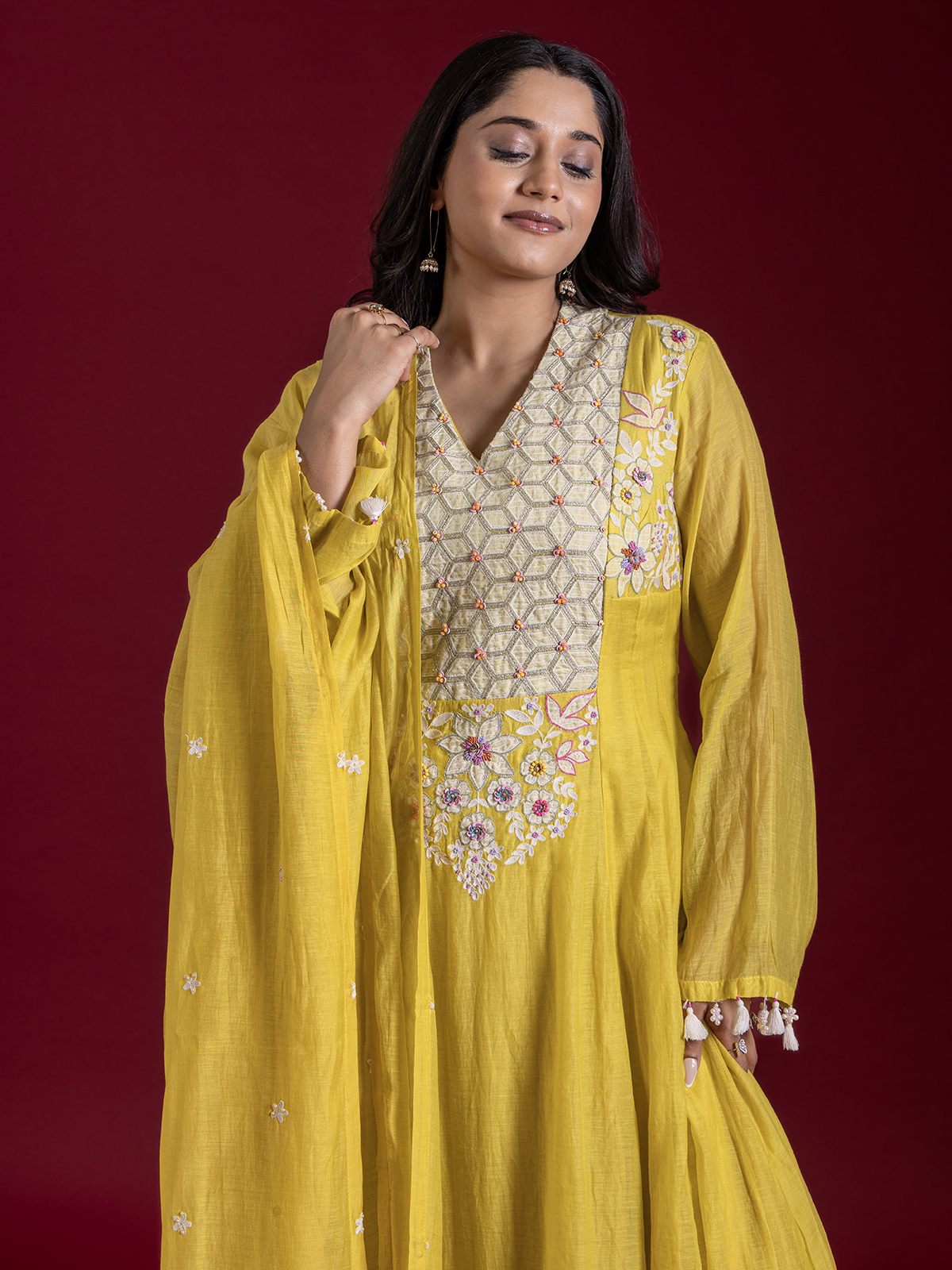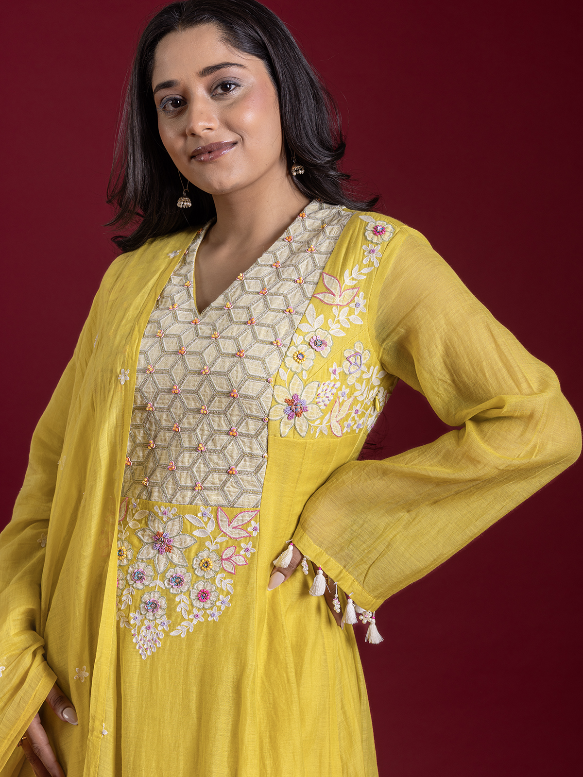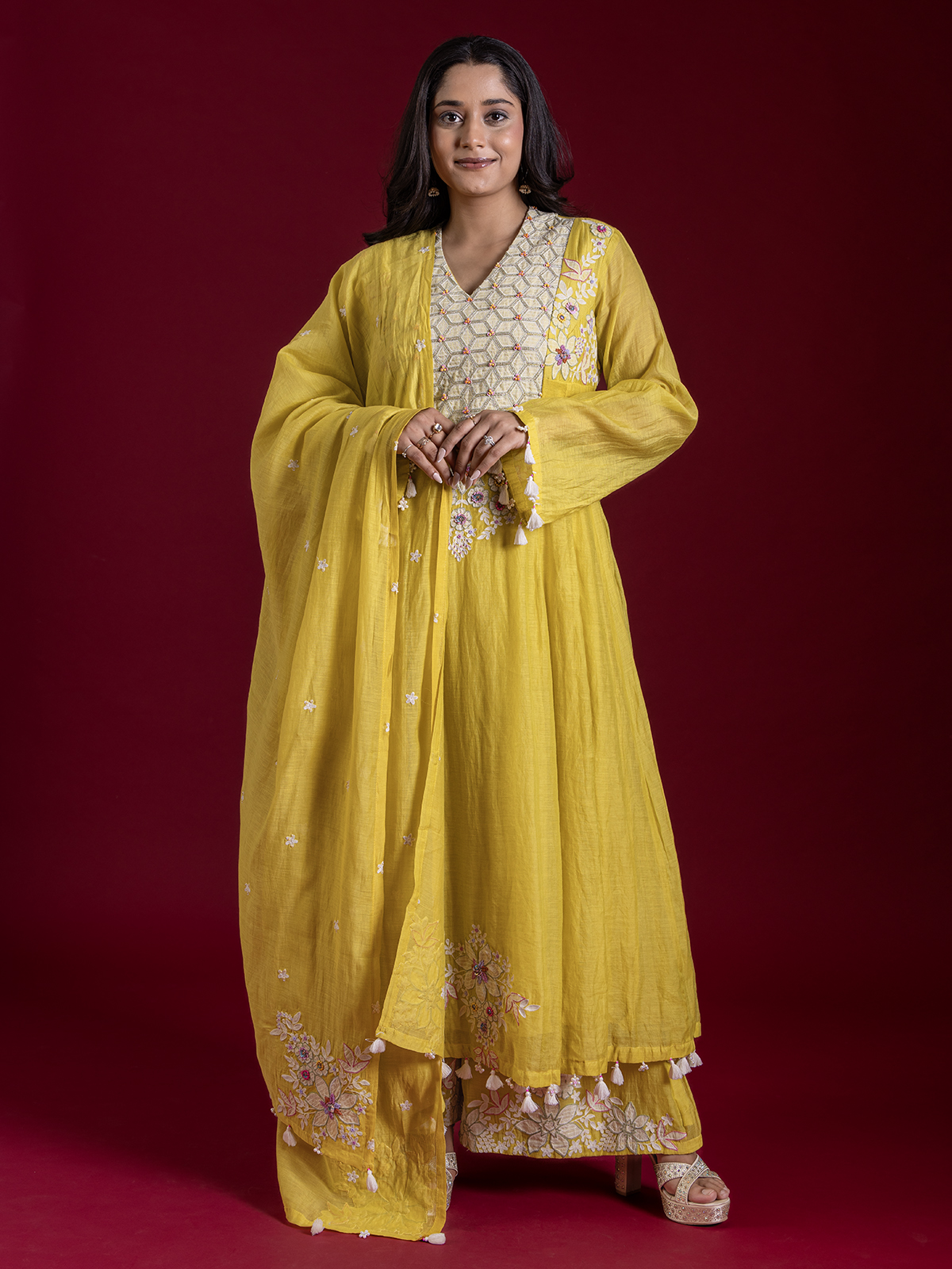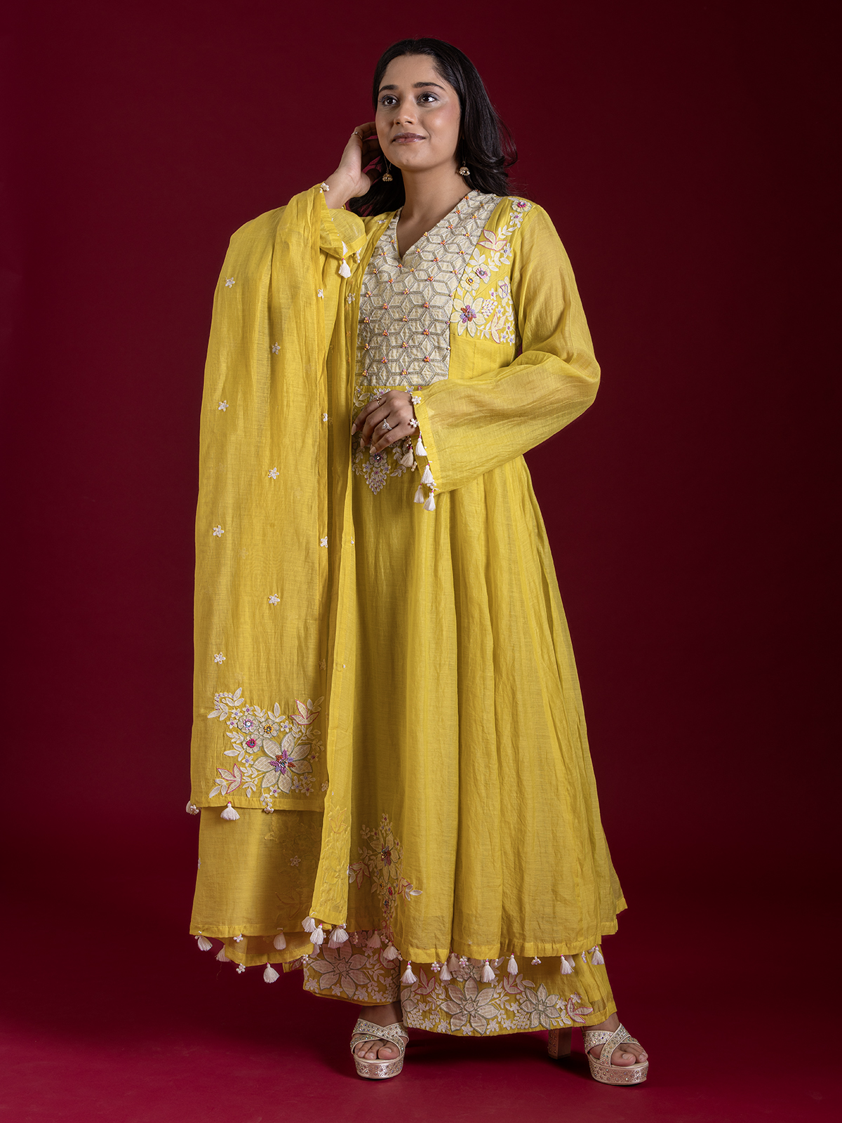 Bright in yellow cotton silk, this palazzo suit is detailed with sequins, beads, and thread embroidery. Styled with a V-neckline and full sleeves, it balances vibrant energy with festive refinement. Ideal for festivals and haldi celebrations, the radiant hue and exquisite craftsmanship bring warmth and charm to celebratory gatherings.