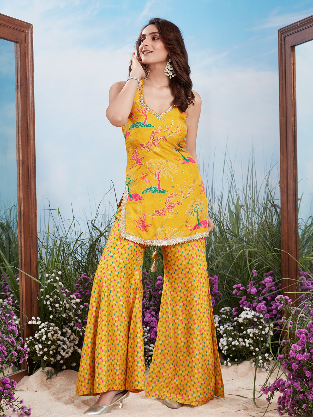 Designed in radiant yellow silk, this sharara suit features sequins, beads, cutdana and mirror work paired with a digital print inspired by nomadic tribe and foliage motifs. The vibrant color makes it ideal for haldi, sangeet, weddings and reception celebrations with a joyful festive vibe.