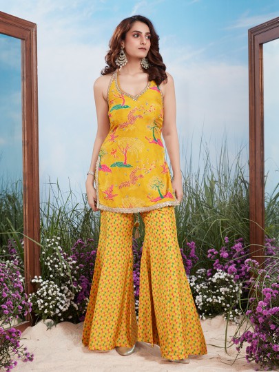 Yellow Digital Print Silk Mirror Work Sharara Suit