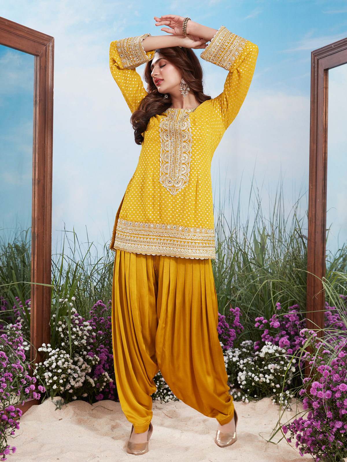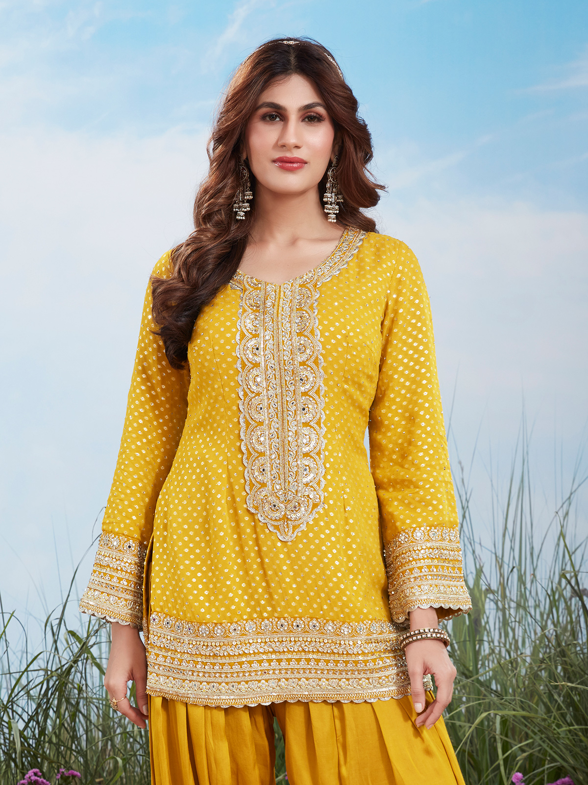 This vibrant yellow creation showcases zari, resham, sequins, and mirror embellishments for a radiant finish. Styled with a round neckline and quarter sleeves, it is paired with a matching salwar. Ideal for weddings and traditional functions, it offers celebratory elegance.