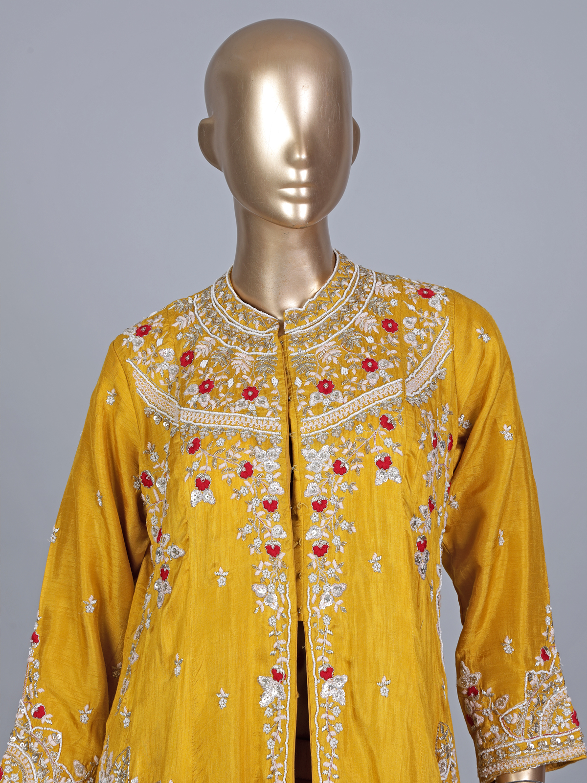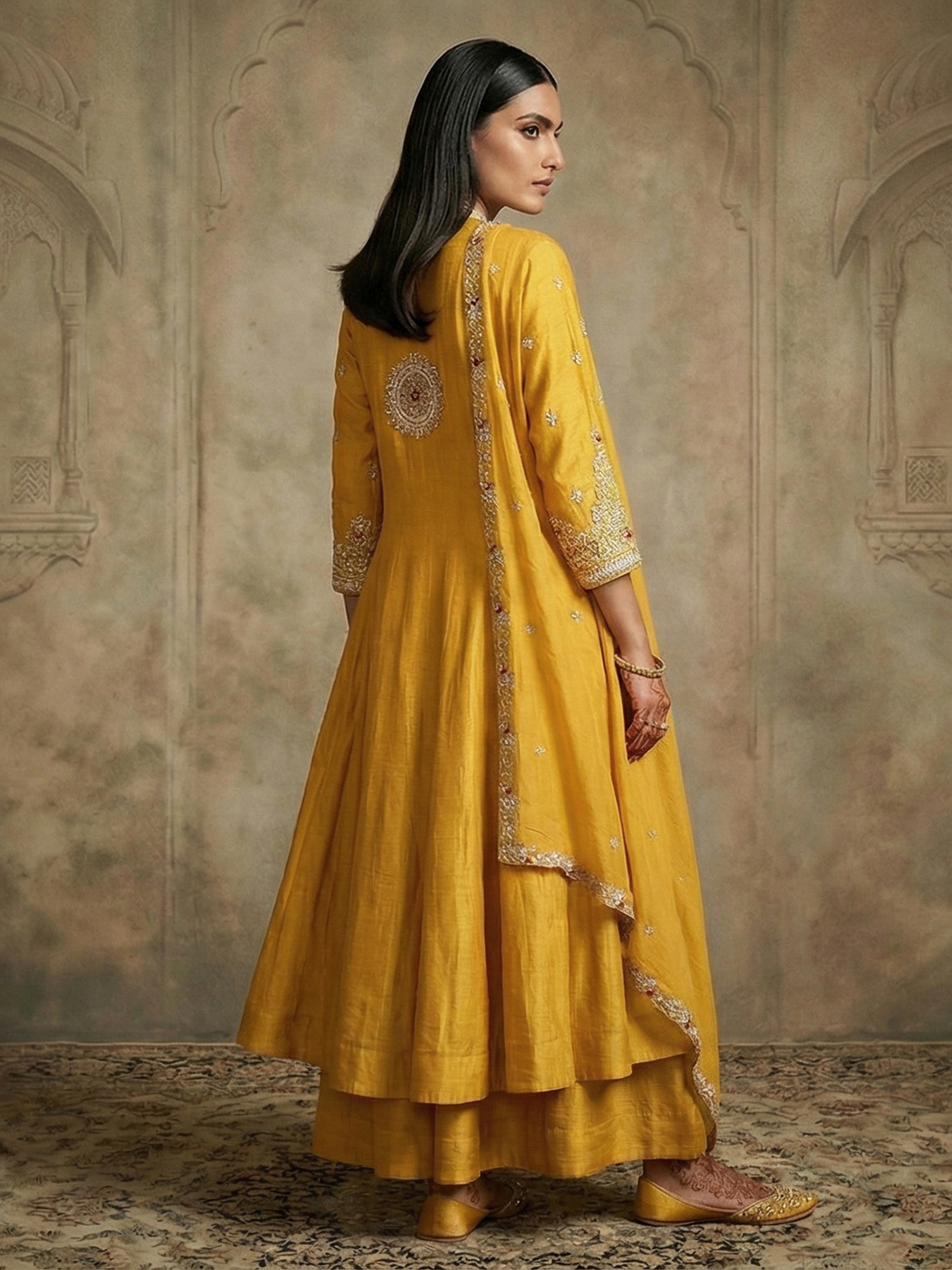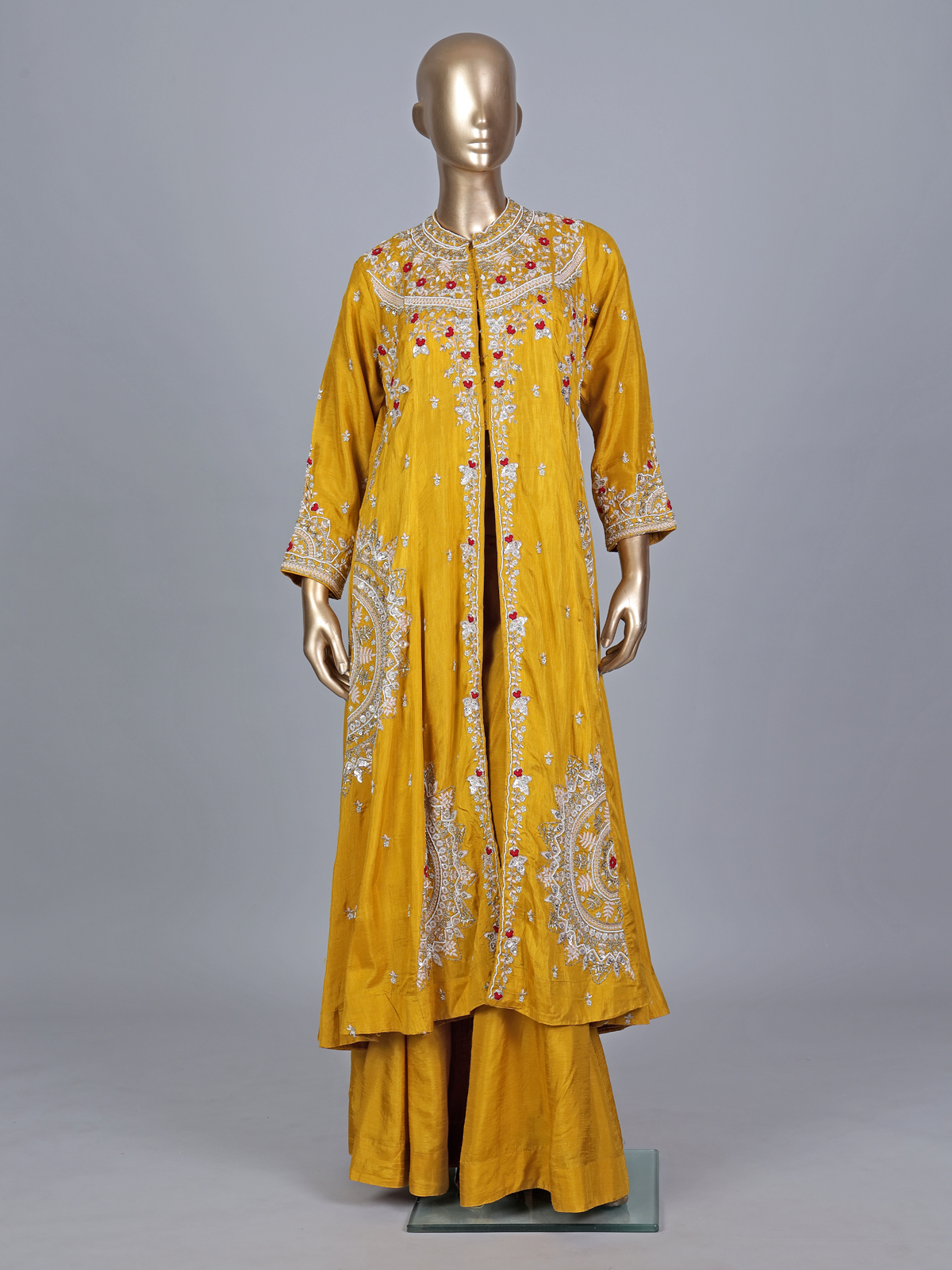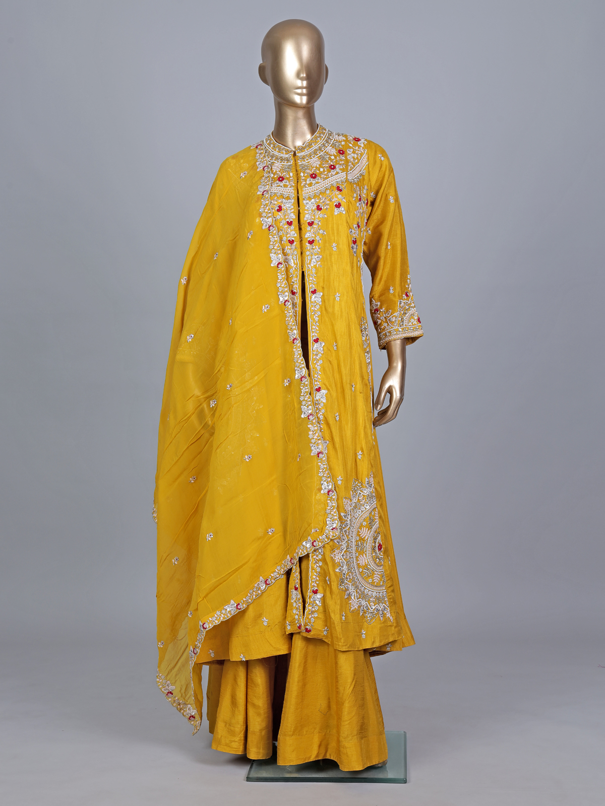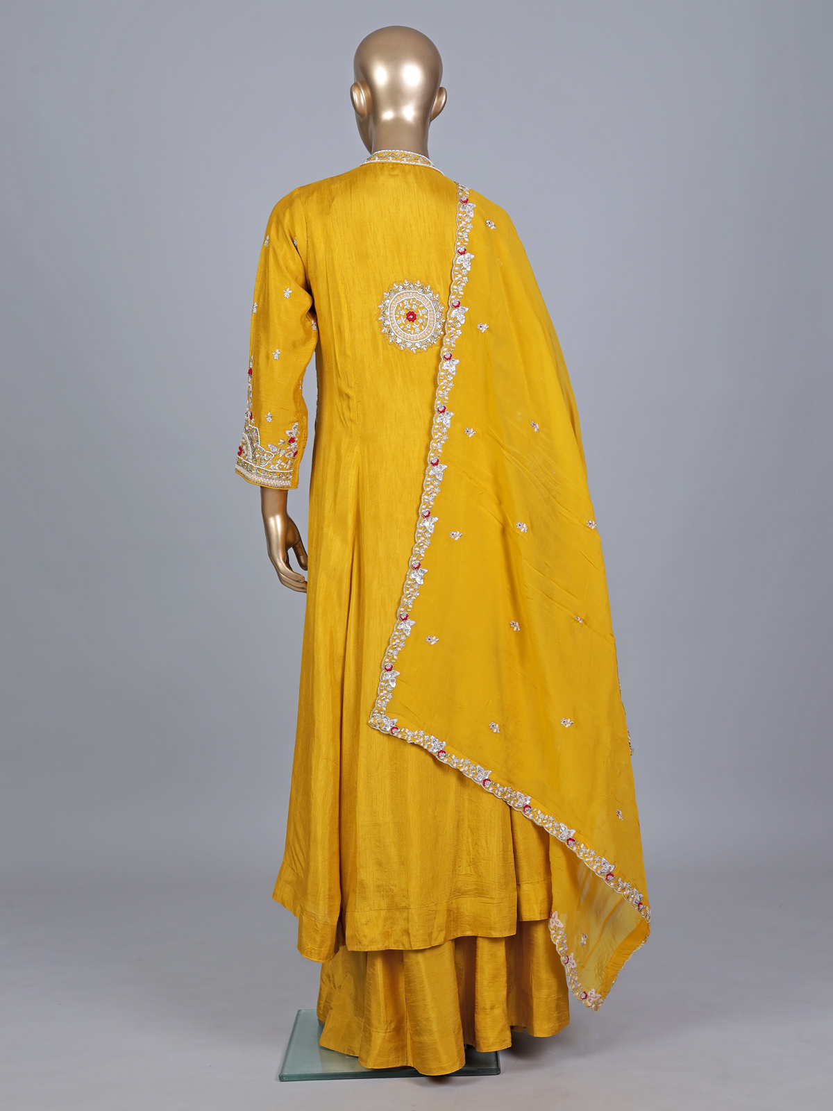 Brighten every celebration with this yellow silk palazzo suit. Perfect for haldi ceremonies. Adorned with cutdana, sequins and thread work. It features a chic stand collar and quarter sleeves. Paired with a dupatta, this ensemble blends festive vibrance with modern sophistication beautifully.