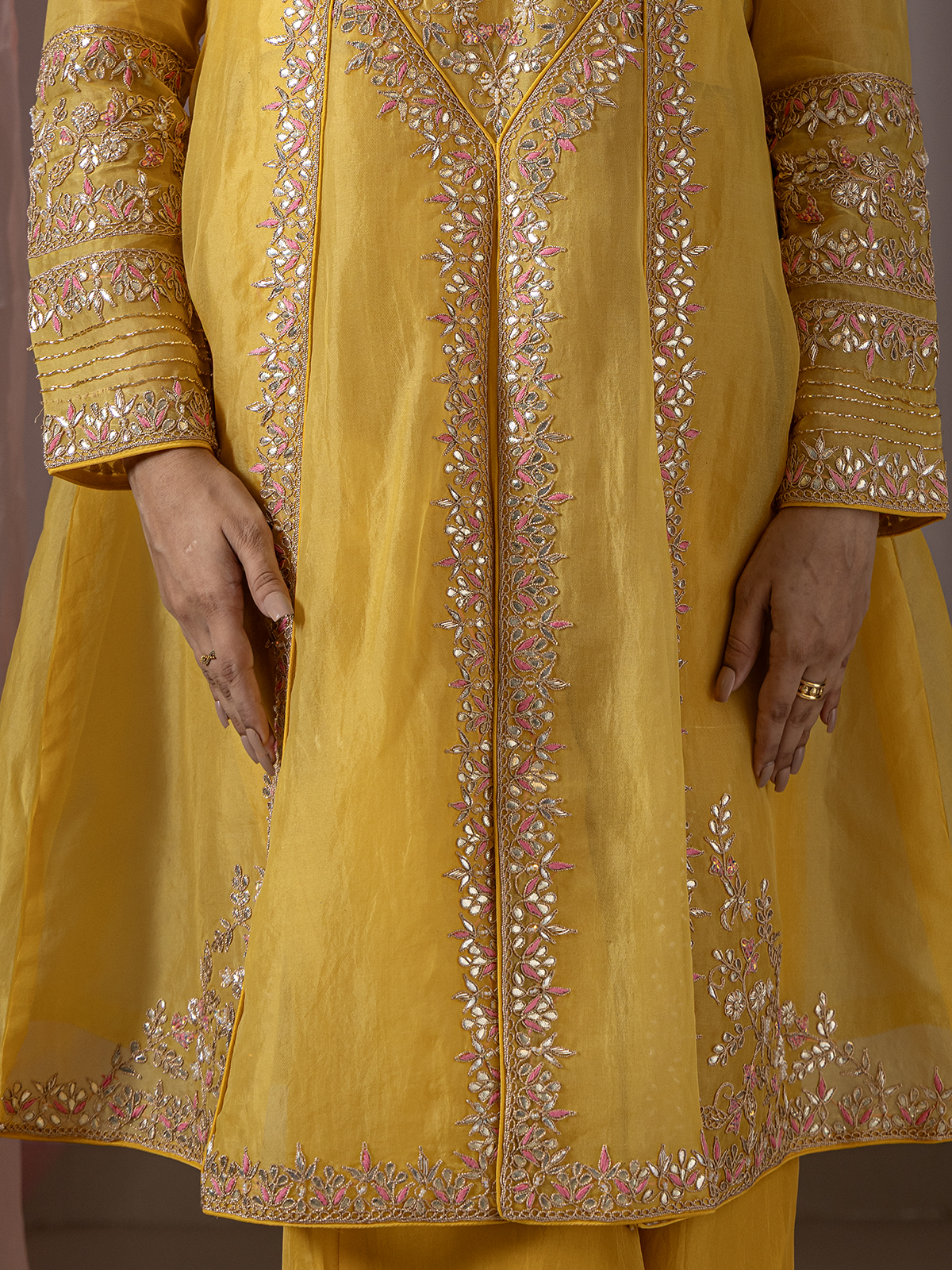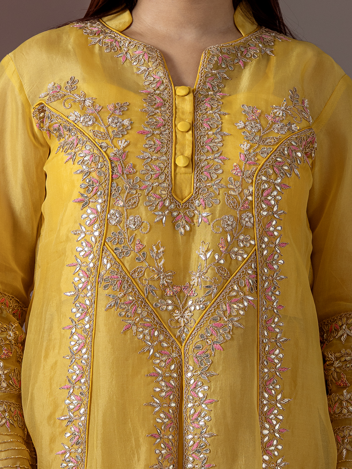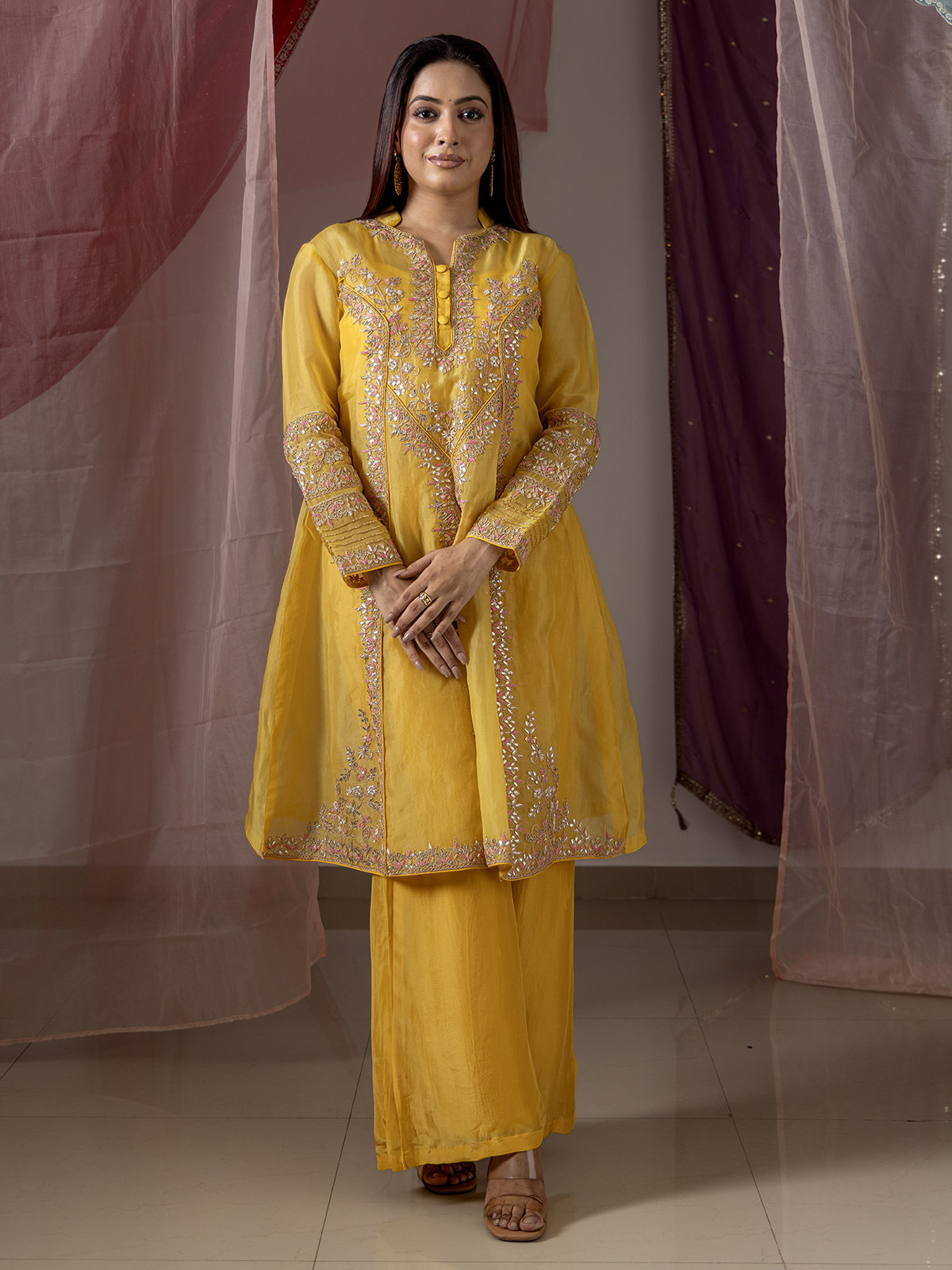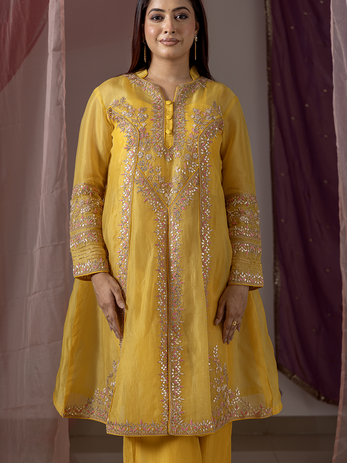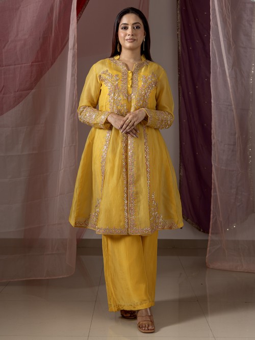 Drenched in yellow silk radiance, this festive palazzo suit sparkles with resham, sequins, beads, gota and zardosi detailing for a regal touch. The stand collar and full sleeves add composed charm, while the flowy palazzo completes a look of timeless festive elegance.