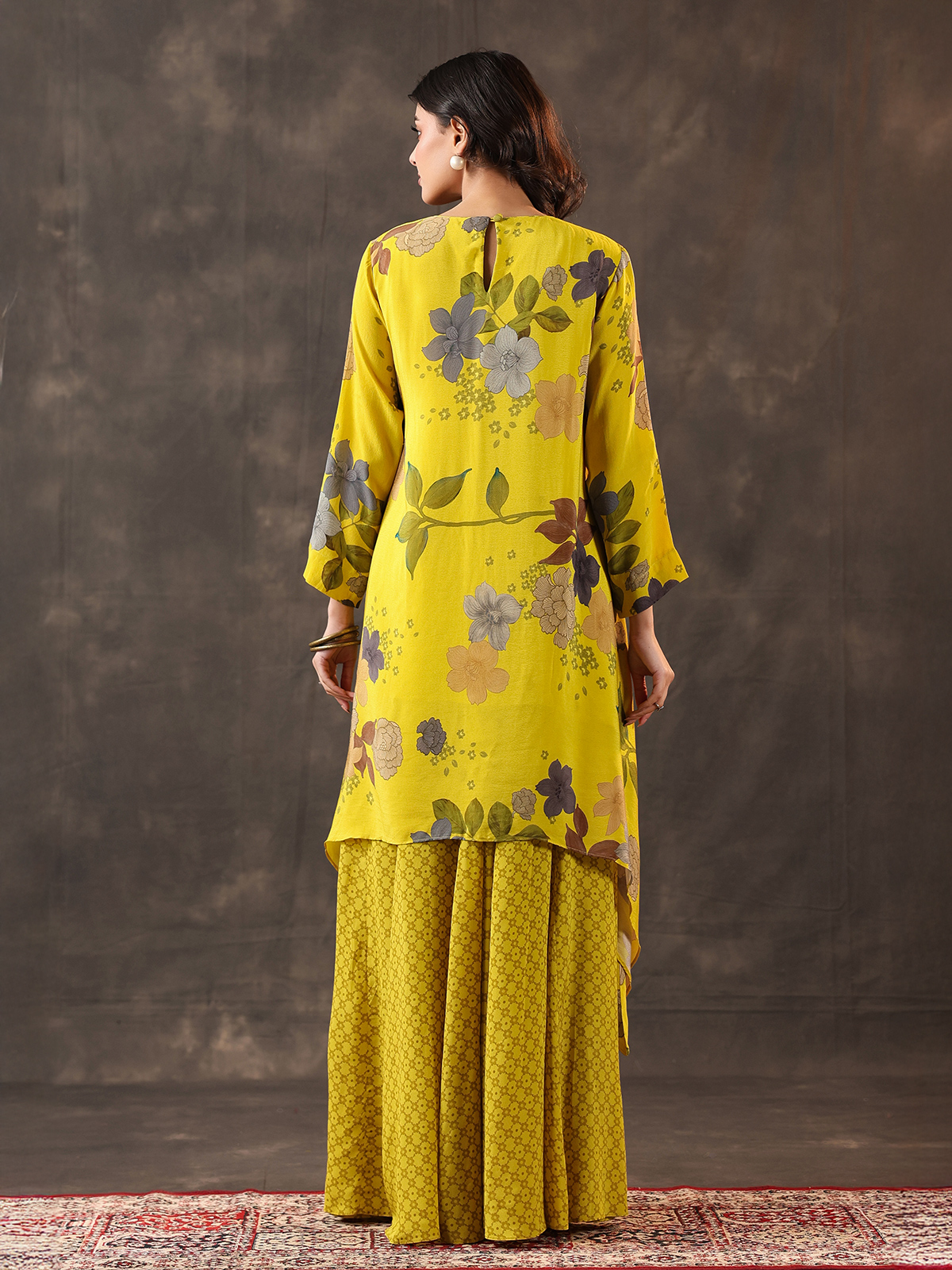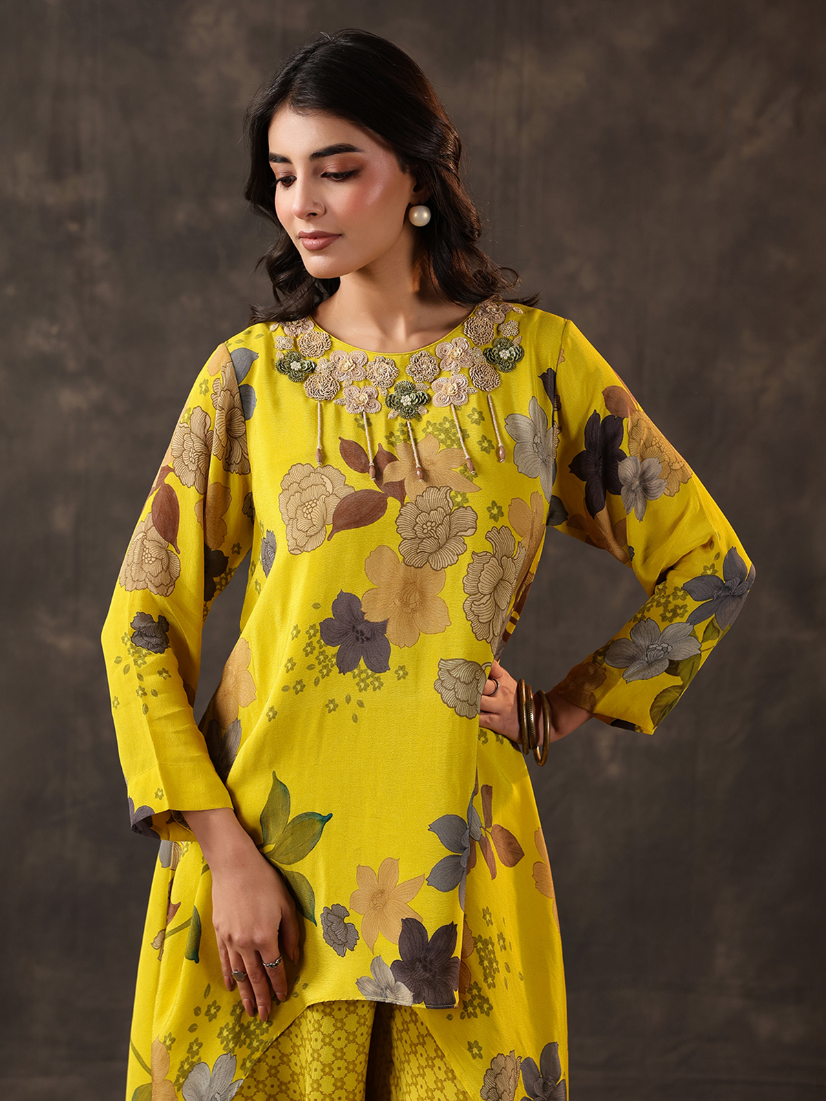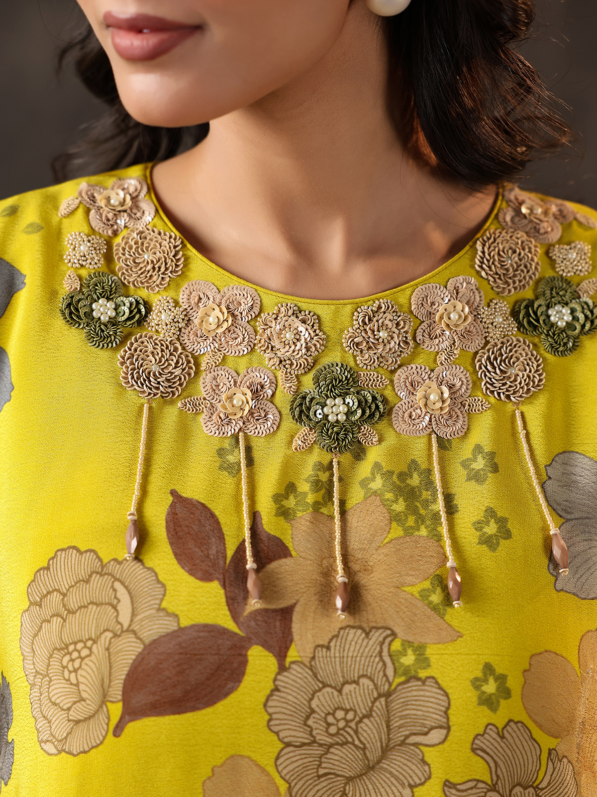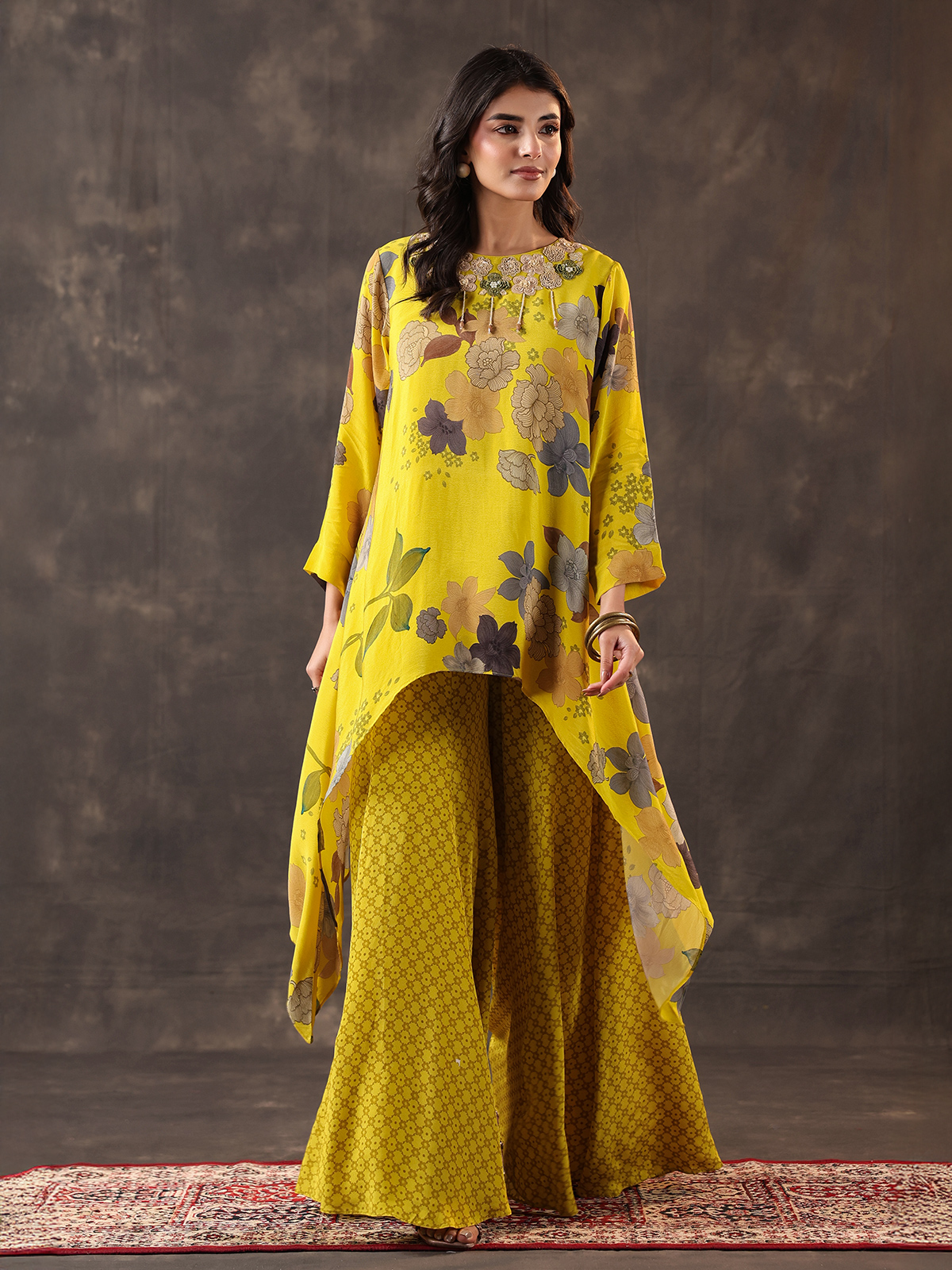 Yellow Silk Floral Kaftan Style Palazzo Suit