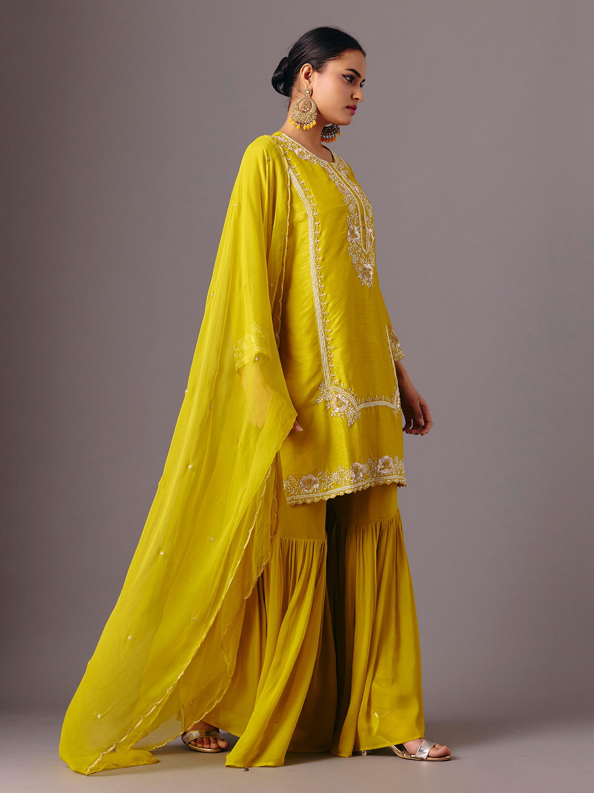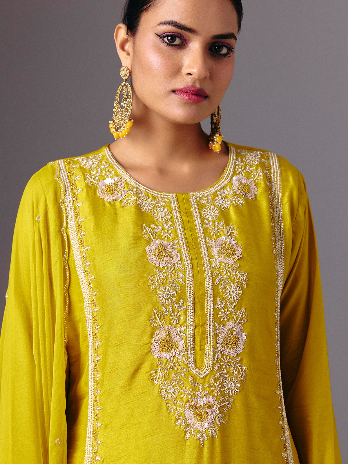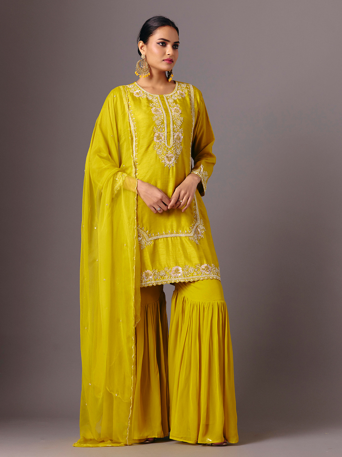 This sunny yellow silk sharara suit dazzles with sequins, cutdana, beads, and embroidery work. Round neckline and quarter sleeves lend refined sophistication, while the flowing sharara enhances graceful movement. Paired with a coordinating dupatta, it’s ideal for wedding, reception, sangeet, and haldi occasions, exuding regal appeal and festive luxury.