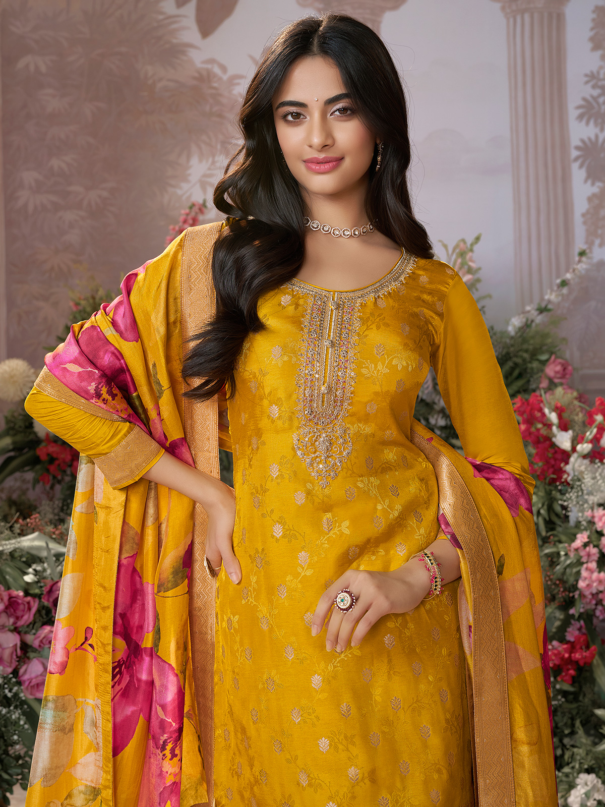 Bright yellow silk glows with festive beauty, enriched by resham, zari, cutdana, and sequins shimmering like beams of sunlight. A stand neckline with quarter sleeves enhances its grace, while palazzo and printed dupatta complete the look, making it an ideal ensemble for cultural occasions and joyous gatherings.