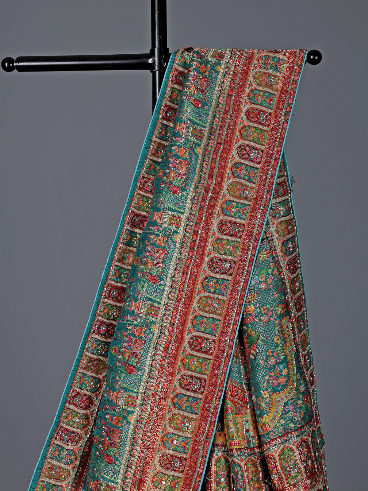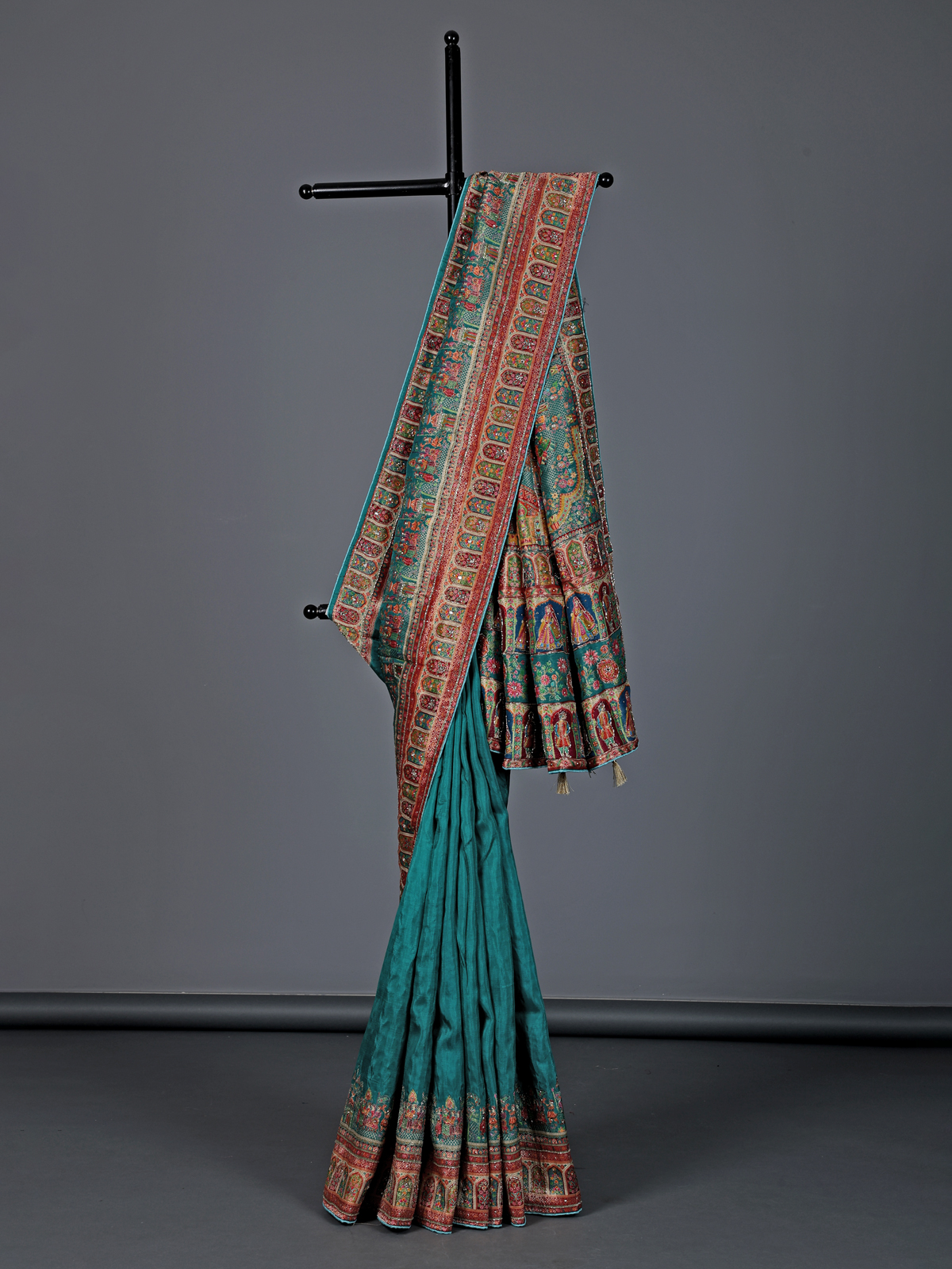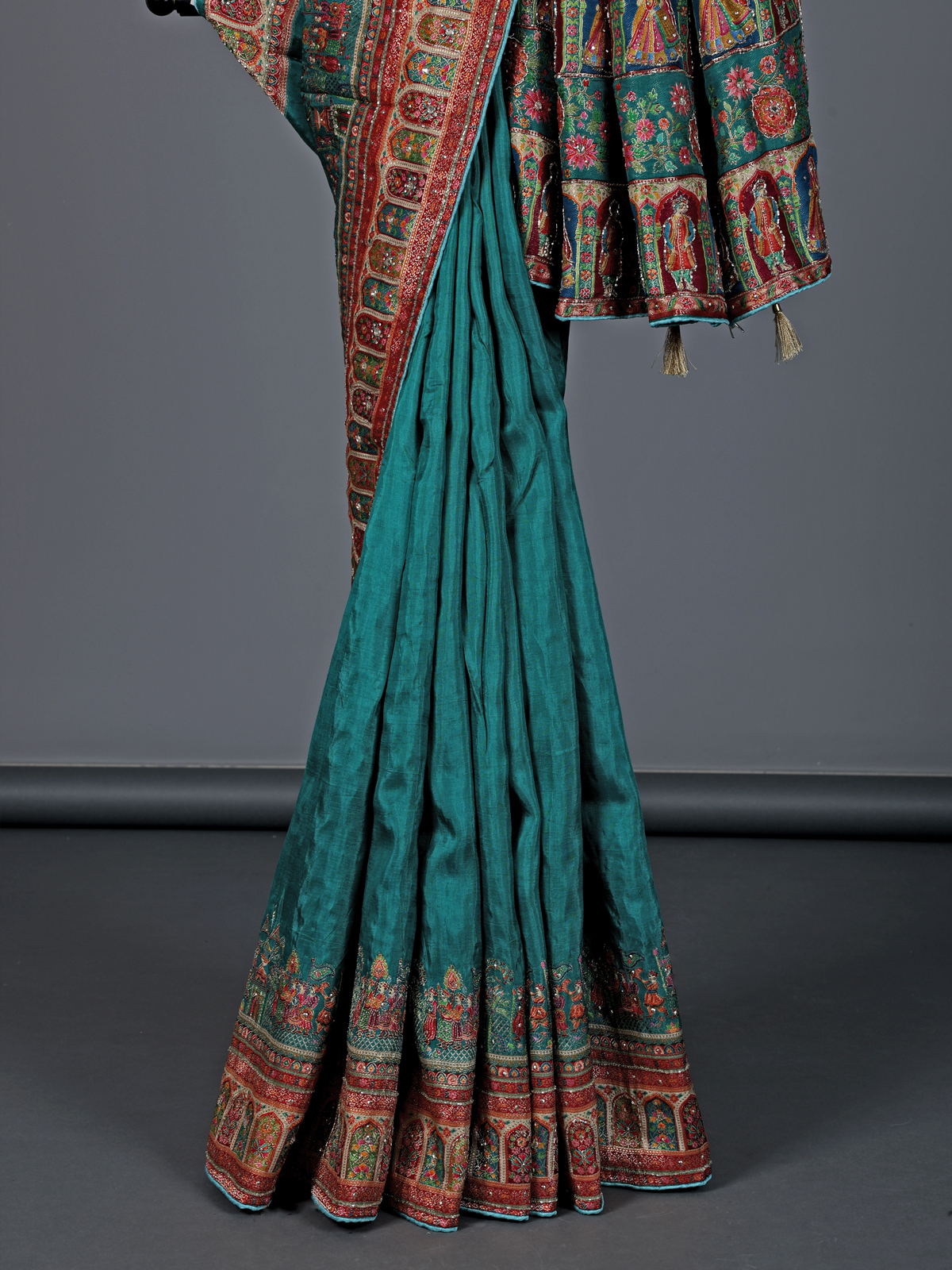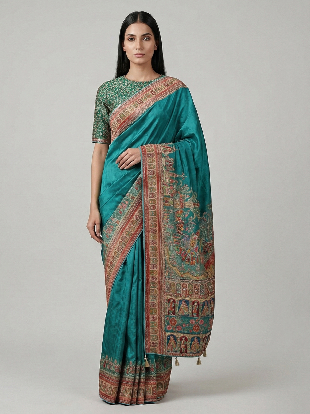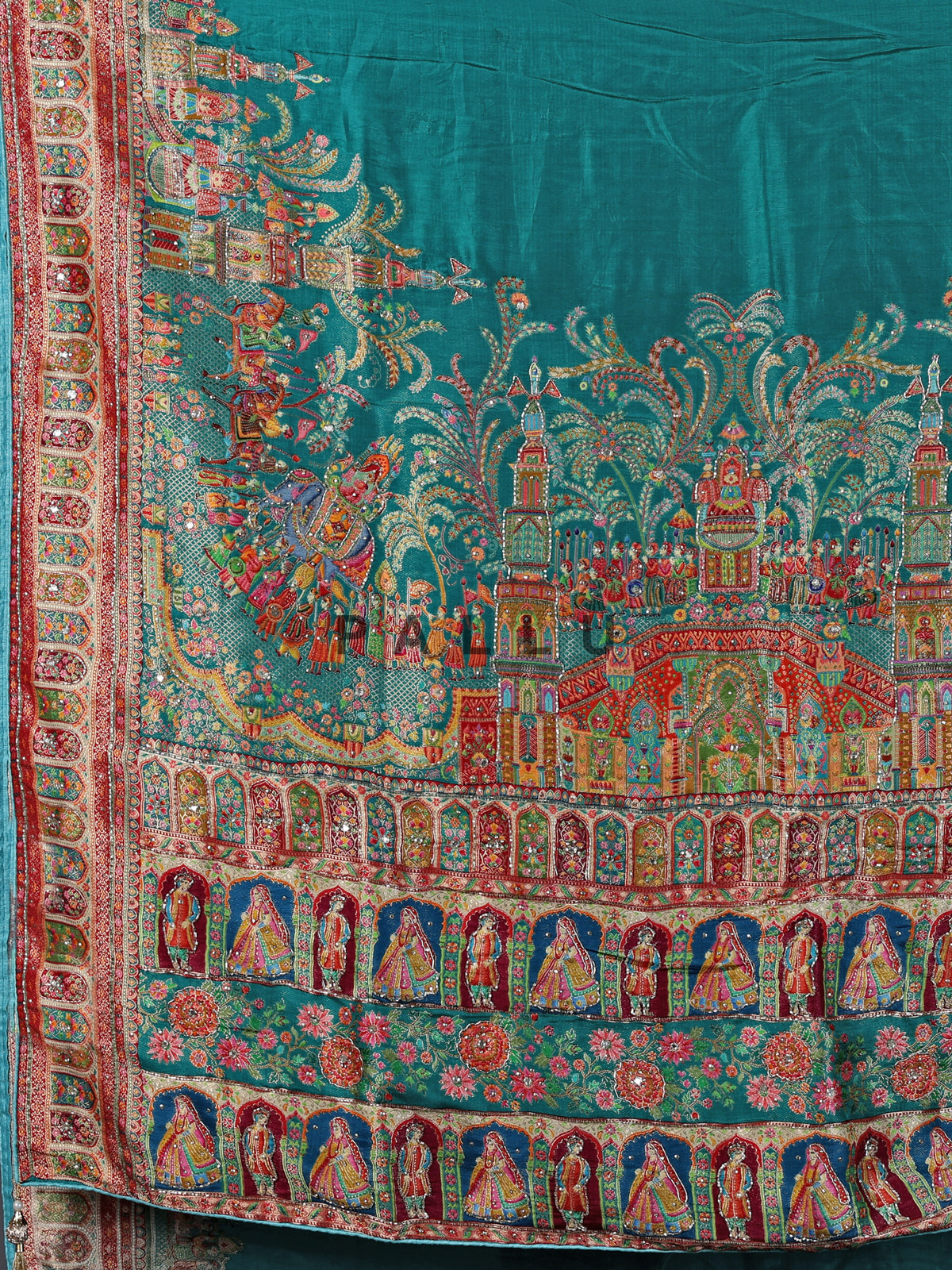 Lively and radiant aqua blue art silk saree showcases colorful motifs enhanced with cutdana, mirror and diamond detailing. The vibrant design reflects festive brilliance, making it ideal for weddings and celebrations. It includes an unstitched blouse piece for a tailored and elegant finish.