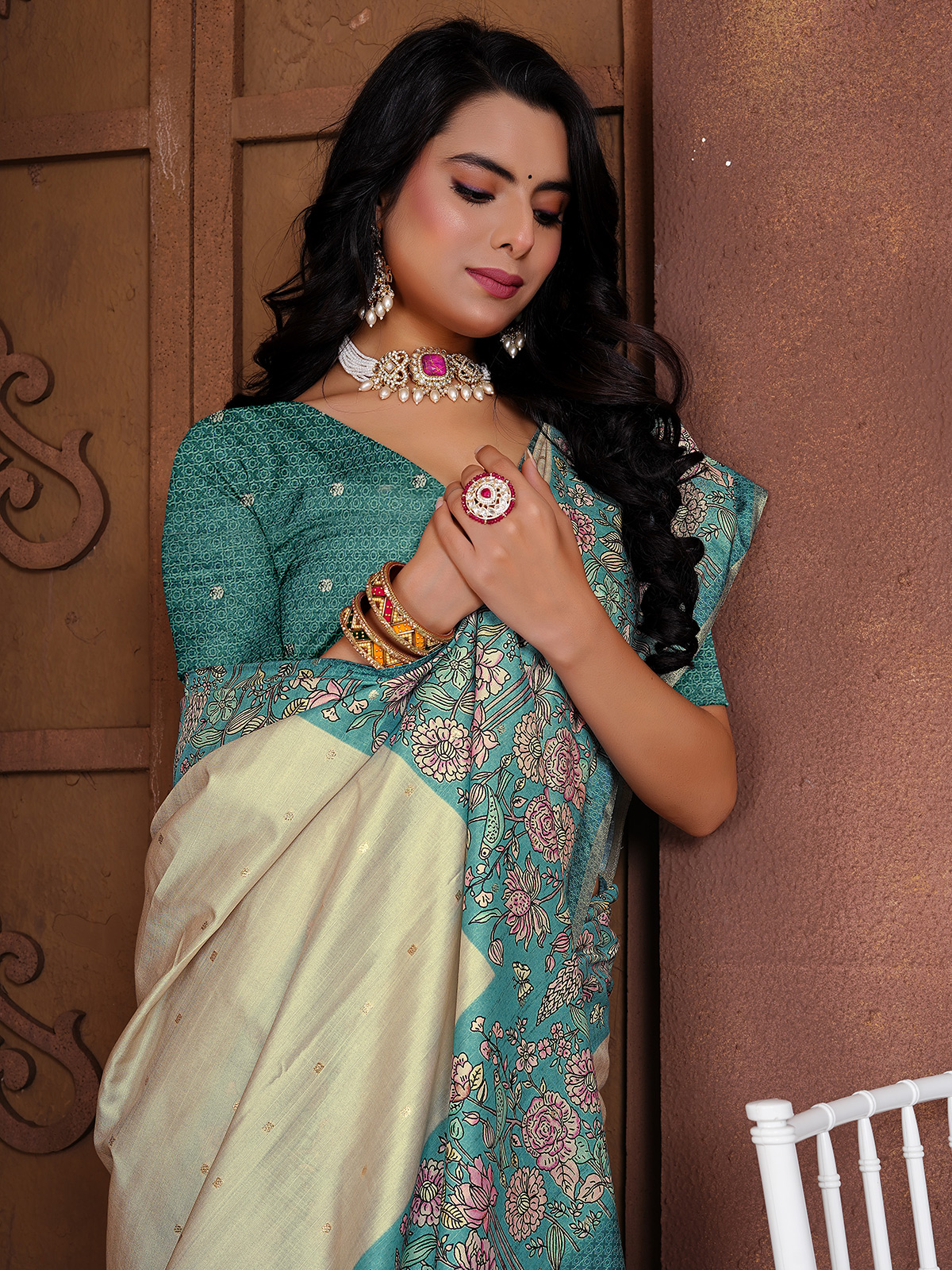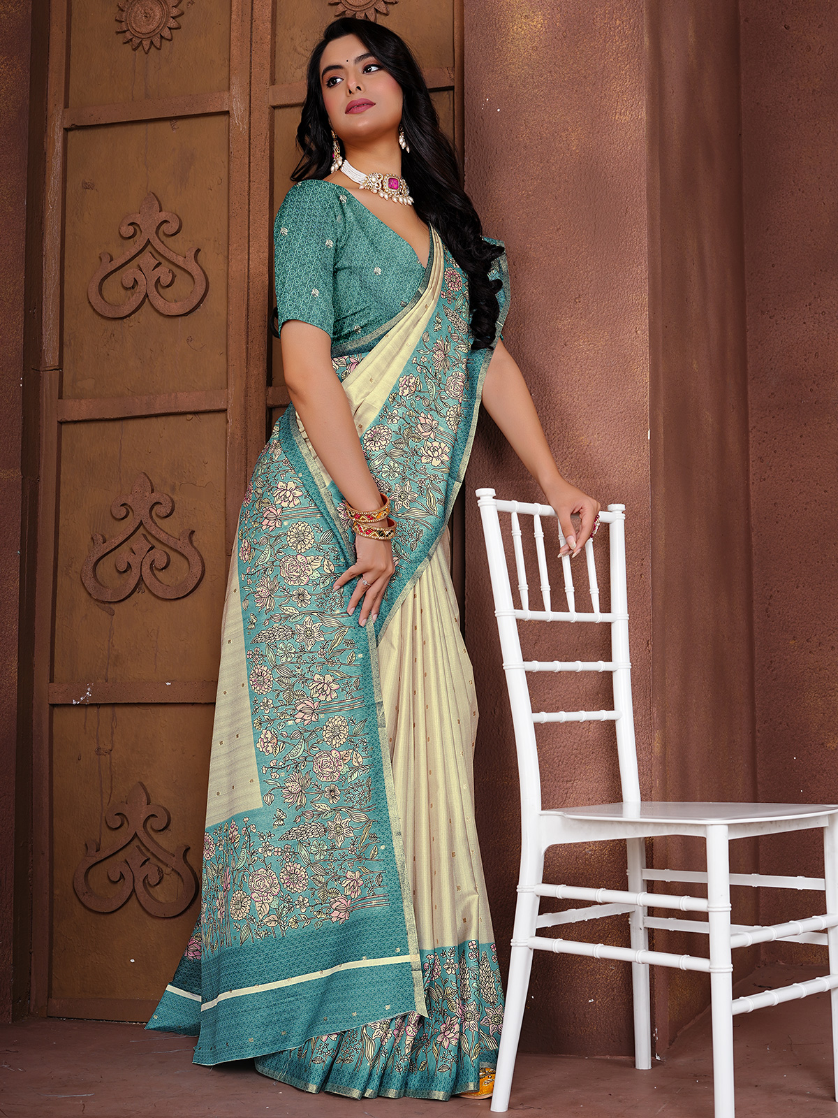 Elegantly crafted in aqua blue and cream soft silk, this saree features graceful zari work highlighted with floral prints on a contrast border. Paired with an unstitched blouse piece, it offers a smooth drape and subtle charm, making it ideal for festive occasions and casual ethnic gatherings.