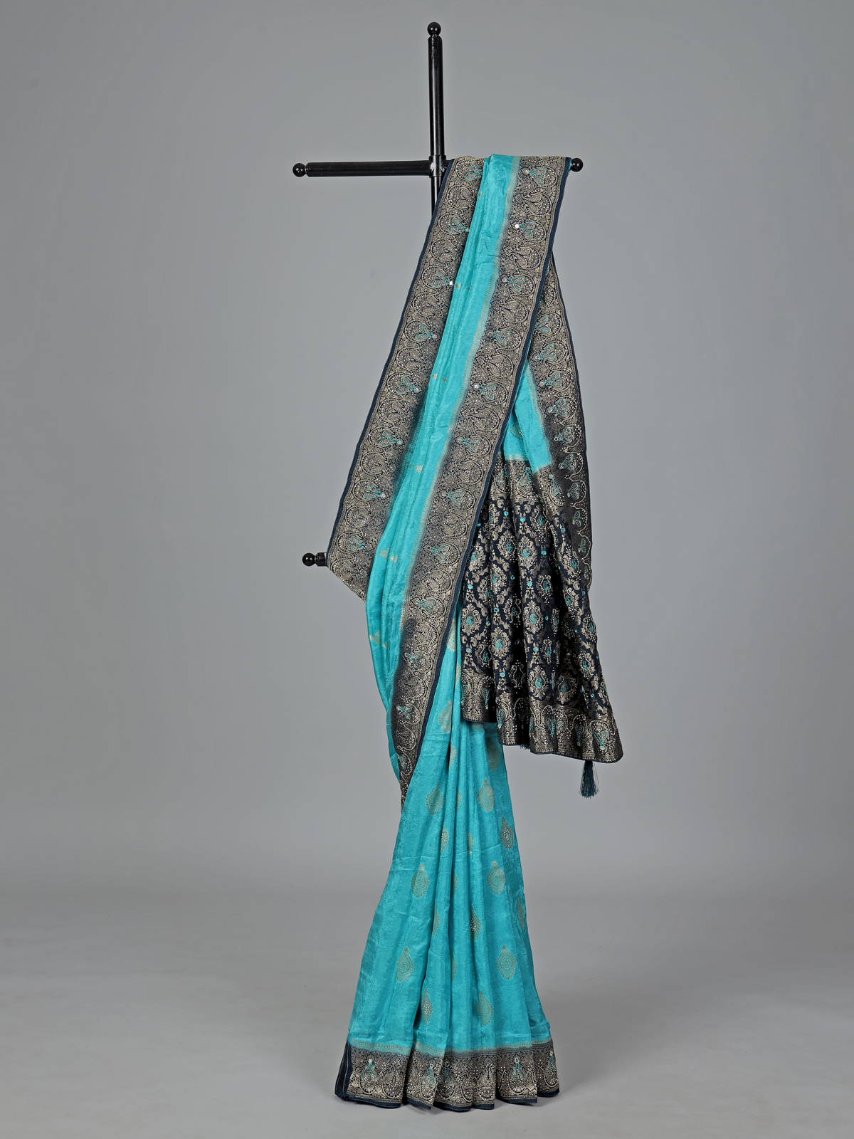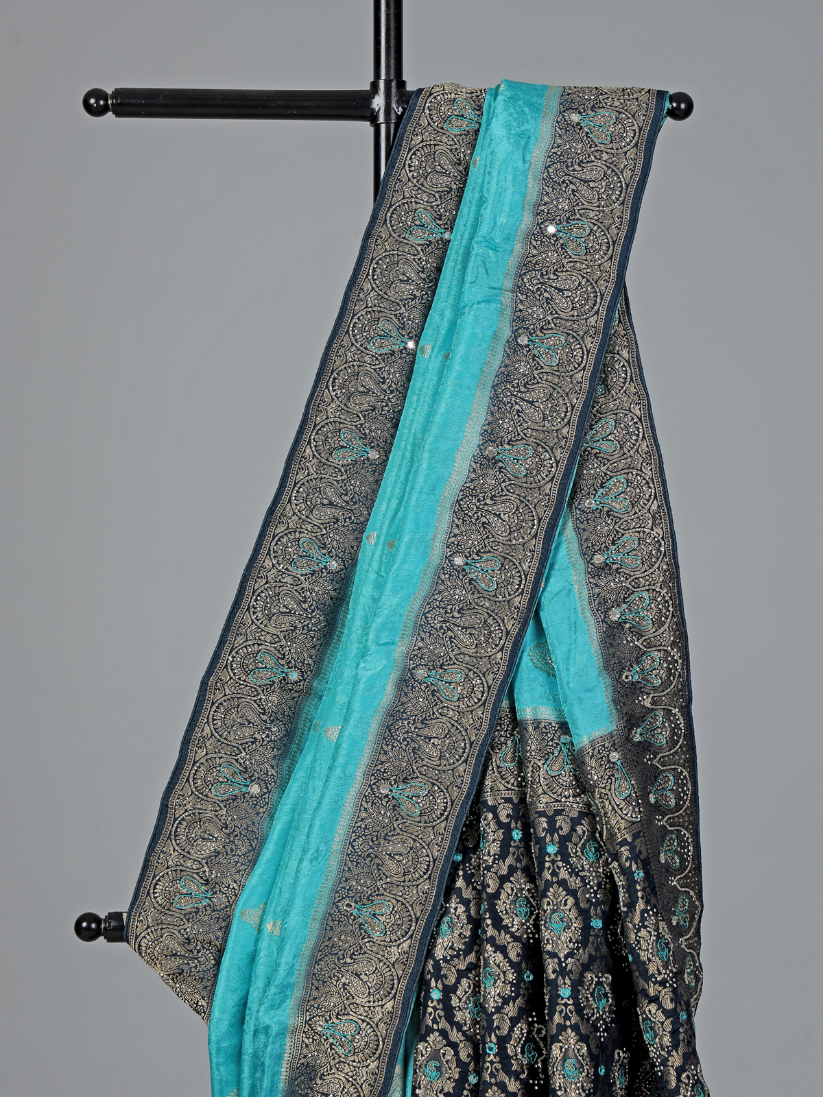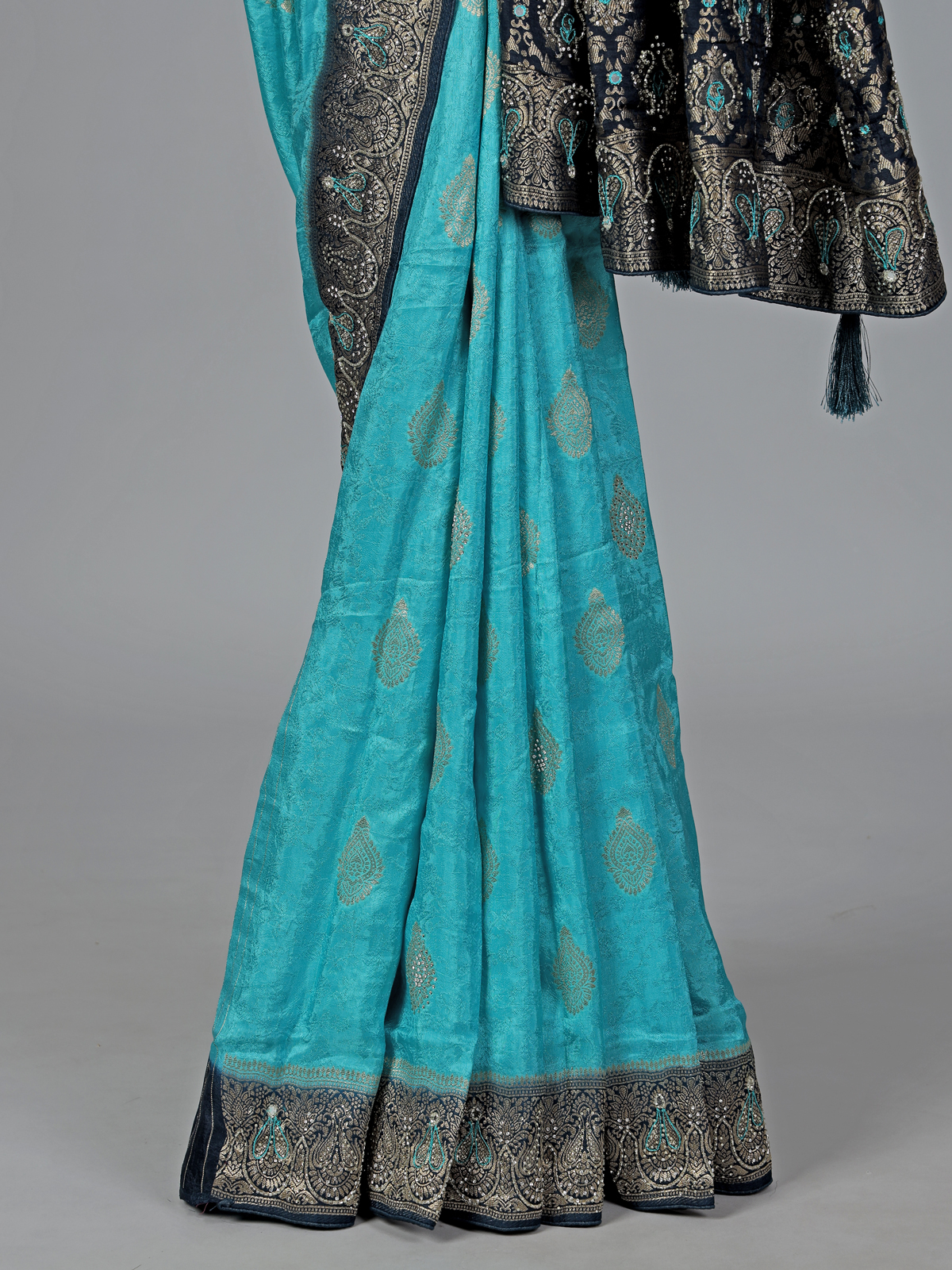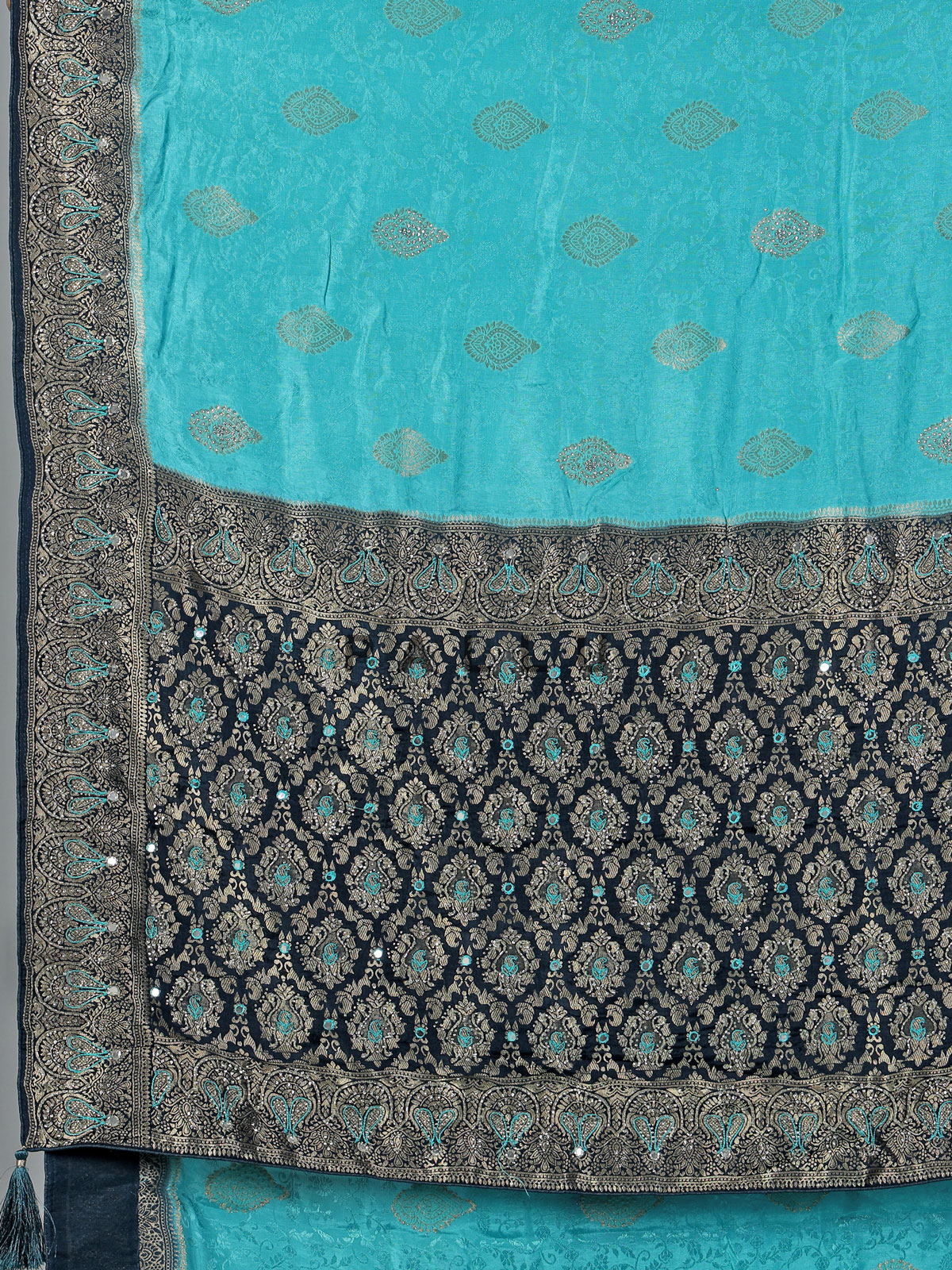 Radiate graceful charm in this aqua blue dola silk saree, enriched with intricate cutdana, sequins, thread, mirror, stone and zari work. The contrast border and pallu enhance its festive elegance. Perfect for weddings and celebrations, it comes with an unstitched blouse piece for a refined finish.