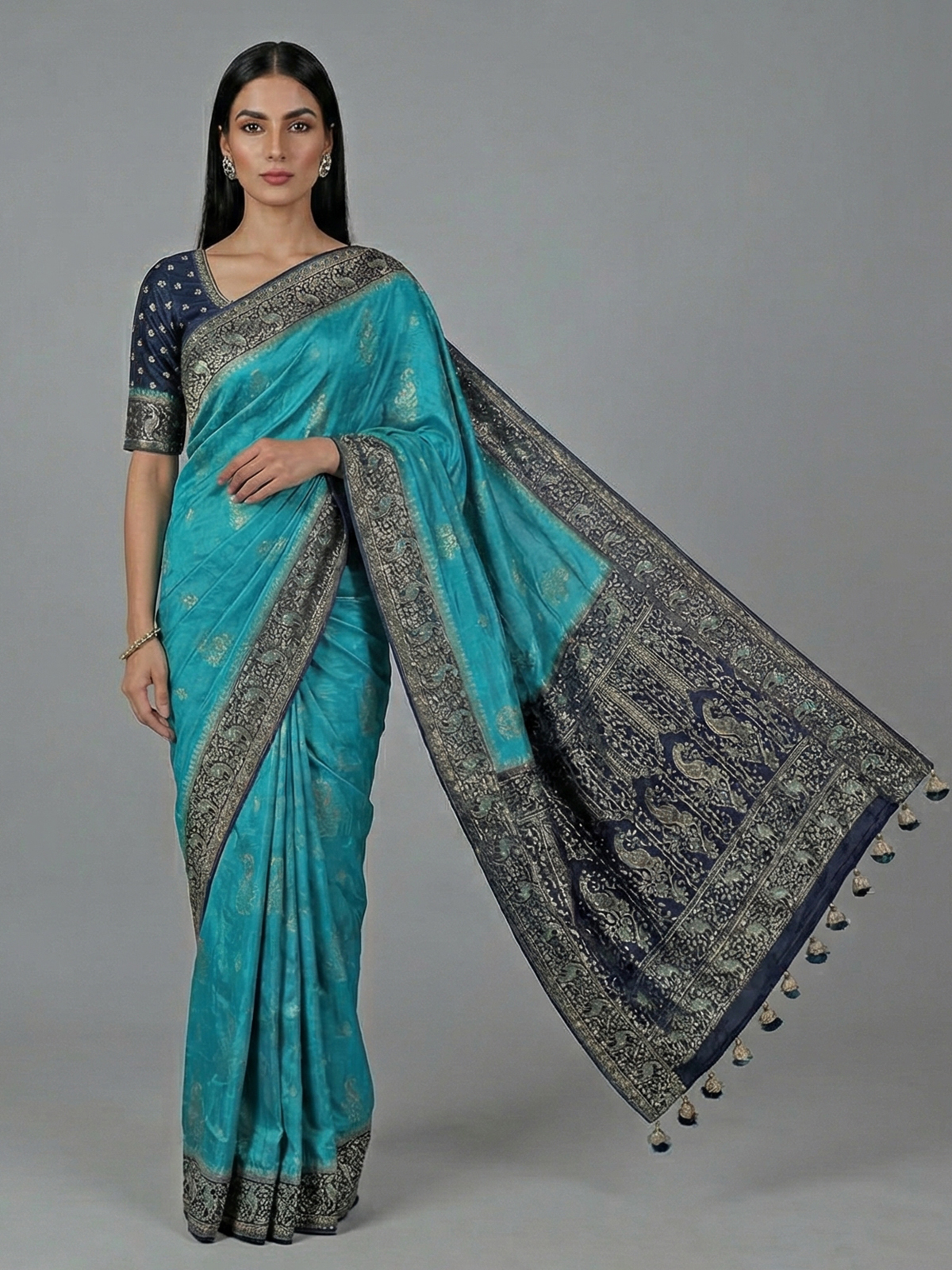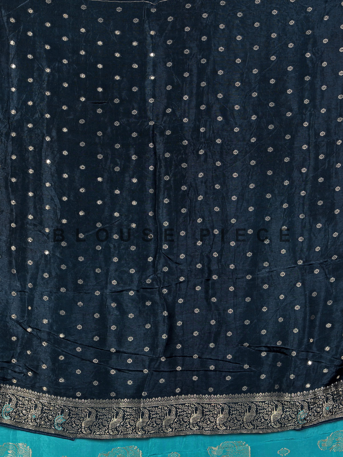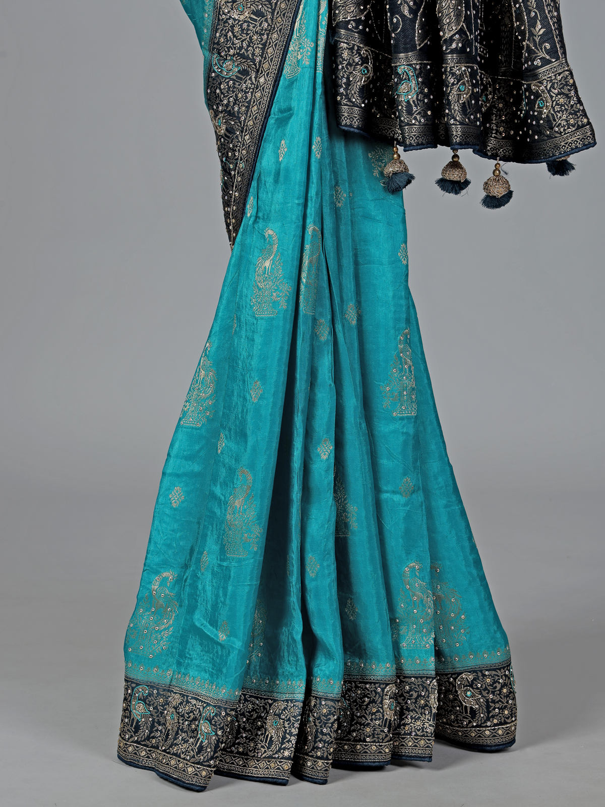 Dazzle in festive brilliance with this aqua blue dola silk saree, richly adorned with cutdana, sequins, thread, mirror, stone and zari work. The contrast border and pallu enhance its radiant charm. Perfect for weddings and celebrations, it includes an unstitched blouse piece for a custom elegant drape.