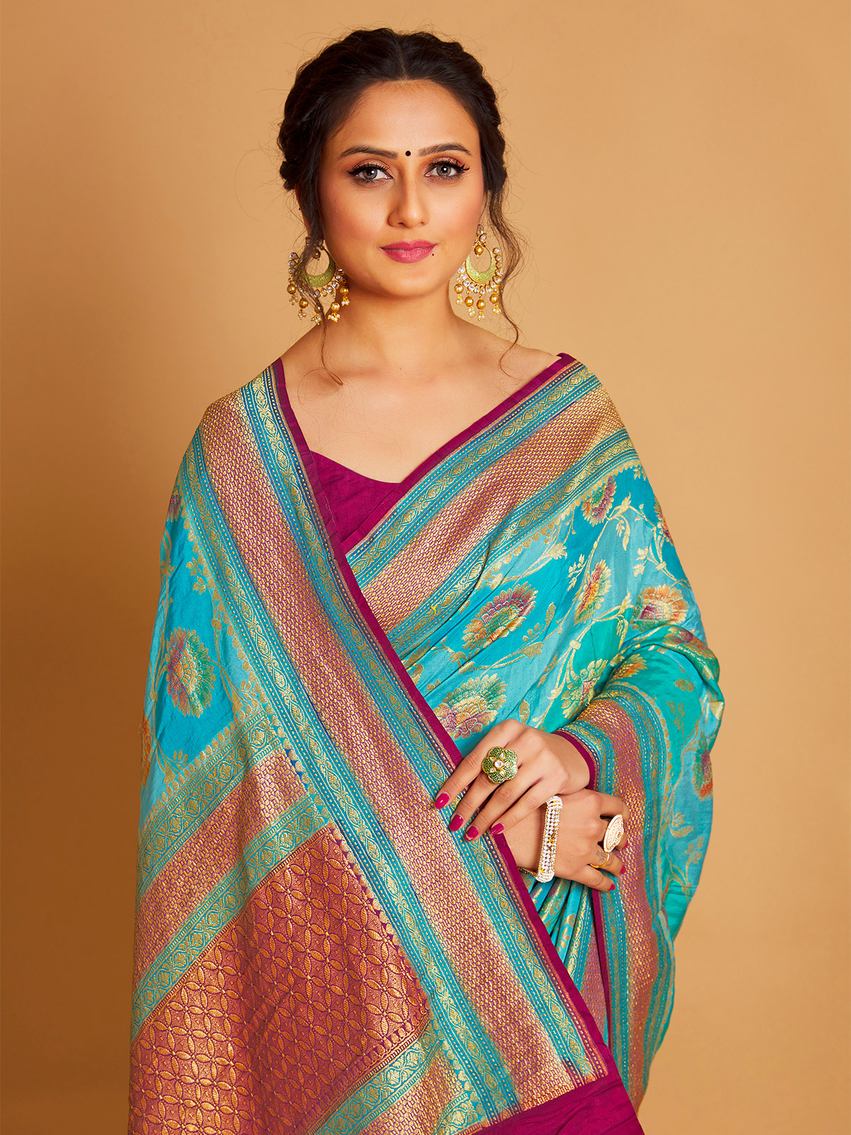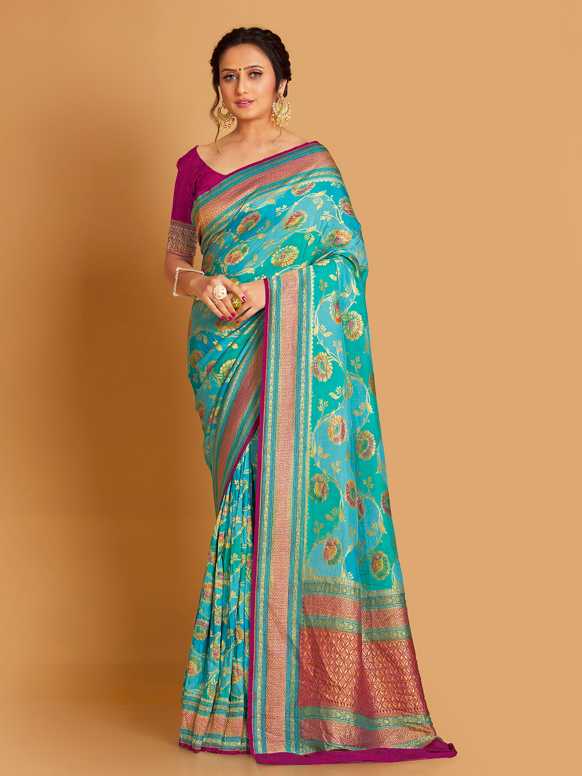 Achieve a trendy wedding look with this comfortable aqua silk saree. The intricate zari work throughout adds a touch of glamour. Comes with an unstitched blouse piece to customize your style.