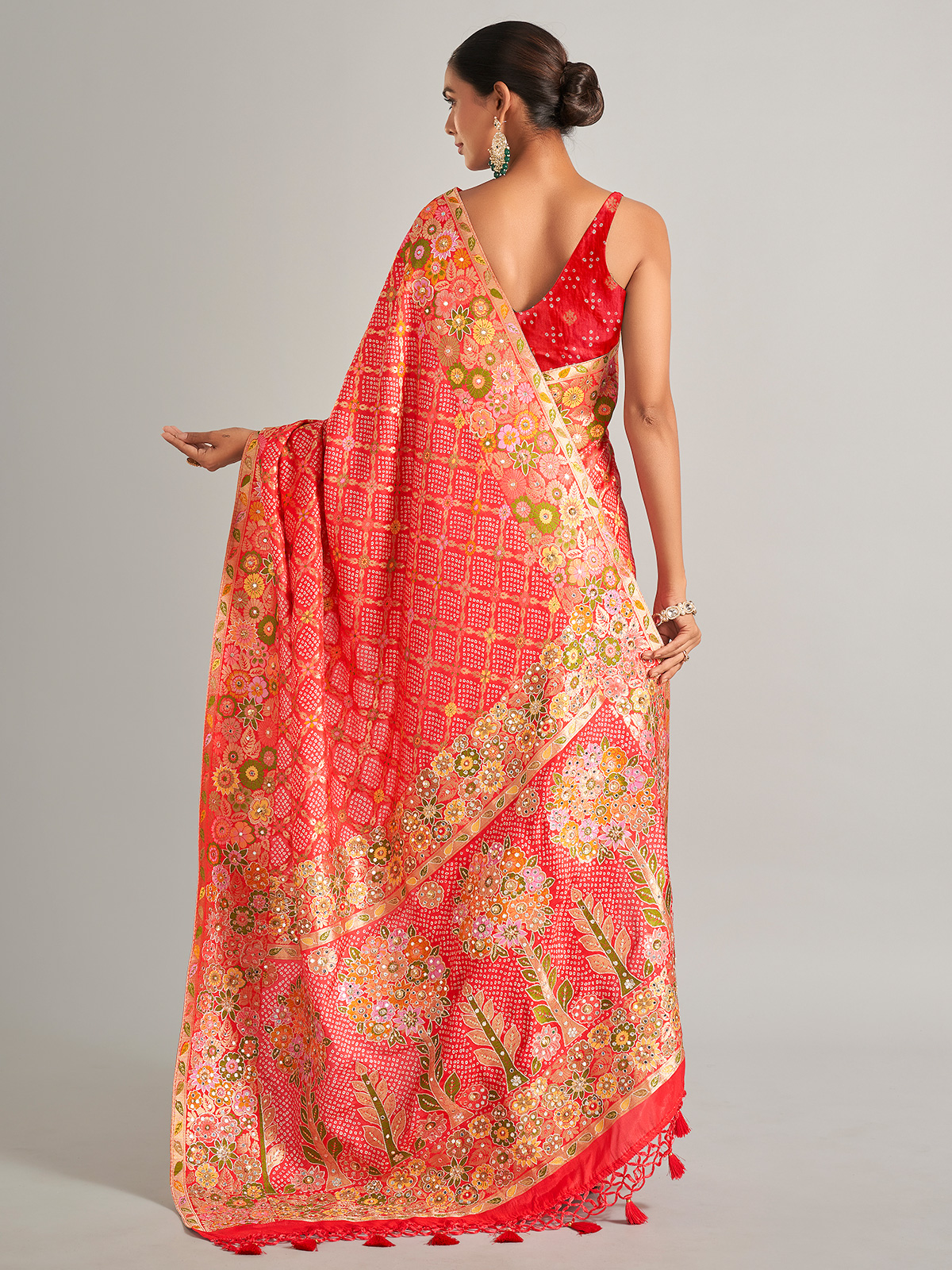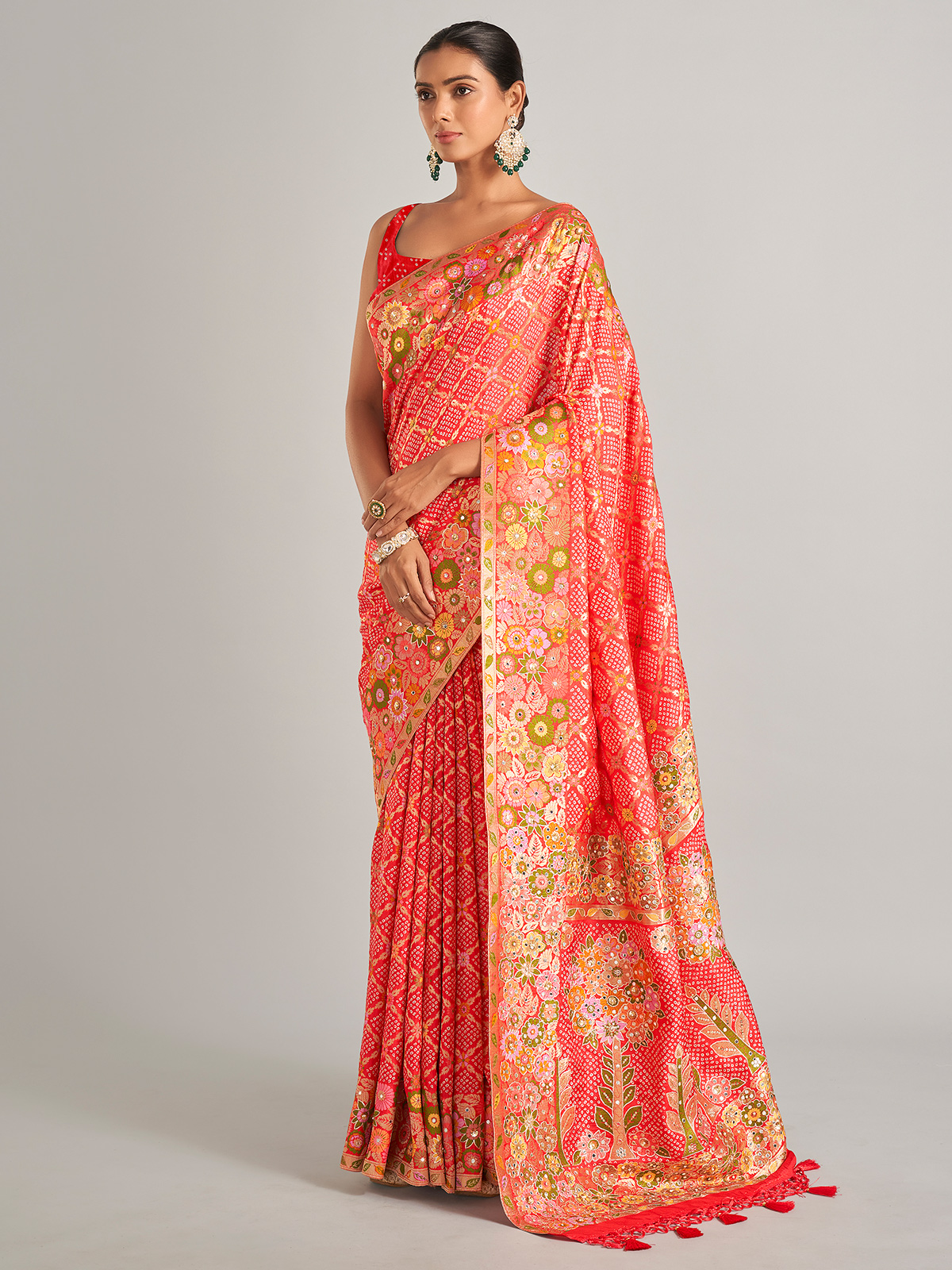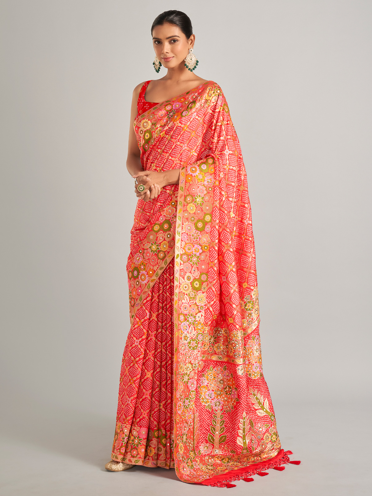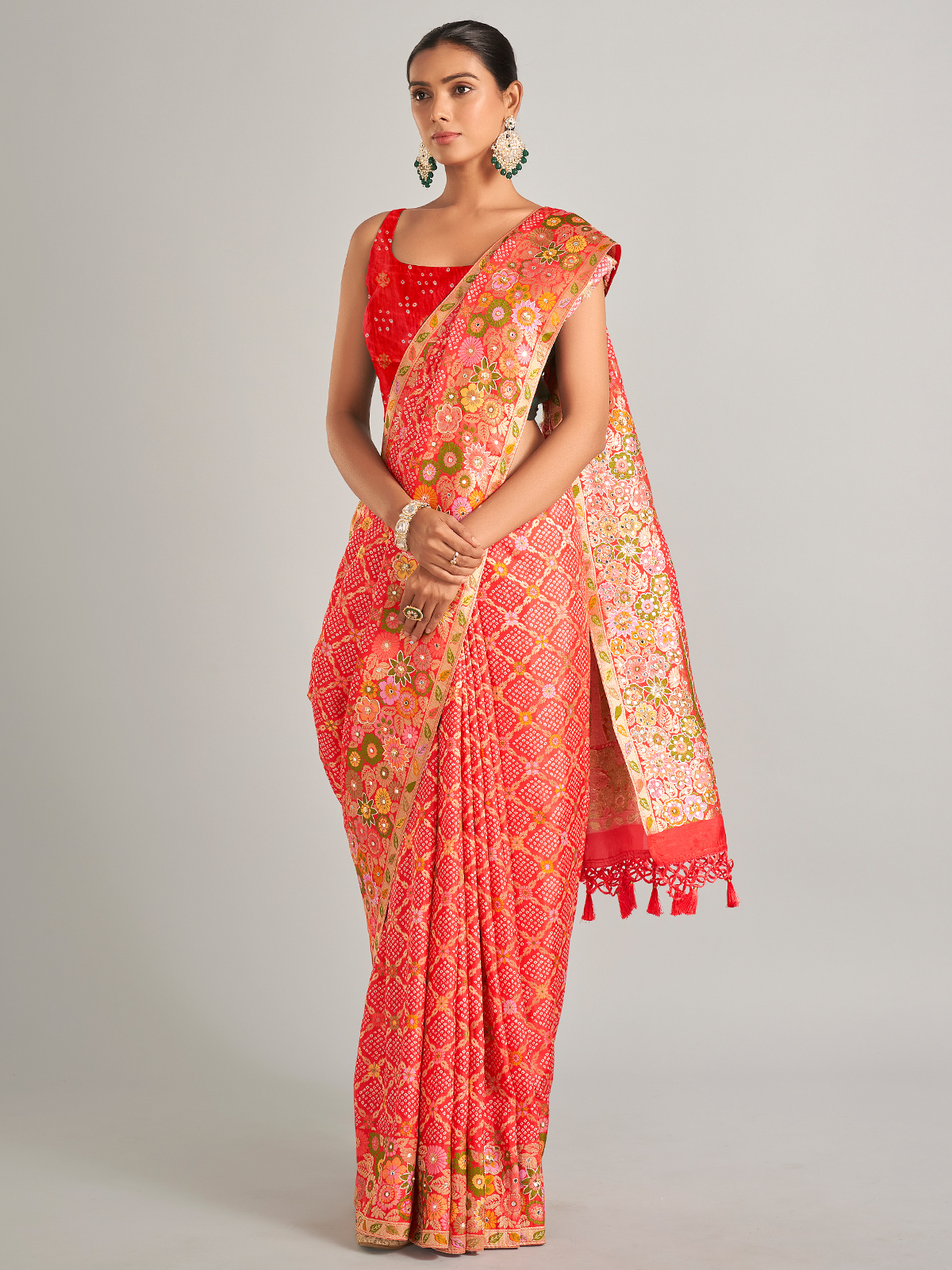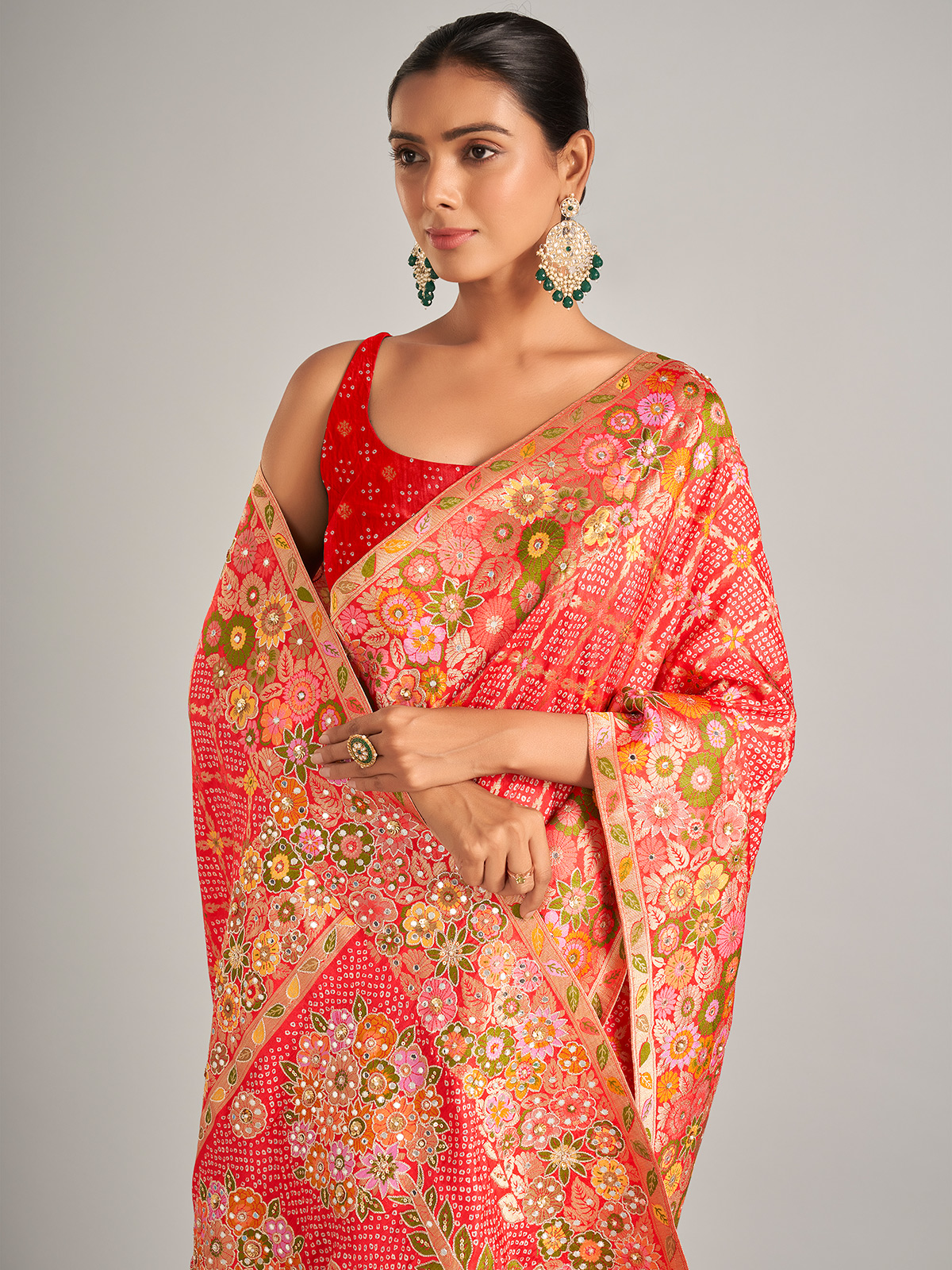 Do not pass up the chance to seem elegant and sophisticated by purchasing this red silk saree. Use zari, beads, sequins, foil, and resham work with a lovely bandhani print to create a traditional look. It comes with unstitched red blouse.