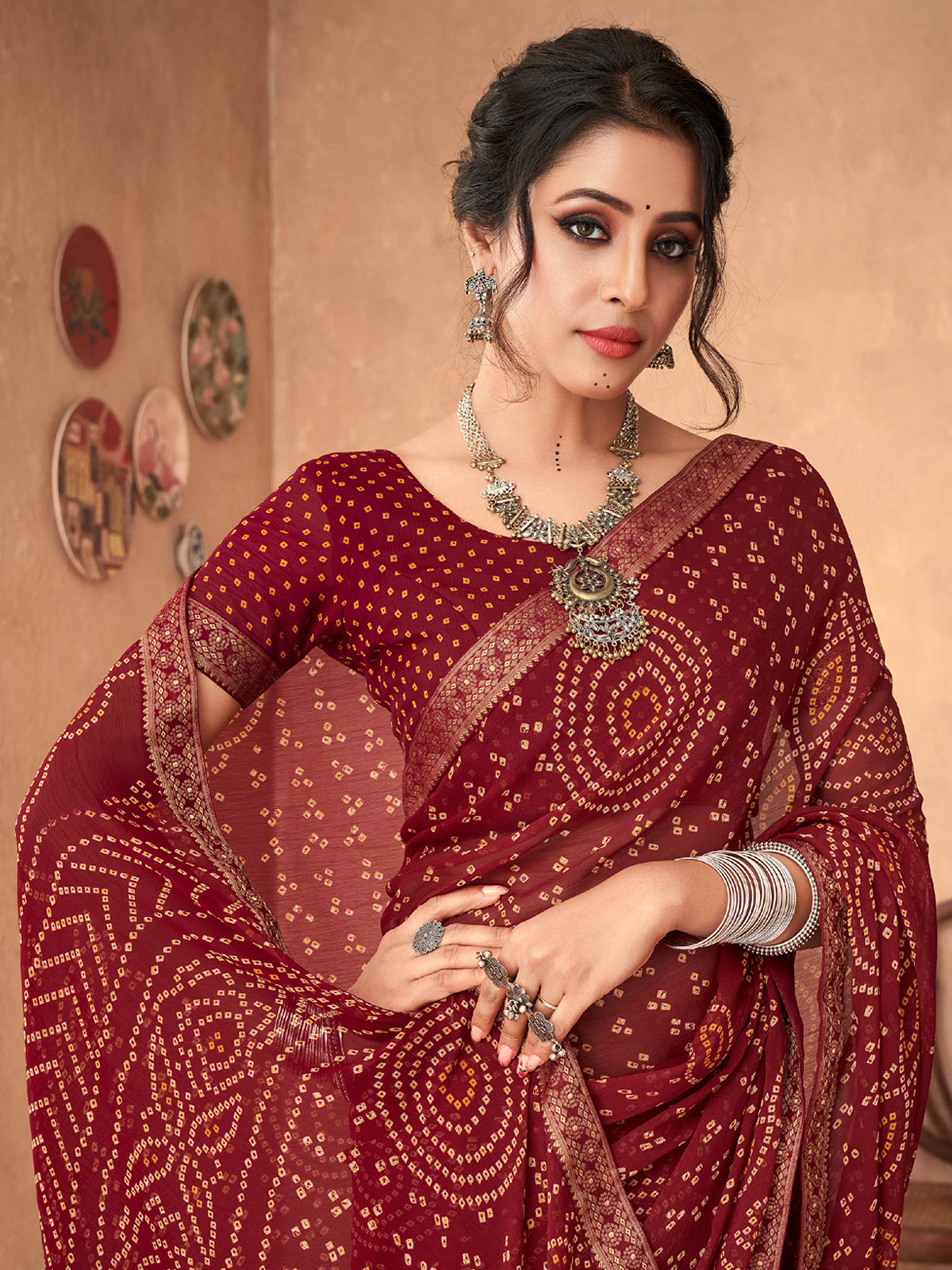 Make a fashion statement with the fabulous maroon chiffon saree, embellished with a bandhani print. Complete with an unstitched blouse piece, it is perfect for casual occasions.