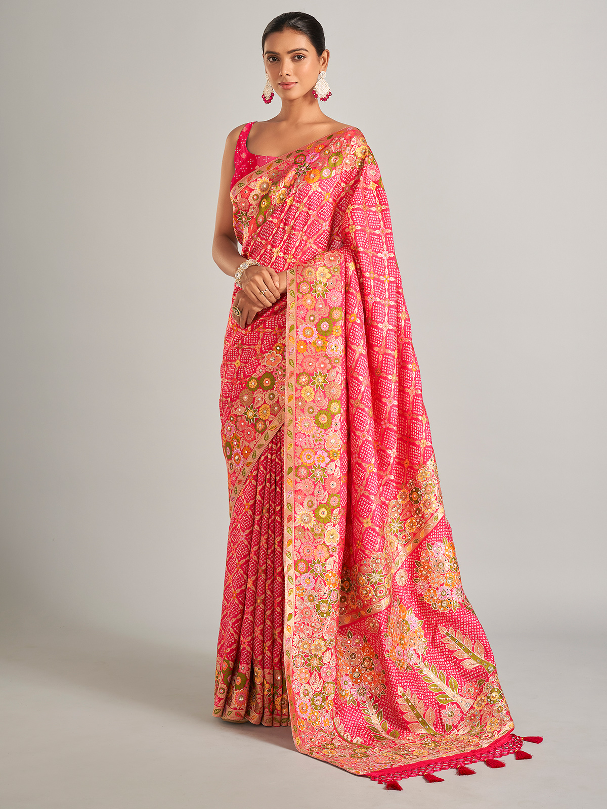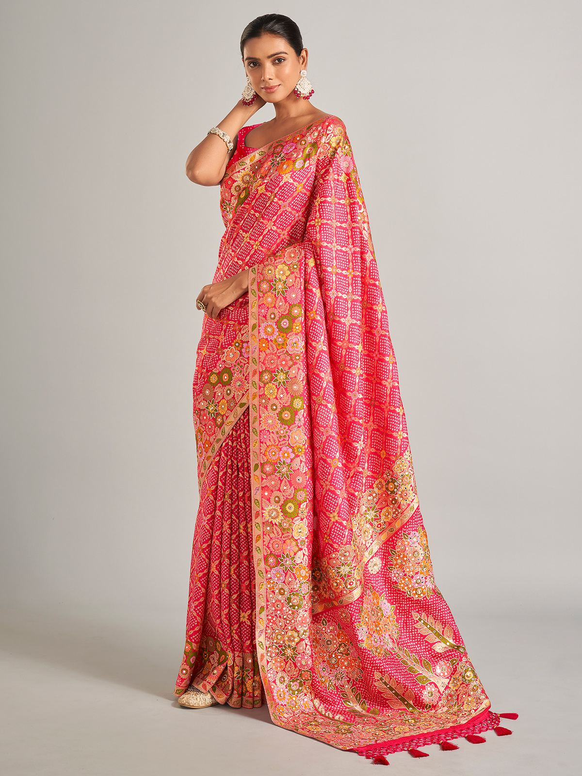 With its bandhani print, this pink silk saree gives you a sophisticated and classic appearance. It is beautifully embellished with foil, resham work, beads, sequins, and zari to give it a more radiant appearance. The unstitched blouse piece is the same color.