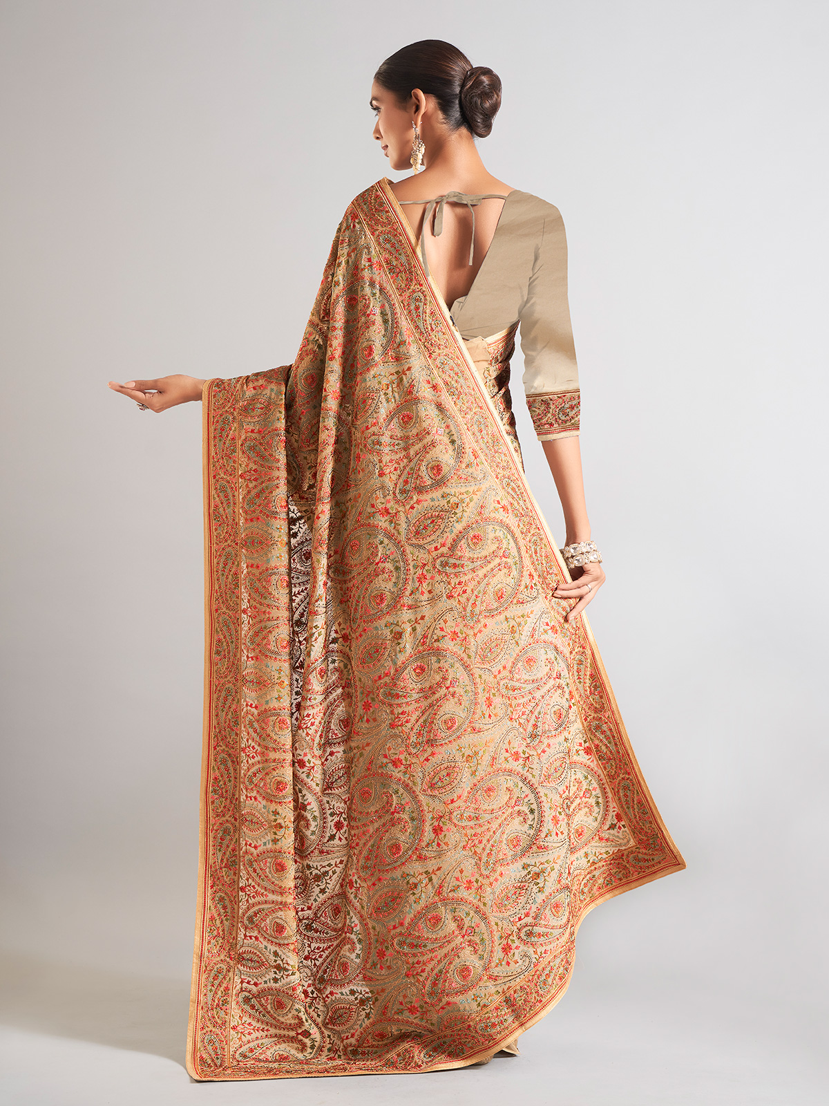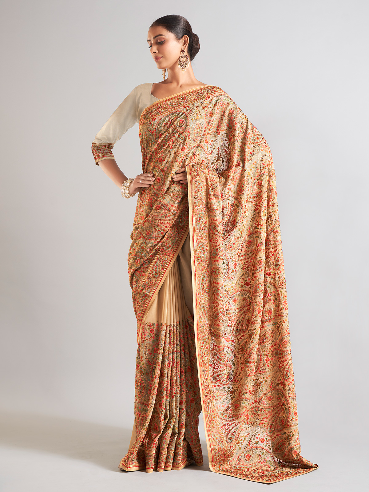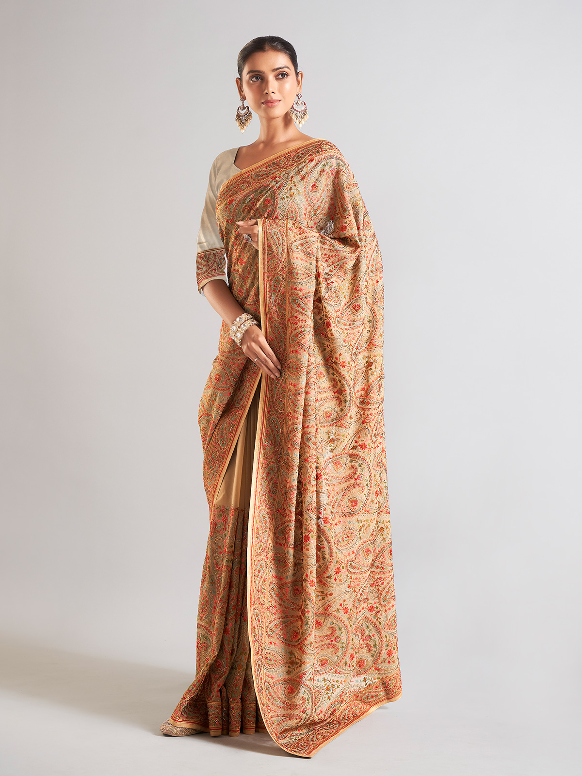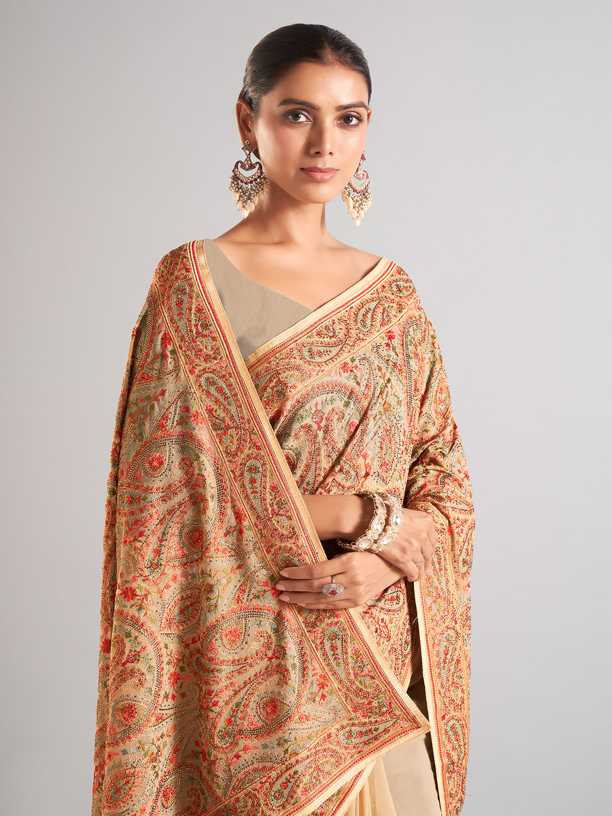 Perfect for weddings, this elegant beige saree is crafted from georgette fabric, featuring lovely embroidery, resham, and stone work. It includes a blouse piece for added convenience.