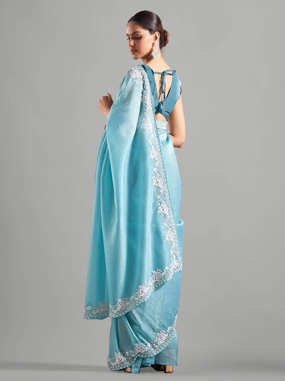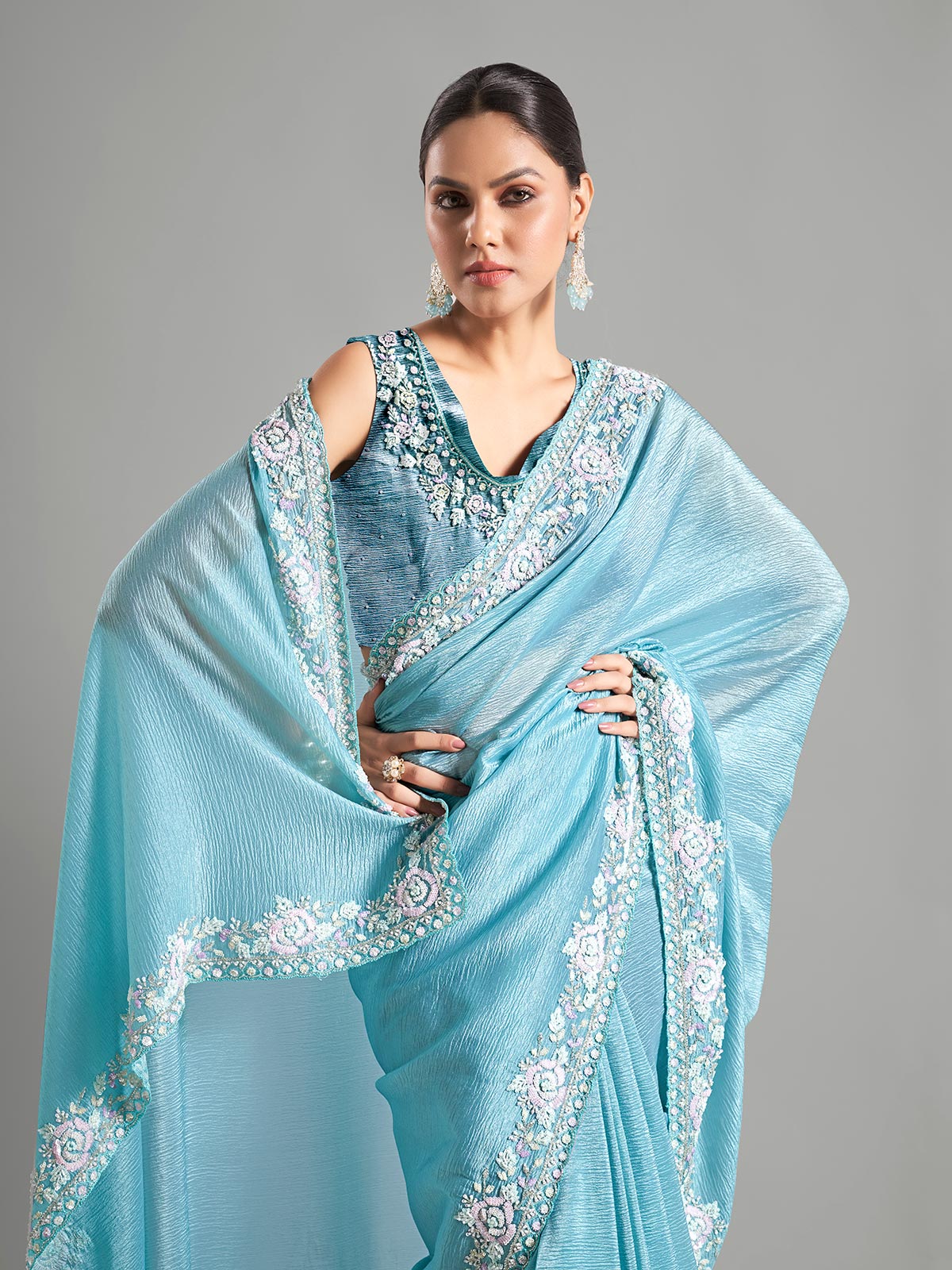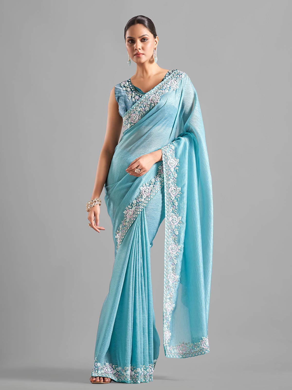 Enhance your wardrobe with this sky blue chiffon saree, intricately embellished with cutdana, sequin, and bead work. It includes an unstitched blouse piece.