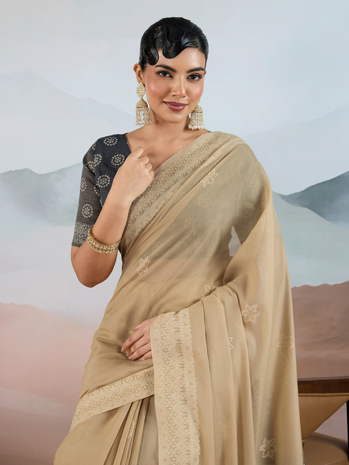 Experience understated elegance with this beige bandhej inspired saree crafted in breathable viscose cotton. Its subtle tone and intricate print make it perfect for both casual and festive occasions. Finished with charming tassels, this saree is ideal for puja wear and summer styling, offering comfort with a sophisticated traditional touch.