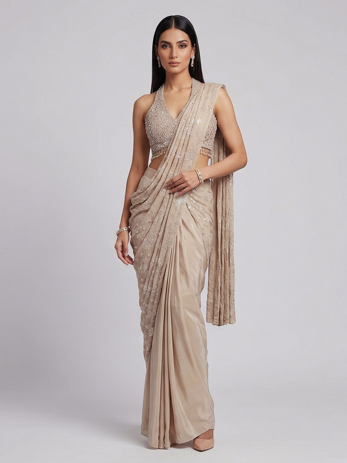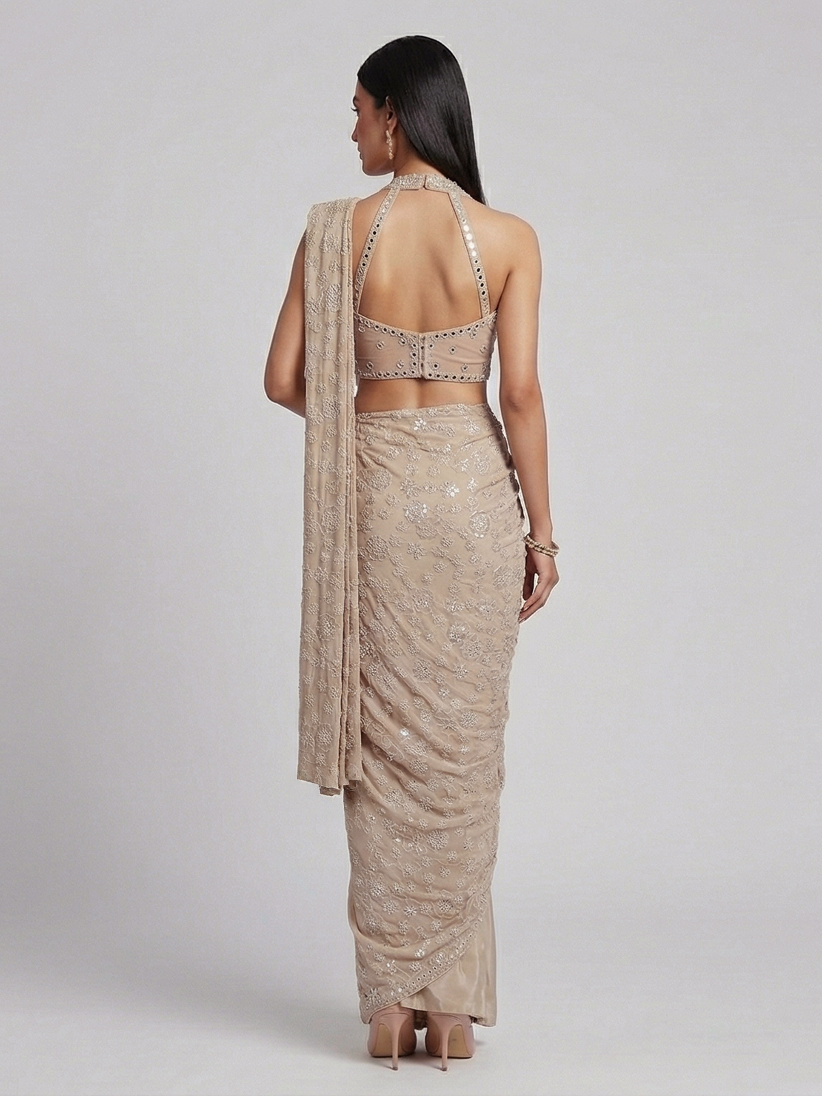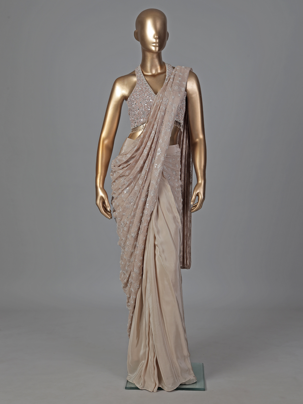 Elegant beige crepe silk enhances the charm of this designer ready to wear saree. Detailed with embroidery, thread, sequins, cutdana, mirror and stone work. It reflects delicate craftsmanship. Ideal for weddings, receptions and party wear. It creates a soft yet luxurious ethnic statement.