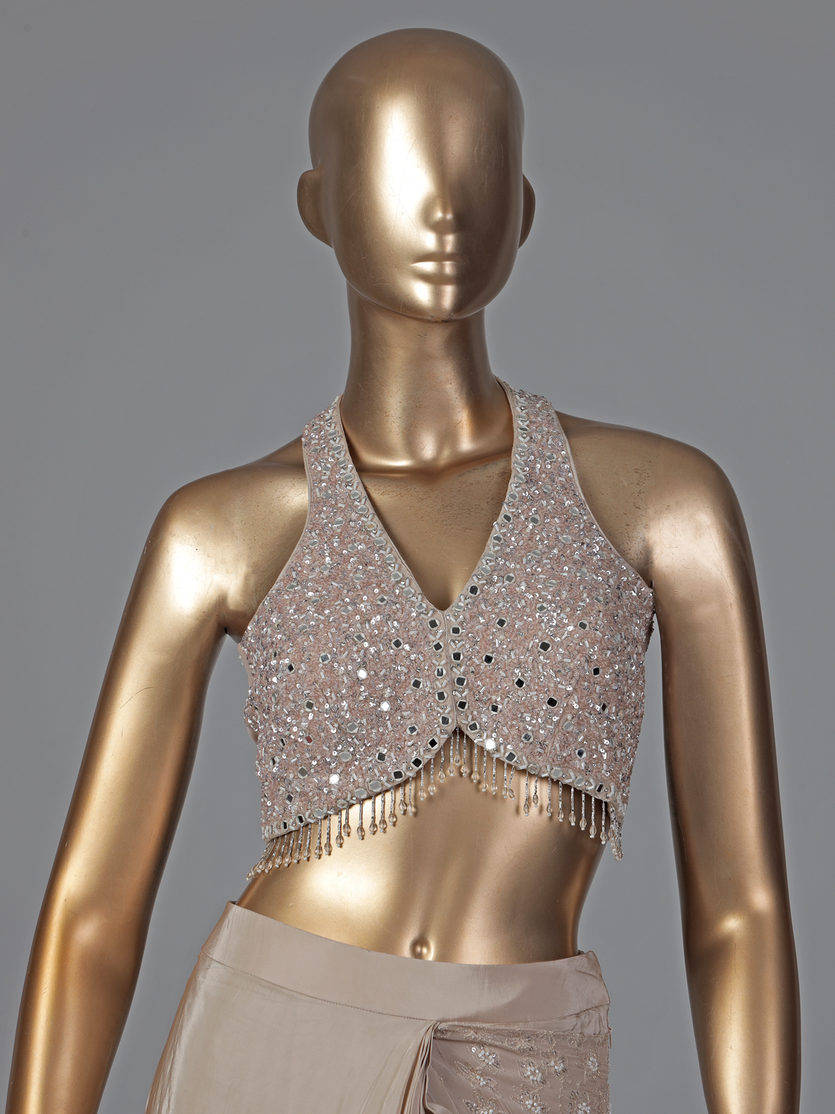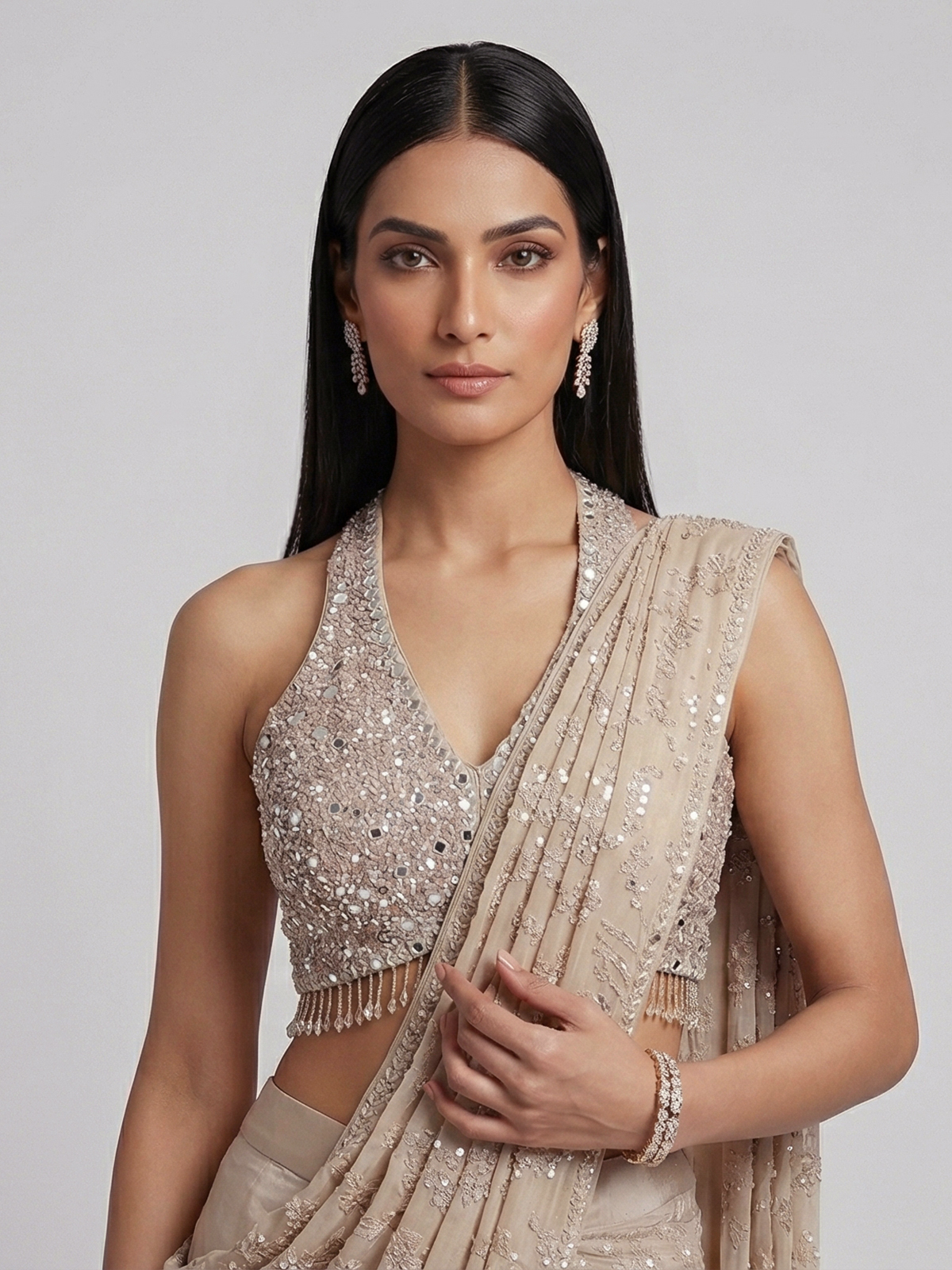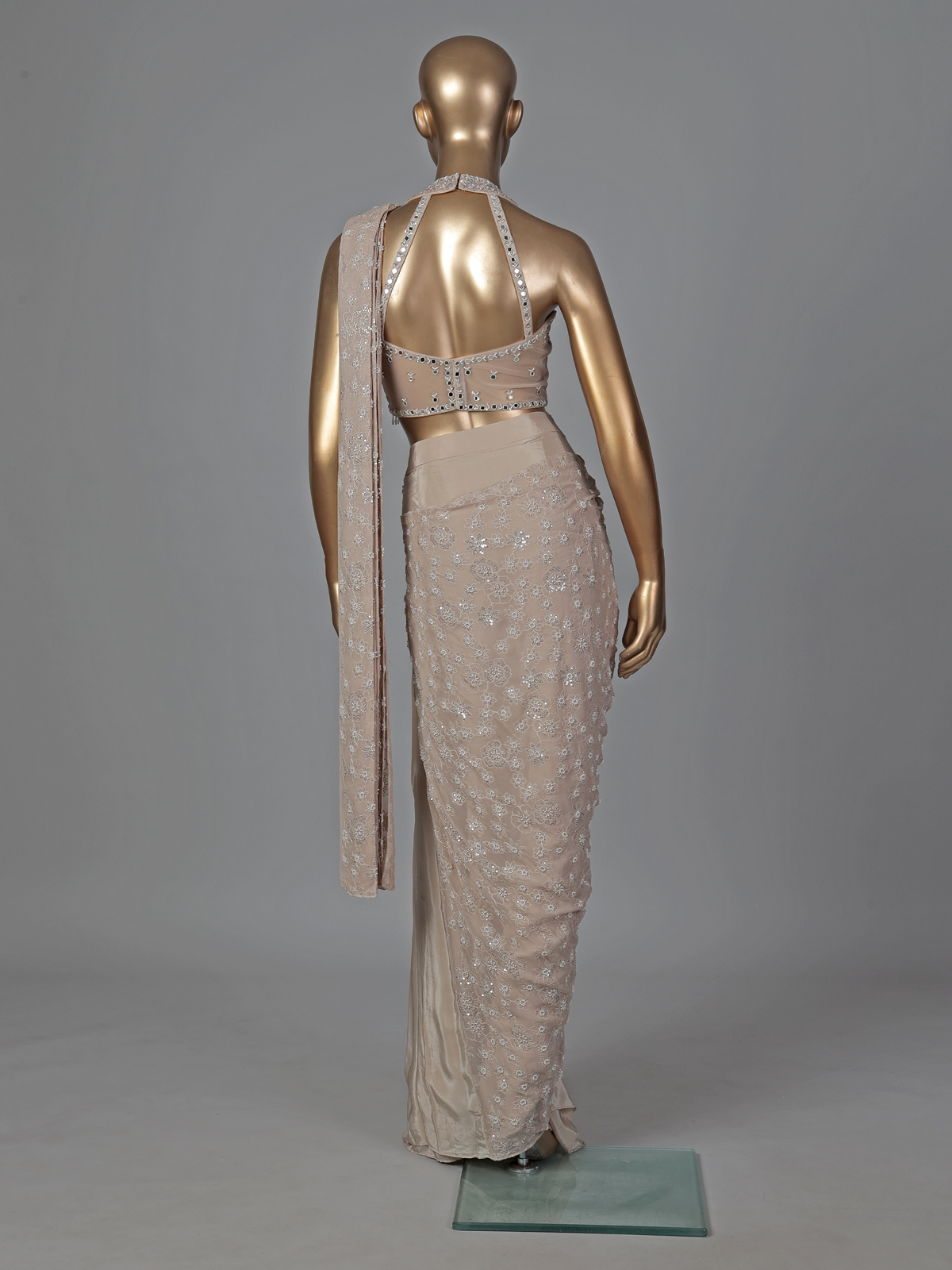 Elegant beige crepe silk enhances the charm of this designer ready to wear saree. Detailed with embroidery, thread, sequins, cutdana, mirror and stone work. It reflects delicate craftsmanship. Ideal for weddings, receptions and party wear. It creates a soft yet luxurious ethnic statement.