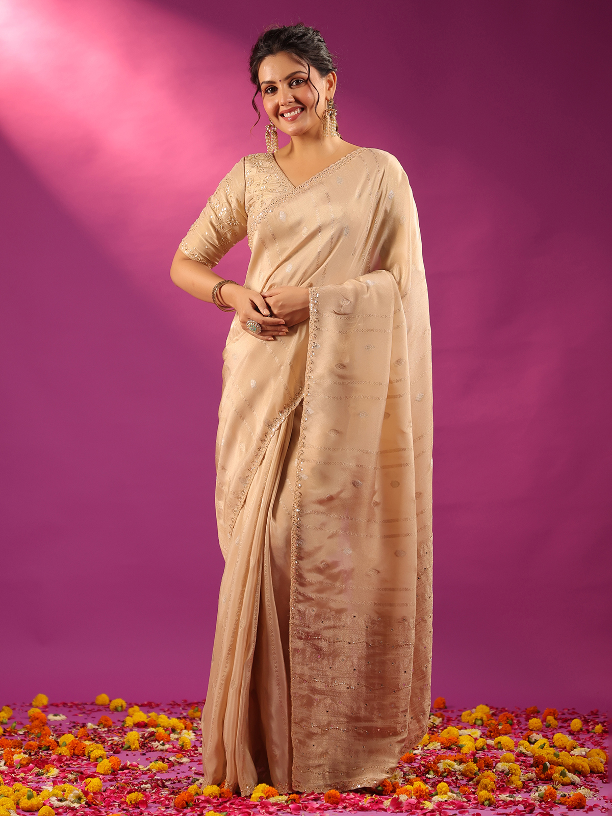Flowing in soft beige silk, this saree radiates timeless sophistication. Adorned with zari, sequins, cutdana, aabla, and pearls, each embellishment sparkles with delicate grace. Comes with an unstitched blouse piece, perfect for weddings, festive gatherings, and joyous celebrations.
