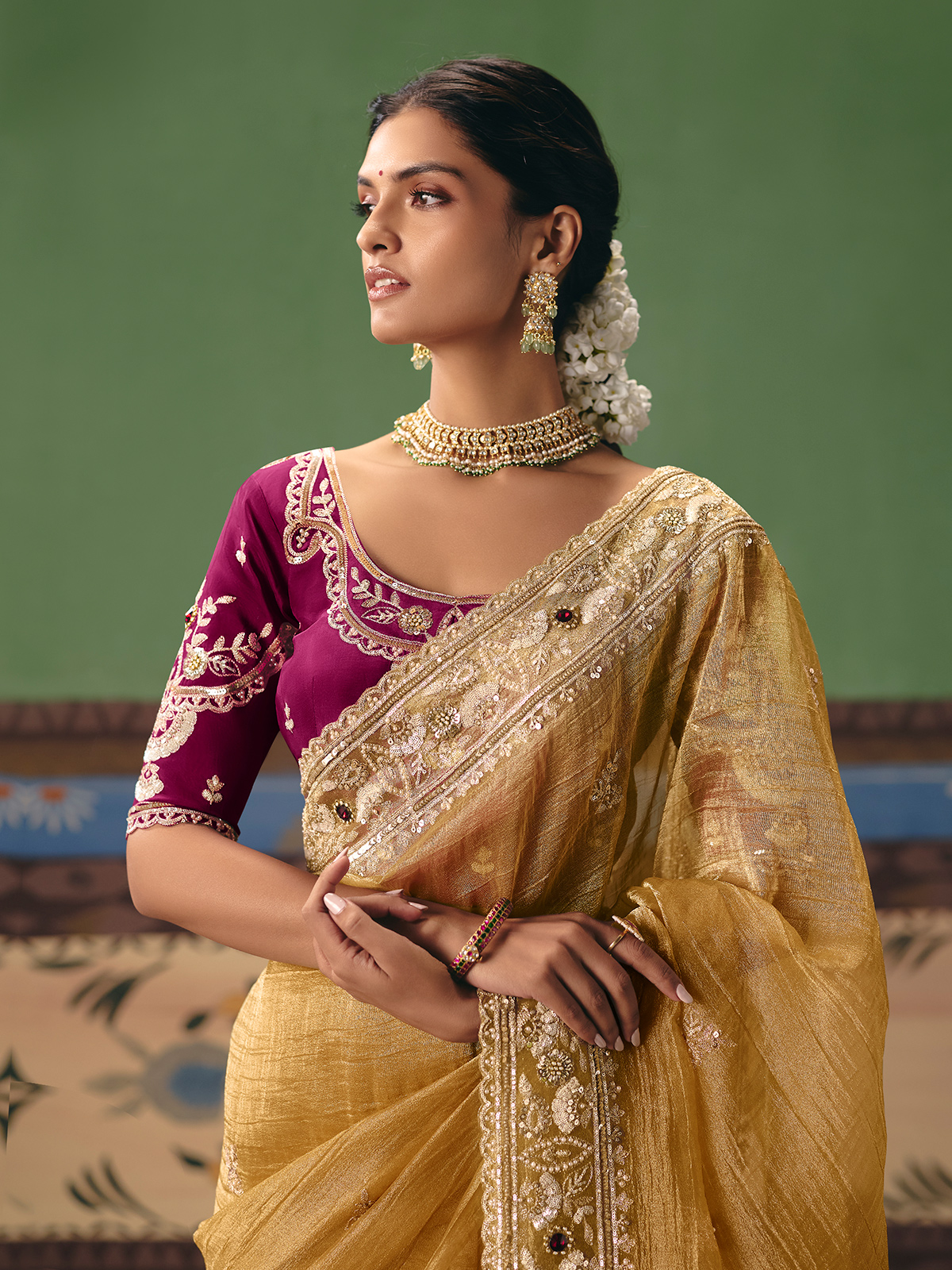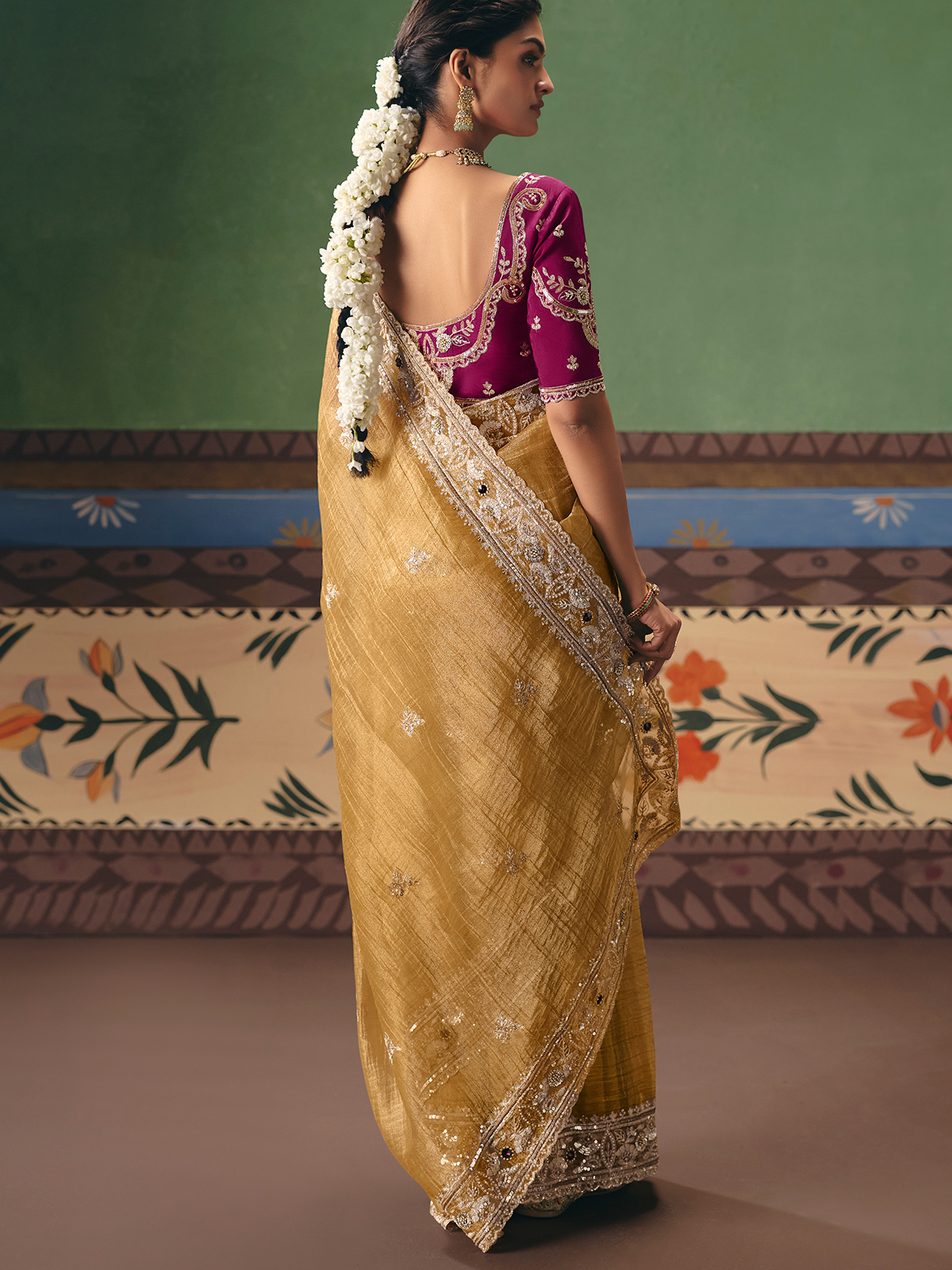 Showcase understated elegance at festive celebrations with this beige fancy silk saree. The neutral tone is elevated by shimmering borders richly decorated with resham, sequins, diamond, and beadwork. A contrast maroon unstitched blouse introduces a bold pop of color, making the ensemble perfect for standout occasions.