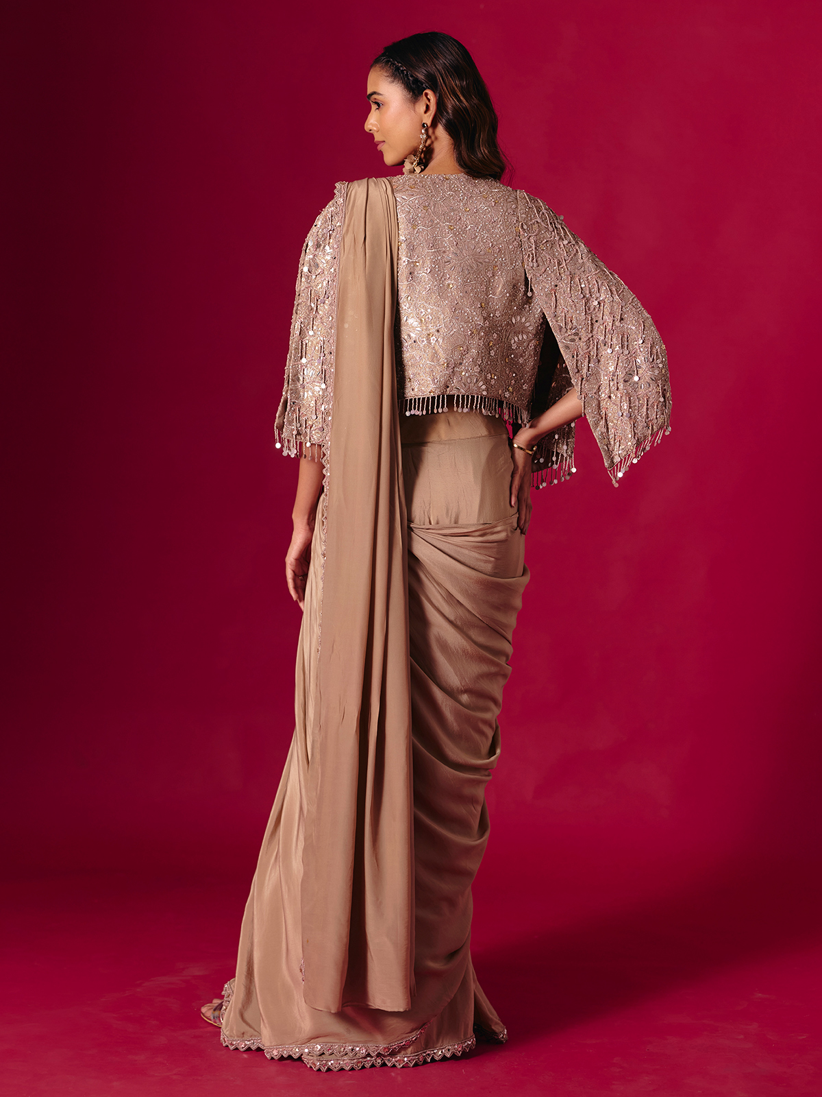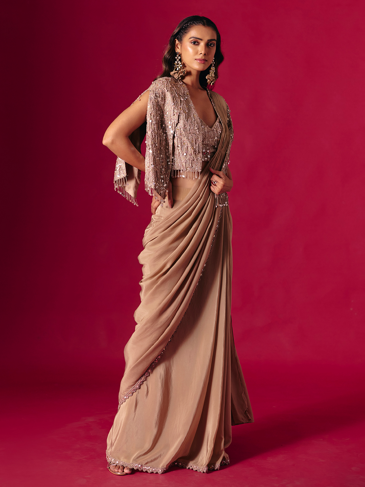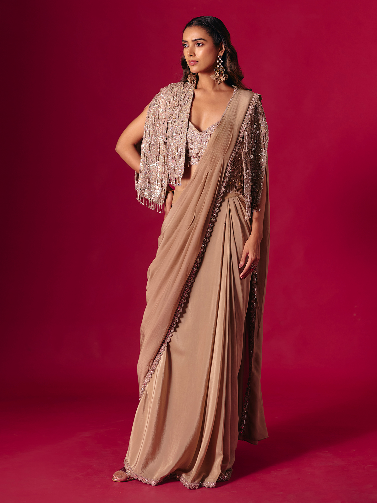 This beige lycra ready to wear saree features resham, sequins, beads and diamond accents for a sophisticated festive appeal. Designed for effortless draping, it brings a polished finish ideal for reception and party wear, balancing subtle luxury with graceful modern styling.